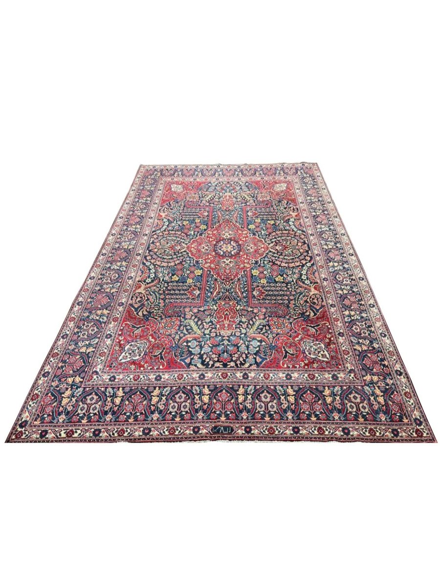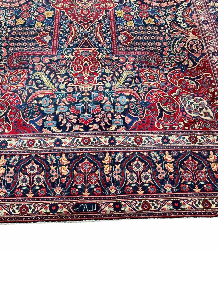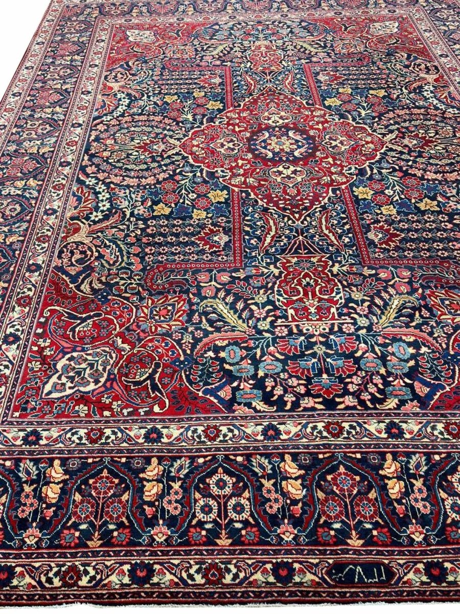 Decorate your space with the striking beauty of this 10x14 Old Persian Tabriz area rug. Handmade in Persia from wool, the magnificent rug showcases a commanding central medallion design. The background presents a beautiful, deep navy blue tone, providing the classic backdrop to the intricate design. Rich and elaborate design, featuring floral motifs, has a color palette of red, light blue, warm beige, gold, pink, and green. This generously sized piece is perfect for anchoring spacious bedrooms, living rooms, or dining areas. Crafted with traditional hand-making techniques, this wool rug offers enduring durability and a soft touch underfoot. Enjoy the convenience of free and fast delivery within the United States.