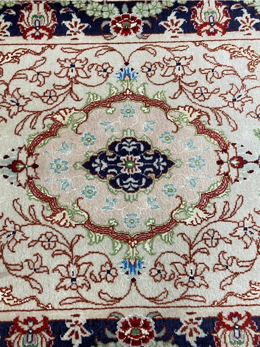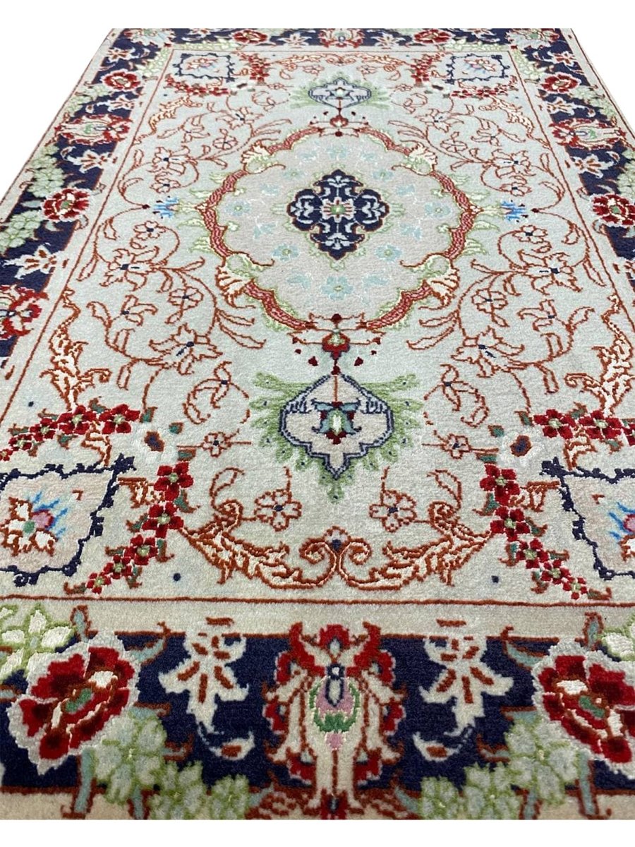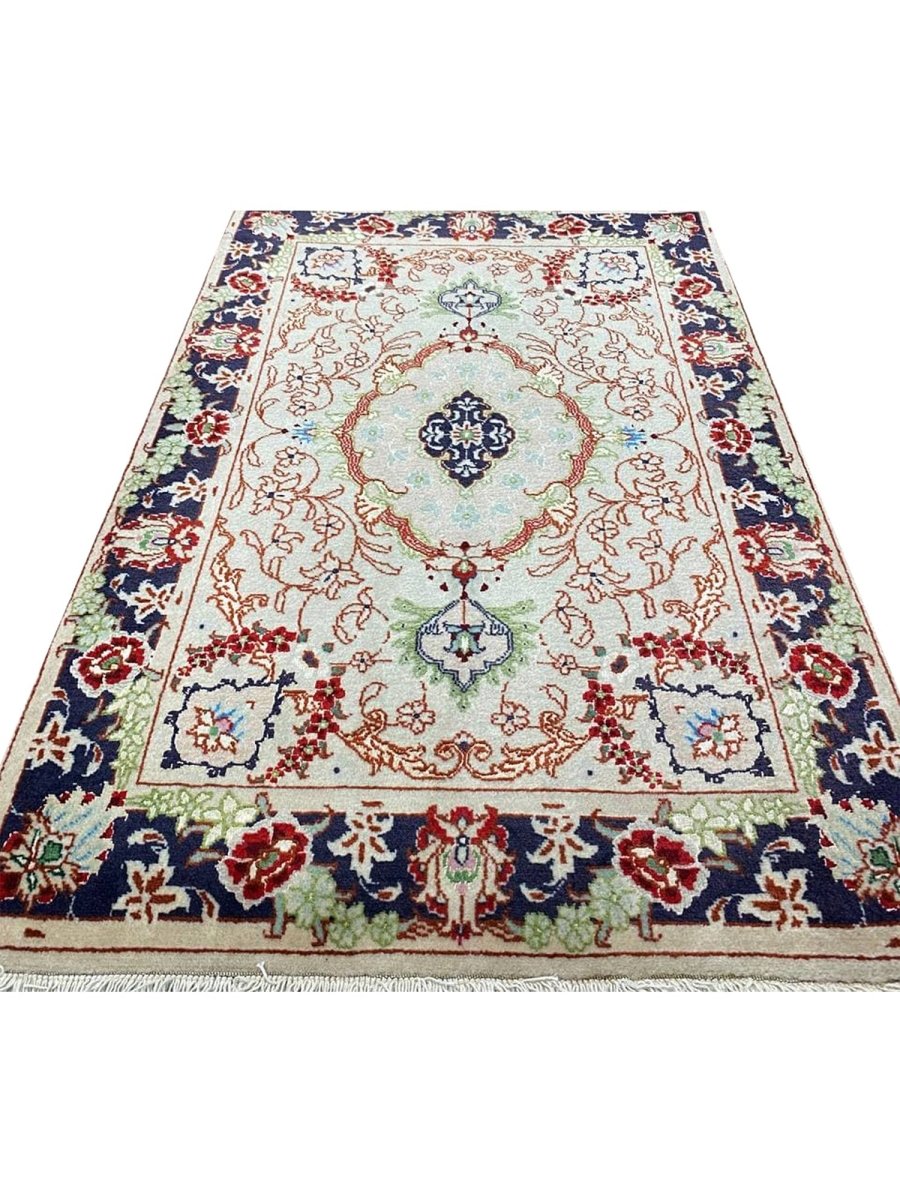 Immerse your space in the exquisite artistry of this magnificent 2x3 Persian Tabriz rug. Hand-knotted by skilled artisans in Tabriz, Persia, this piece exemplifies the enduring beauty and intricate craftsmanship for which Tabriz rugs are renowned. The detailed medallion motifs and harmonious color palette, featuring cream, red, blue, green, and subtle gold, create an atmosphere of timeless elegance and charm. This is perfect for elevating your entryways or beside any furniture. Crafted from premium wool, this rug offers both durability and a soft, inviting texture. This rug is a true testament to Persian weaving tradition, promising to be a cherished addition to any room. Shop now to benefit from free and fast delivery in the United States.