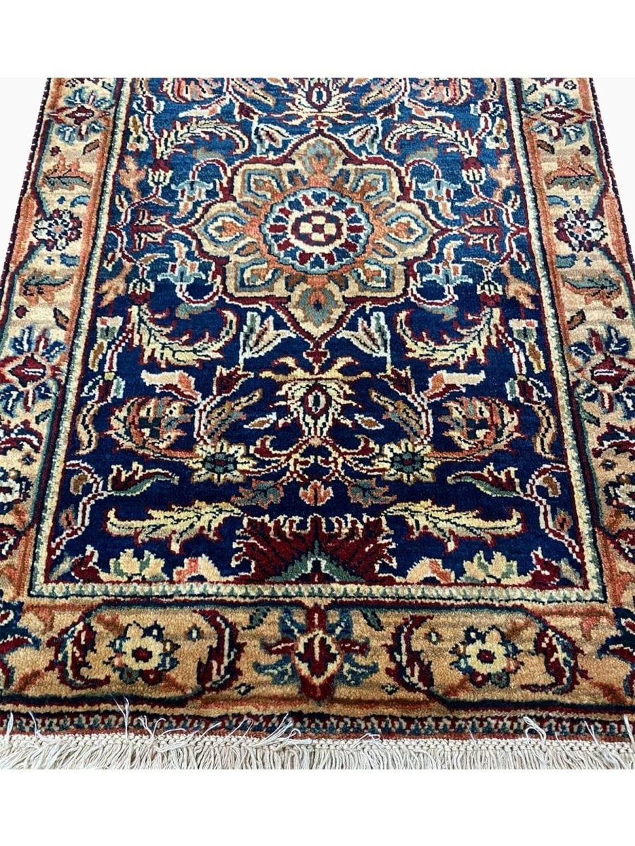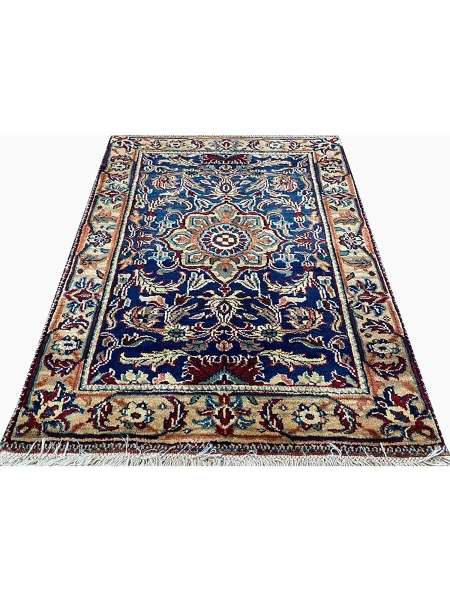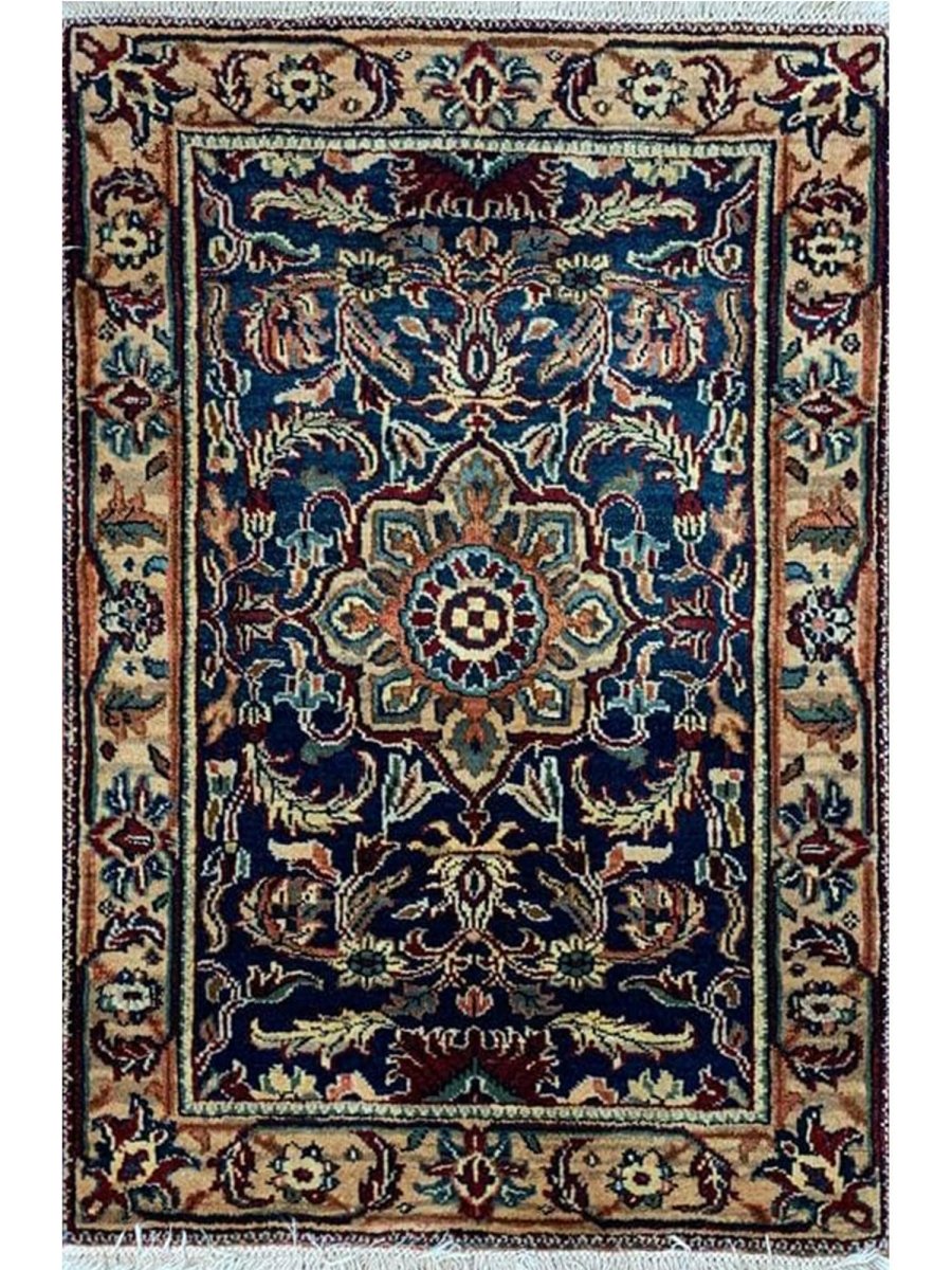 Add rich artistry to your small space with this 2x3 handwoven Mughal-style area rug. Crafted in India using hand-weaving techniques, this charming rug features a prominent central medallion pattern. The detailed medallion is set against a deep blue field, creating a striking contrast. The design throughout incorporates intricate floral and geometric motifs surrounding the central element. A beautiful border in lighter tones of beige and gold frames the piece. Colors within the pattern include soft beige, warm gold, hints of red and pink, as well as subtle light blue, adding complexity. Made from durable materials, this rug offers lasting beauty and a pleasant feel underfoot. This Mughal-style rug from India is a delightful piece of craftsmanship. Enjoy free US shipping.