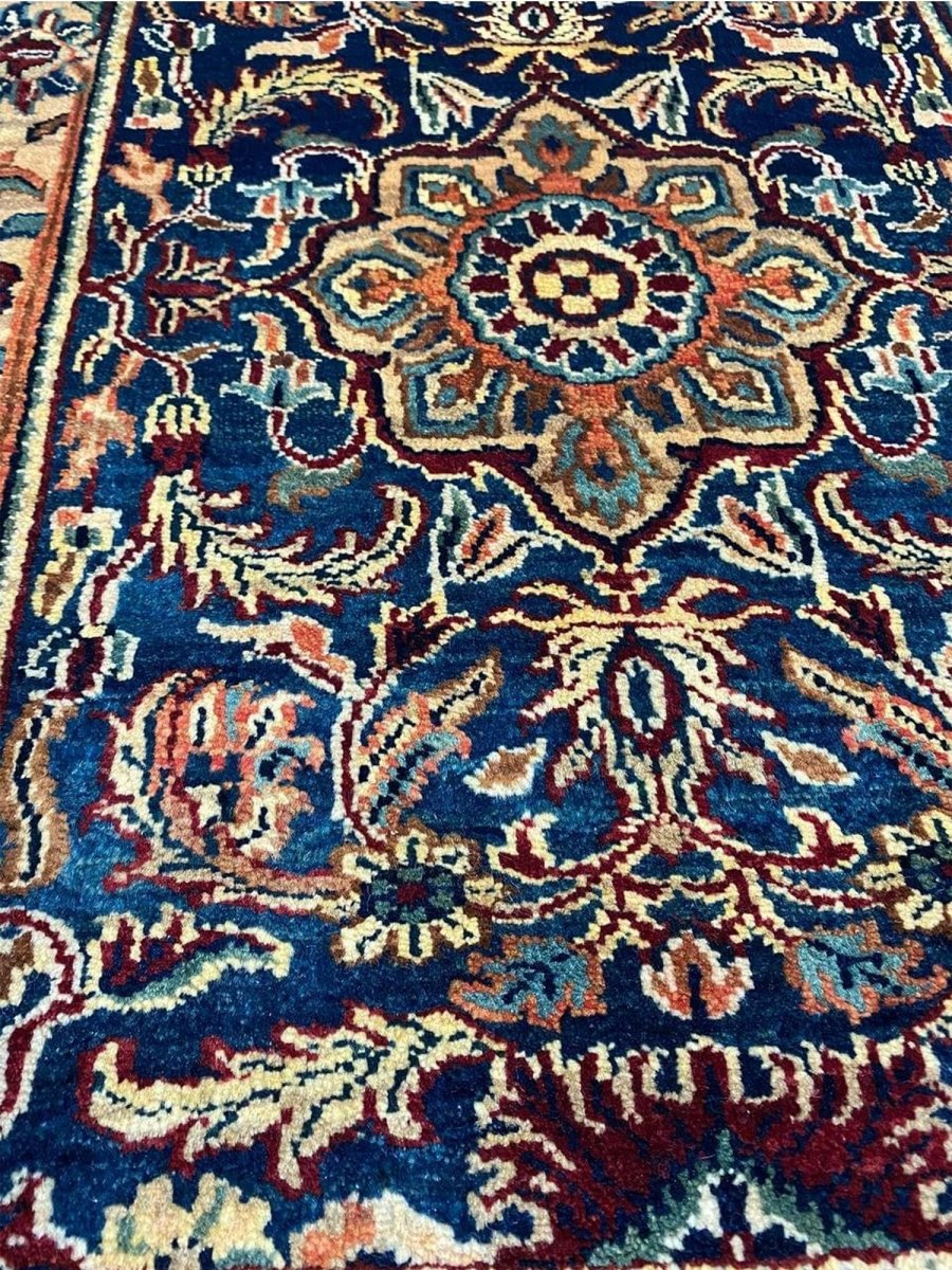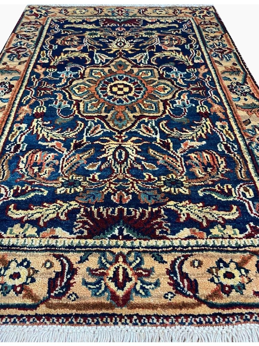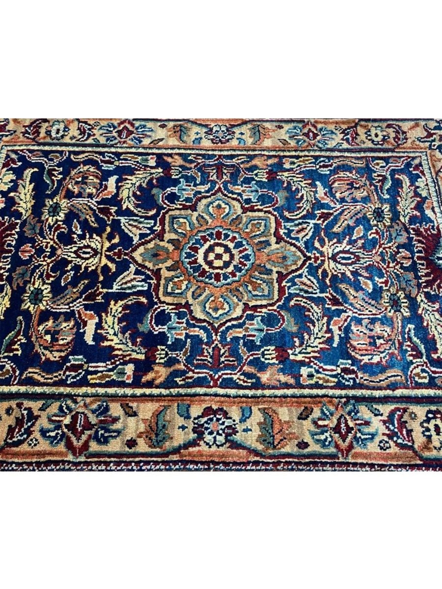 Add rich artistry to your small space with this 2x3 handwoven Mughal-style area rug. Crafted in India using hand-weaving techniques, this charming rug features a prominent central medallion pattern. The detailed medallion is set against a deep blue field, creating a striking contrast. The design throughout incorporates intricate floral and geometric motifs surrounding the central element. A beautiful border in lighter tones of beige and gold frames the piece. Colors within the pattern include soft beige, warm gold, hints of red and pink, as well as subtle light blue, adding complexity. Made from durable materials, this rug offers lasting beauty and a pleasant feel underfoot. This Mughal-style rug from India is a delightful piece of craftsmanship. Enjoy free US shipping.