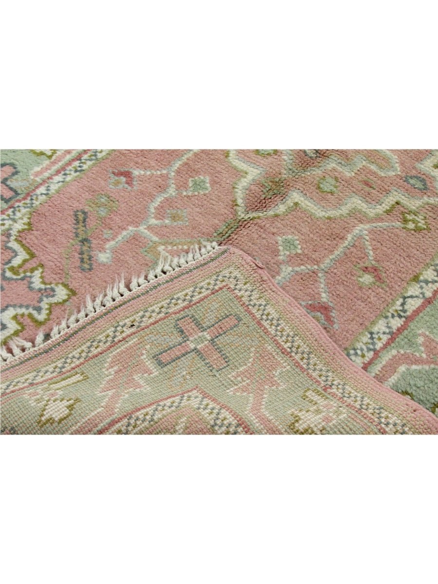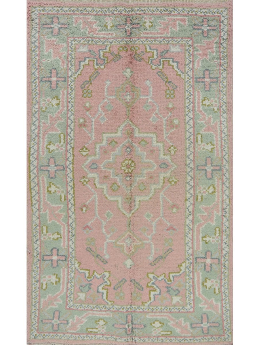 Enhance your decor with the subtle elegance of this 3x5 Antique Turkish Oushak Area Rug. This beautifully handwoven piece features a delicate medallion pattern, set against a soft blush pink field with intricate geometric and floral accents. The color palette includes soothing green and warm beige, creating a harmonious and charming aesthetic. Adorned with repeating motifs, the border adds to its Turkish charm. Crafted in Turkey using premium wool, this rug offers durability and a plush texture. Its handmade construction ensures it will remain a beautiful addition to your home for years. Ideal for small living spaces or entryways, it brings authentic heritage to your home. Shop now and enjoy free shipping in the United States.