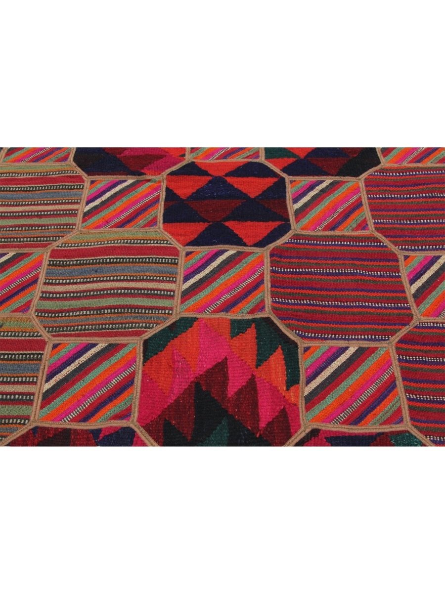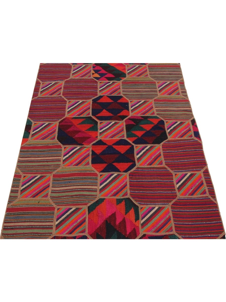 Transform your home with the 3x5 Patchwork Persian Area Rug, a stunning blend of classic craftsmanship and artistic design. Handmade from timeless Persian rug fragments, this unique piece features a captivating geometric patchwork of octagonal and rectangular shapes, combining striped and triangular motifs in deep red, rust, navy blue, olive green, and earthy browns. Vibrant accents of pink, beige, and orange bring a dynamic touch to the overall composition, making this rug a true statement piece.