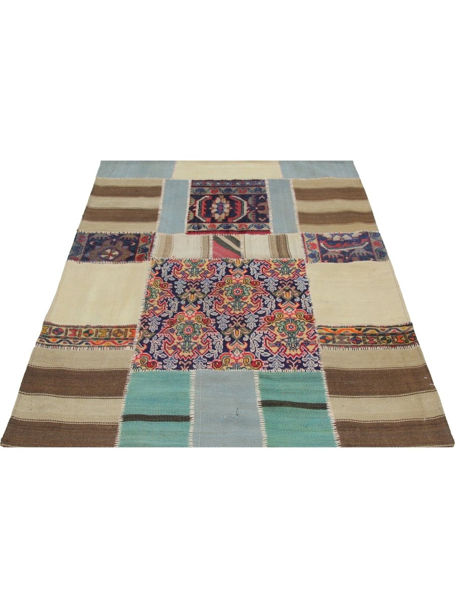 This 4x6 Persian patchwork rug beautifully combines hand-knotted Persian rug fragments with kilim textile sections, creating a striking contrast between ornate and rustic elements. The central panel showcases a detailed floral and geometric pattern reminiscent of Bakhtiari or Qashqai rugs, while the surrounding striped kilim sections in beige, brown, red, and blue add a subtle cultural touch. The visible hand-stitched seams highlight its handmade craftsmanship, reinforcing the rug’s durability and artistic charm. A versatile statement piece, this patchwork rug is ideal for bohemian, eclectic, or timeless interiors. It effortlessly adds warmth, texture, and cultural depth to any space, making it a timeless addition to your home decor.