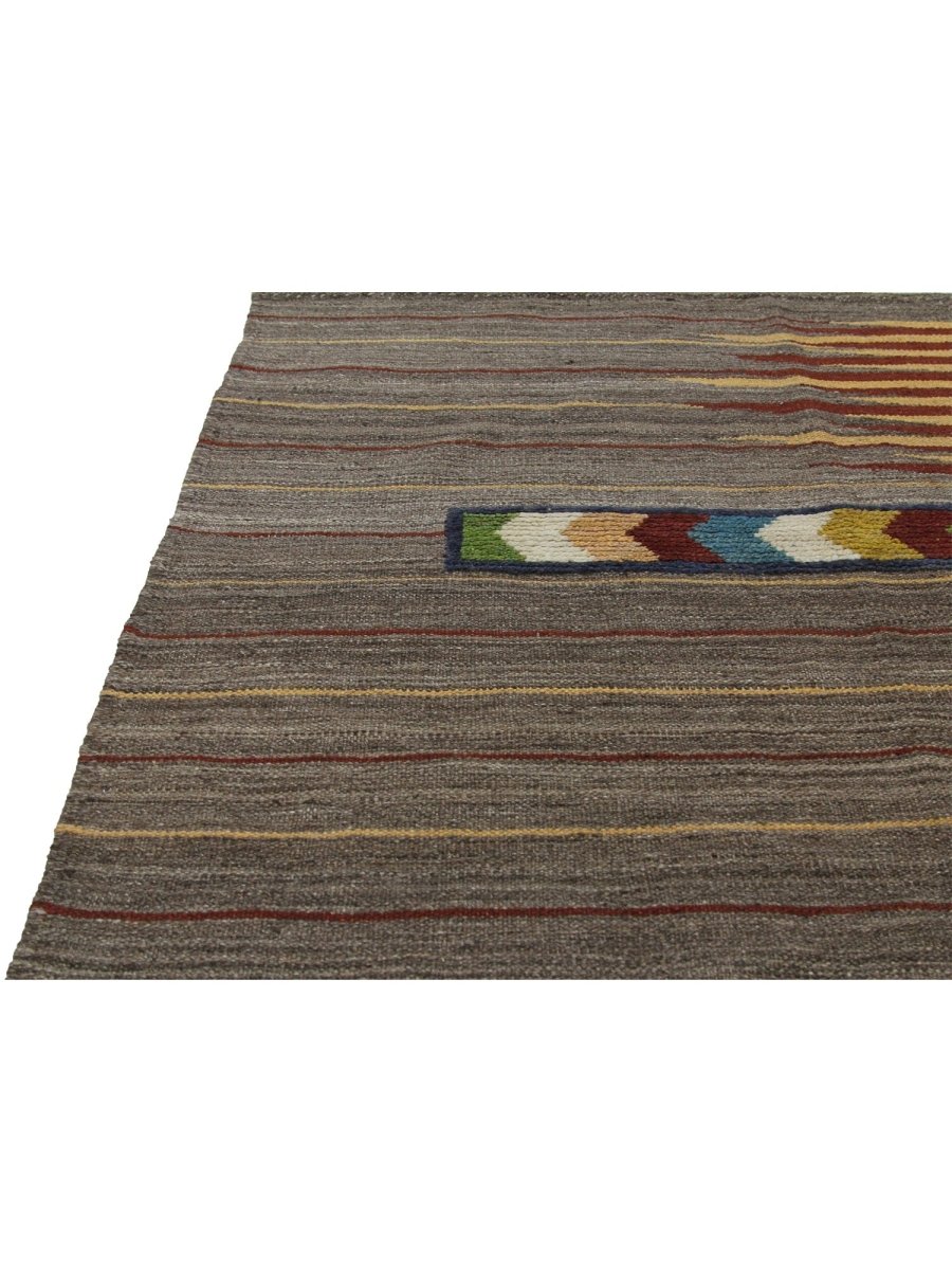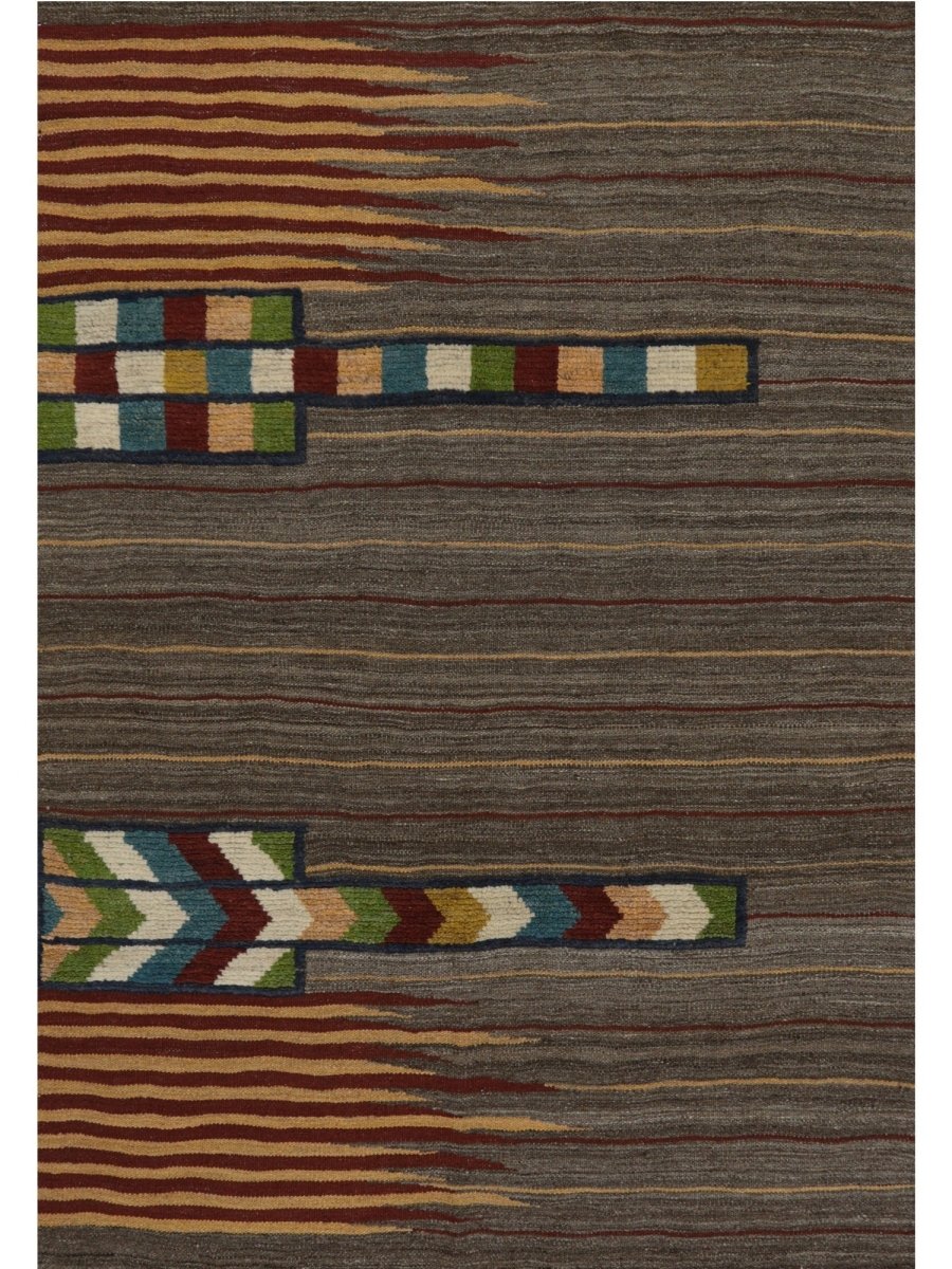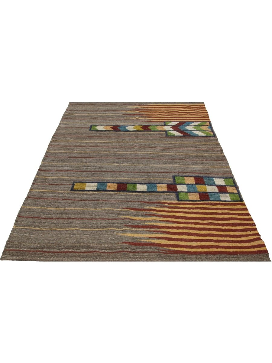 Add a touch of charm and sophistication to your space with this stunning 4x6 Persian kilim area rug, hand-woven in Persia using classic techniques, boasting a unique geometric pattern with striped accents, showcasing a vibrant palette, with gray, brown, rust, and yellow colors providing a bold and eye-catching backdrop for the vibrant accents, creating a truly unique and stylish design, perfect for those who want to add a pop of color to a neutral room or create a cozy and inviting atmosphere, with the wool material ensuring a soft and durable texture underfoot, while the hand-woven construction adds a touch of authenticity and charm, making it a great choice for rooms that need a touch of global style and sophistication.