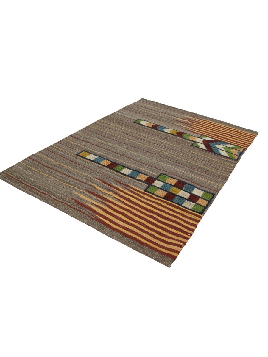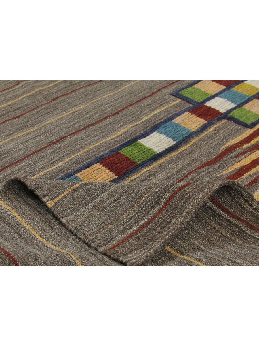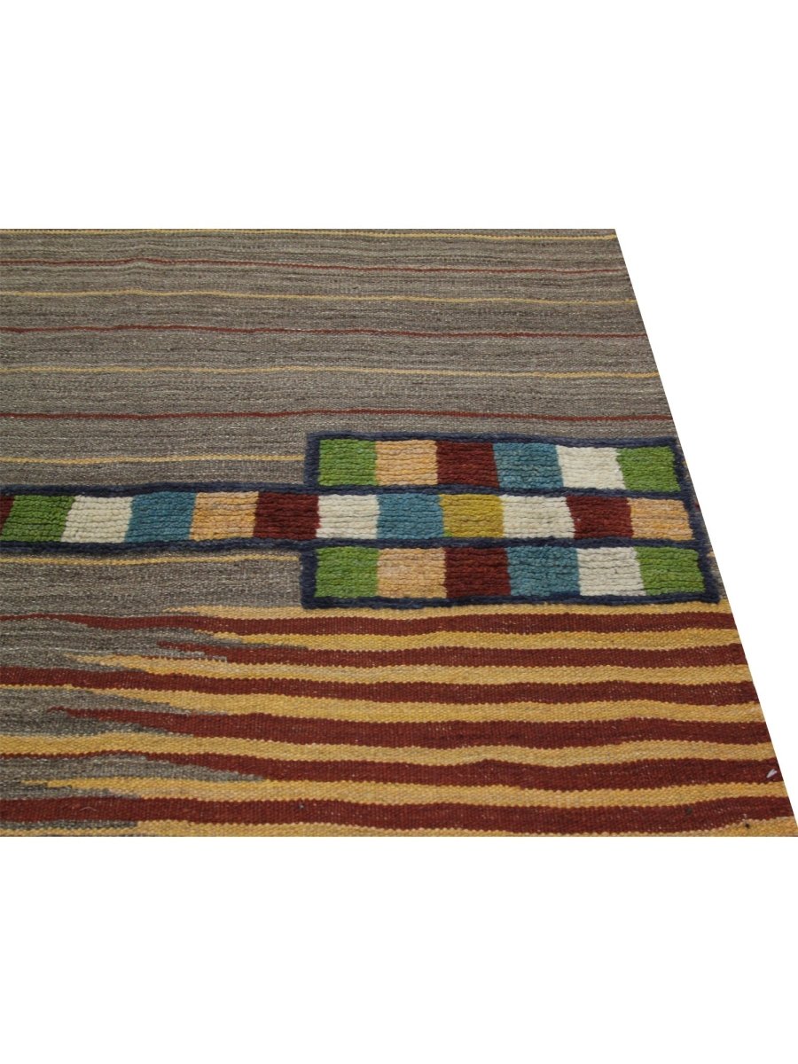 Add a touch of charm and sophistication to your space with this stunning 4x6 Persian kilim area rug, hand-woven in Persia using classic techniques, boasting a unique geometric pattern with striped accents, showcasing a vibrant palette, with gray, brown, rust, and yellow colors providing a bold and eye-catching backdrop for the vibrant accents, creating a truly unique and stylish design, perfect for those who want to add a pop of color to a neutral room or create a cozy and inviting atmosphere, with the wool material ensuring a soft and durable texture underfoot, while the hand-woven construction adds a touch of authenticity and charm, making it a great choice for rooms that need a touch of global style and sophistication.