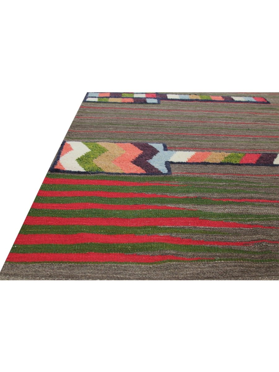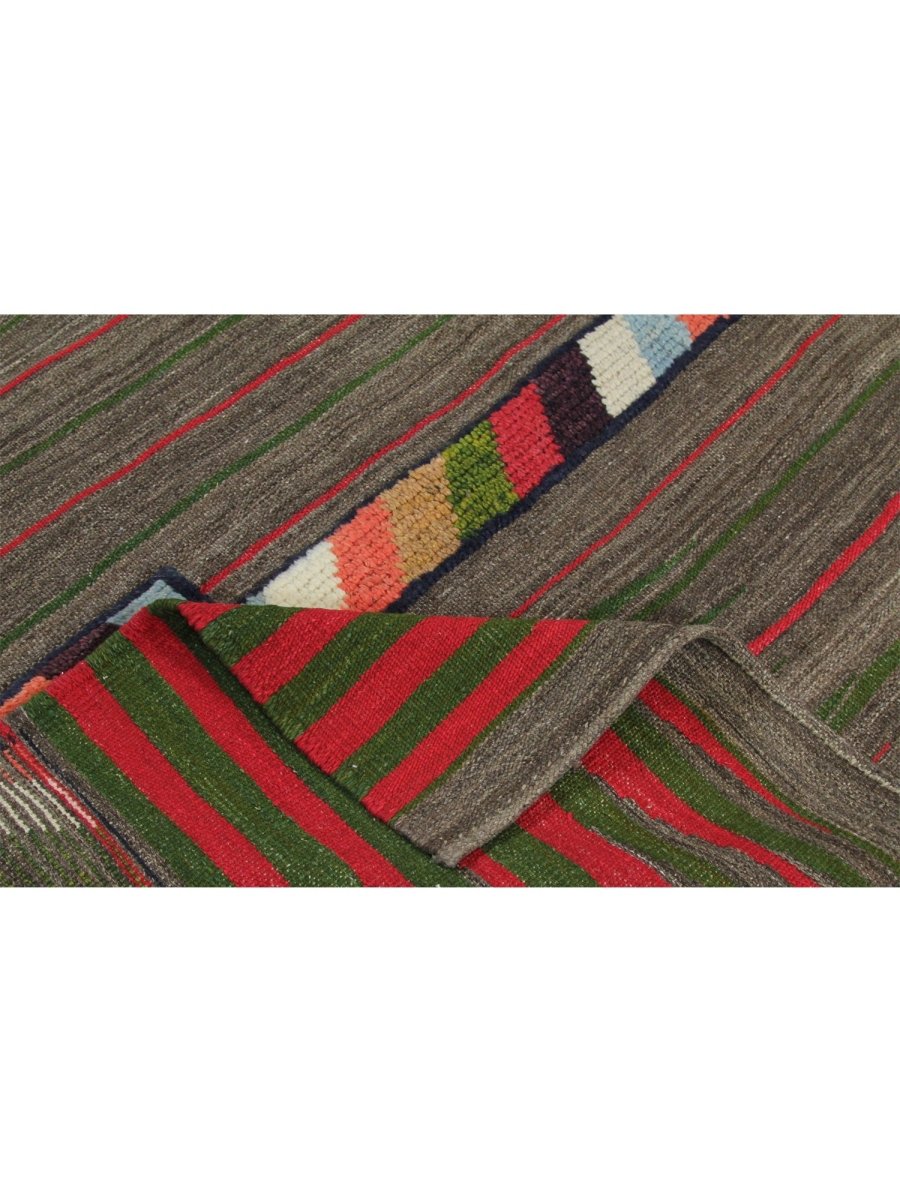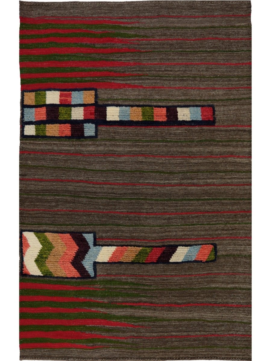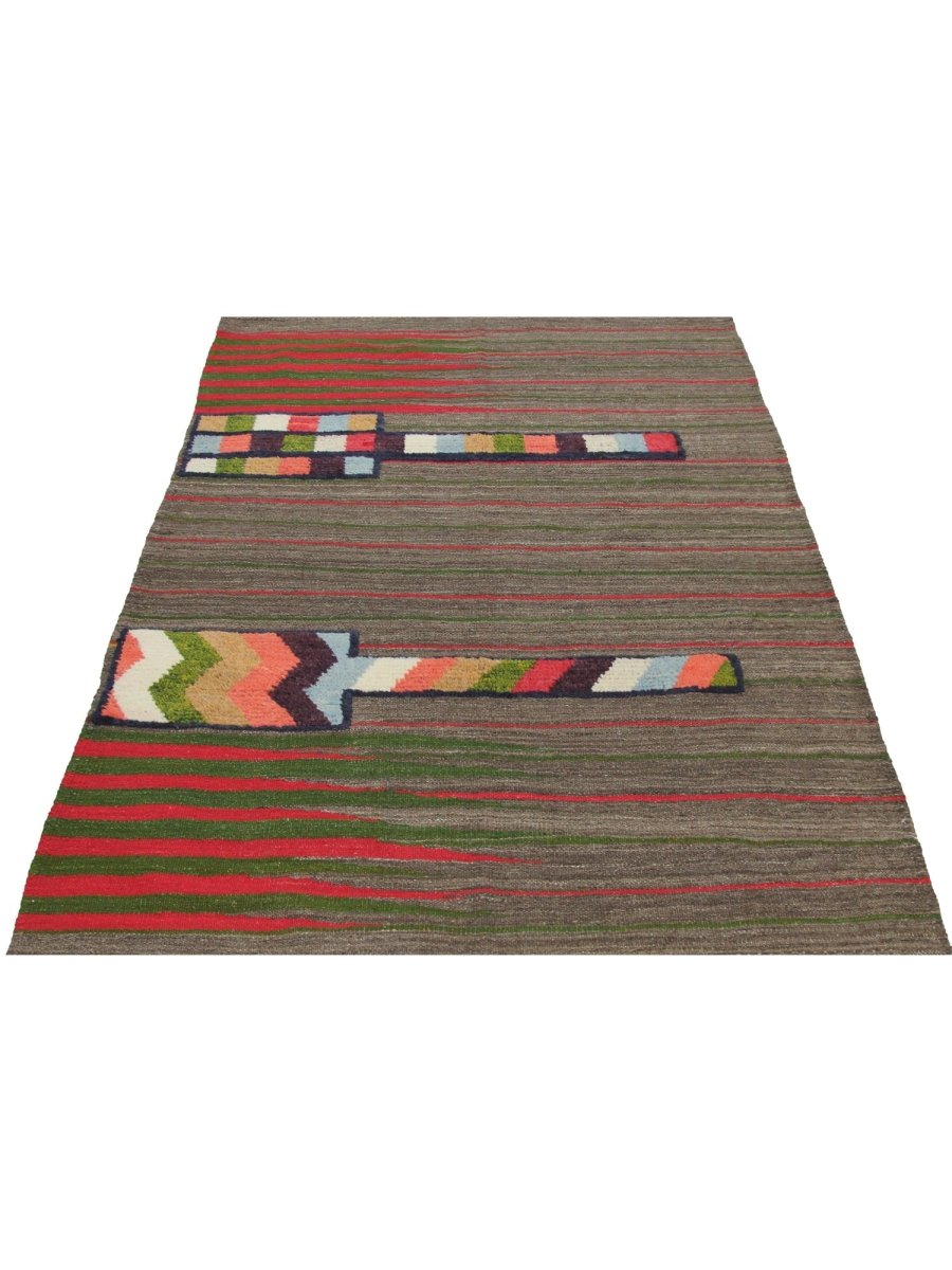 This 4x6 Persian Kilim Area Rug combines earthy tones with bold geometric patterns, creating a visually dynamic accent for any space. The dark gray base is complemented by fine red and green stripes, while geometric motifs in brown, blue, olive green, black, and peach add a cultural-inspired charm. Handwoven from high-quality Persian wool, the flat-weave construction ensures durability while maintaining a lightweight, flexible feel. The rug’s harmonious blend of subtle and vibrant hues makes it a versatile choice for sleek, classical, or bohemian interiors. Its intricate patterns and rich colors add texture and warmth to any room, making it a perfect statement piece. This rug brings both style and cultural appeal to your home, enhancing its atmosphere.