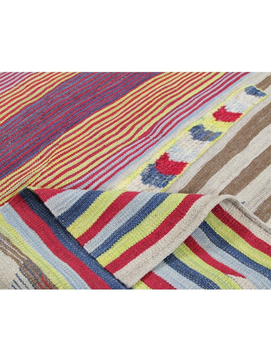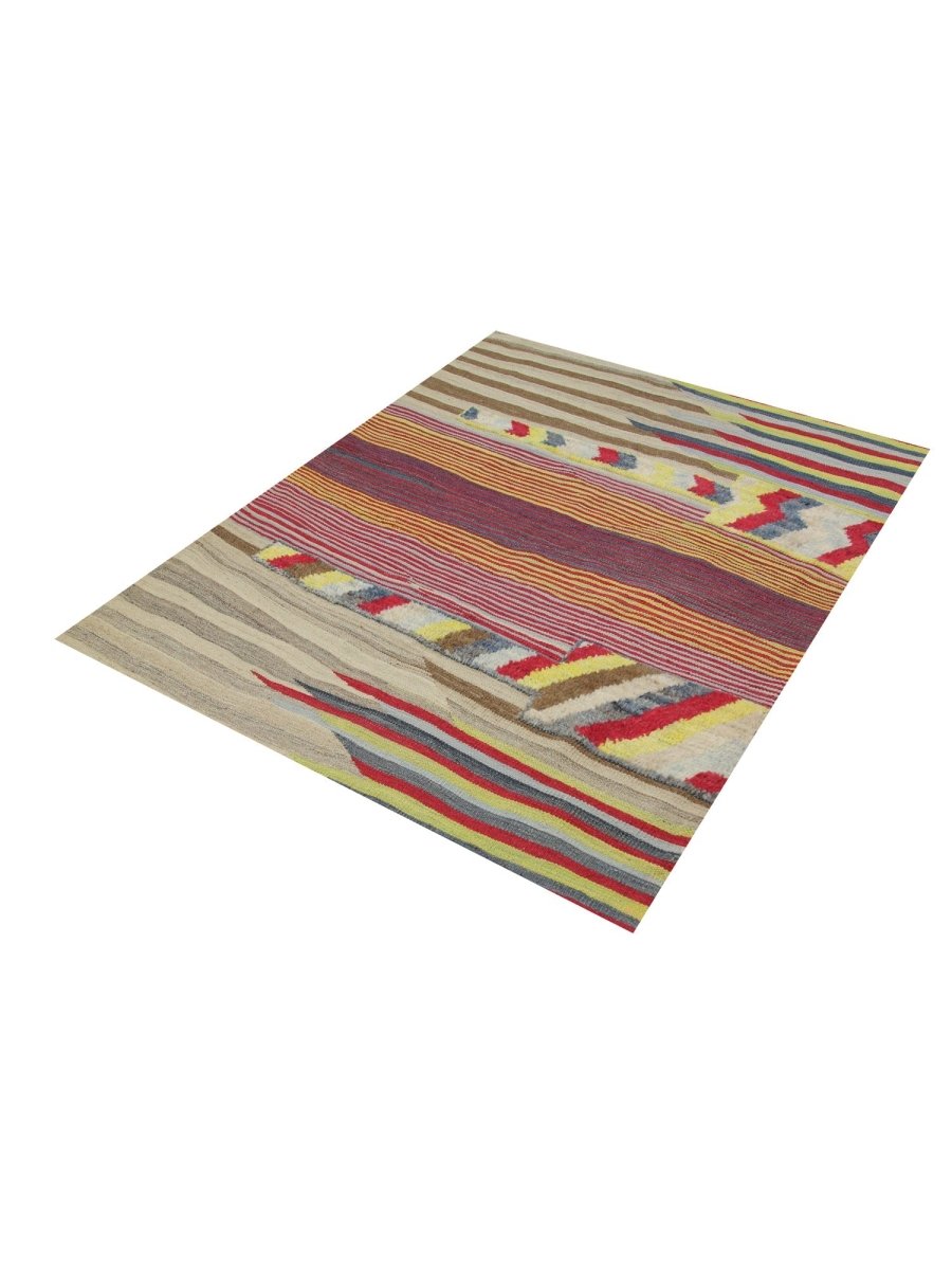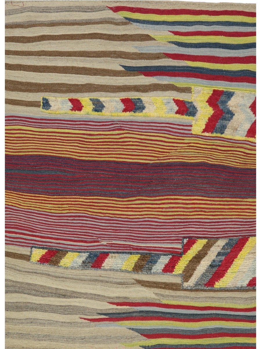 The 4x6 Persian Kilim Area Rug is a stunning blend of warm and cool tones, featuring an intricate mix of beige, brown, mustard yellow, red, blue, and ivory. Its striking design includes dynamic horizontal and diagonal stripes, intersected by bold chevron accents. The contrast between fine and broad lines adds depth, while the vibrant yet earthy hues make it a perfect statement piece. Handwoven from premium Persian wool, its flat-weave construction ensures durability and a lightweight texture, making it easy to maintain. Its artisanal craftsmanship and classical weaving techniques make it a timeless addition to any home.