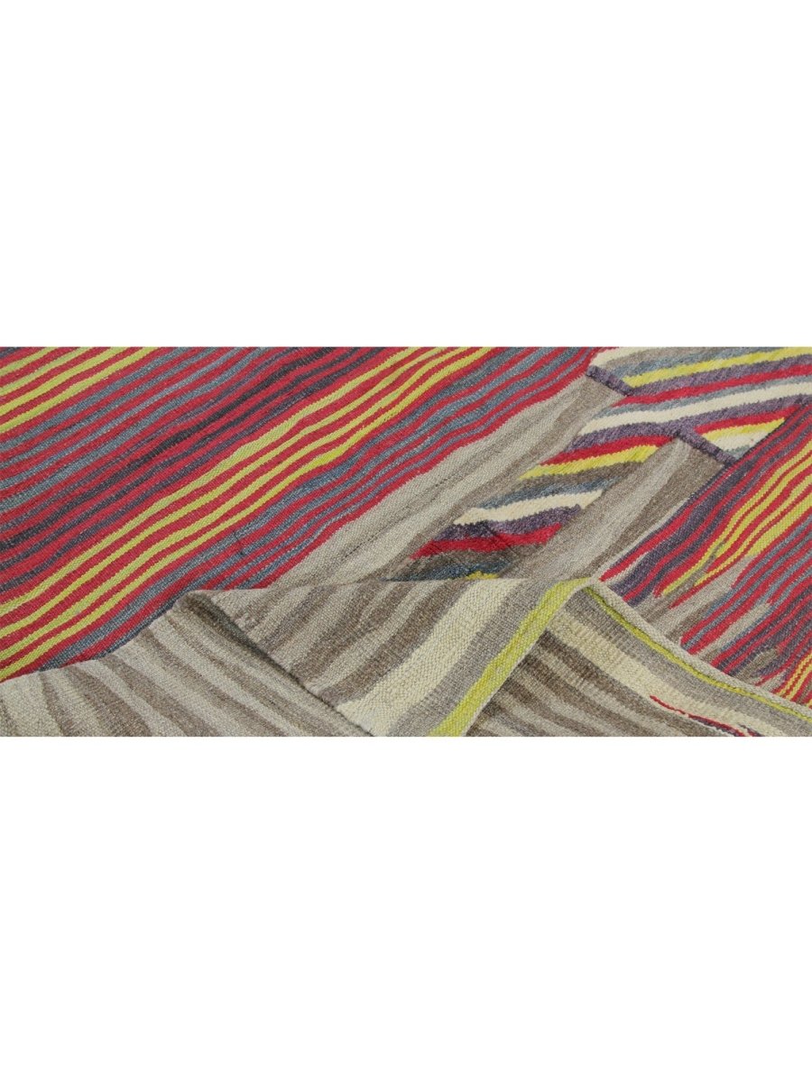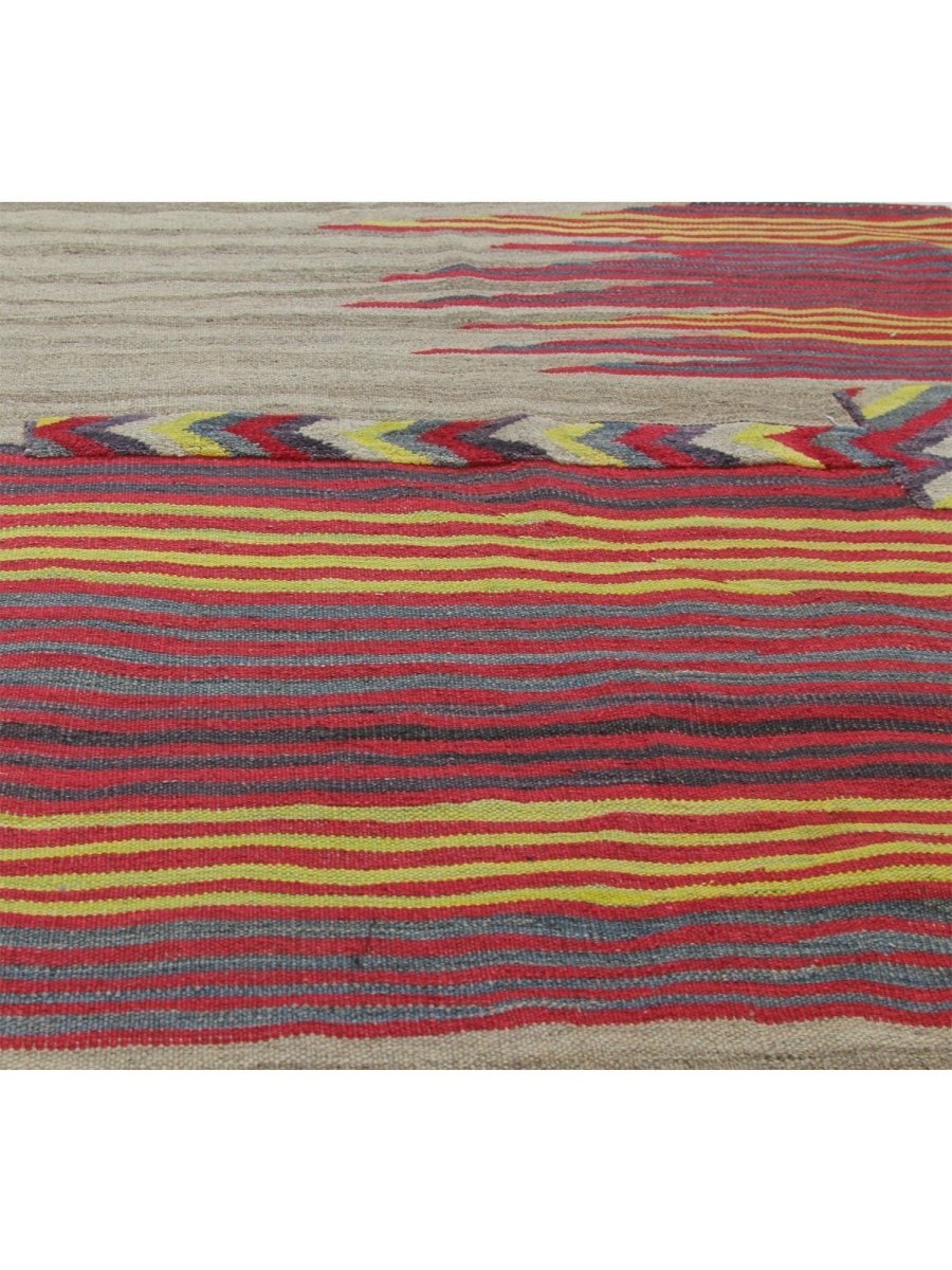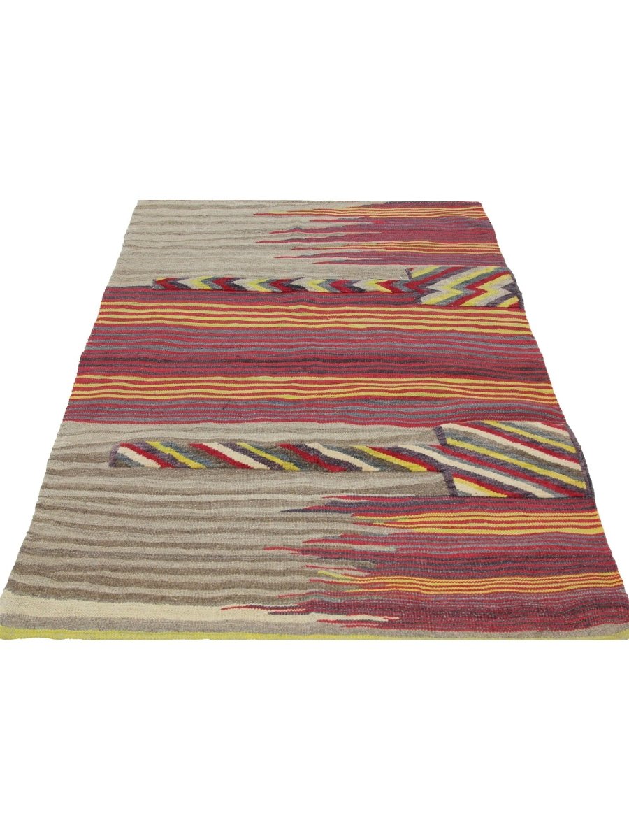 The 4x6 Persian Kilim Area Rug features a sophisticated blend of earthy beige and gray tones, enhanced by bold red, yellow, and blue stripes. The geometric accents, including striking chevron and linear patterns, create a sense of movement and texture. Handwoven from high-quality Persian wool, this flat-weave rug is durable, lightweight, and easy to maintain. Its rich interplay of warm and cool hues adds versatility, making it a seamless addition to sleek, bohemian, or rustic spaces. The intricate craftsmanship ensures each piece is unique, bringing warmth and character to any room. This rug provides a timeless aesthetic that merges classical Persian artistry with chic style.