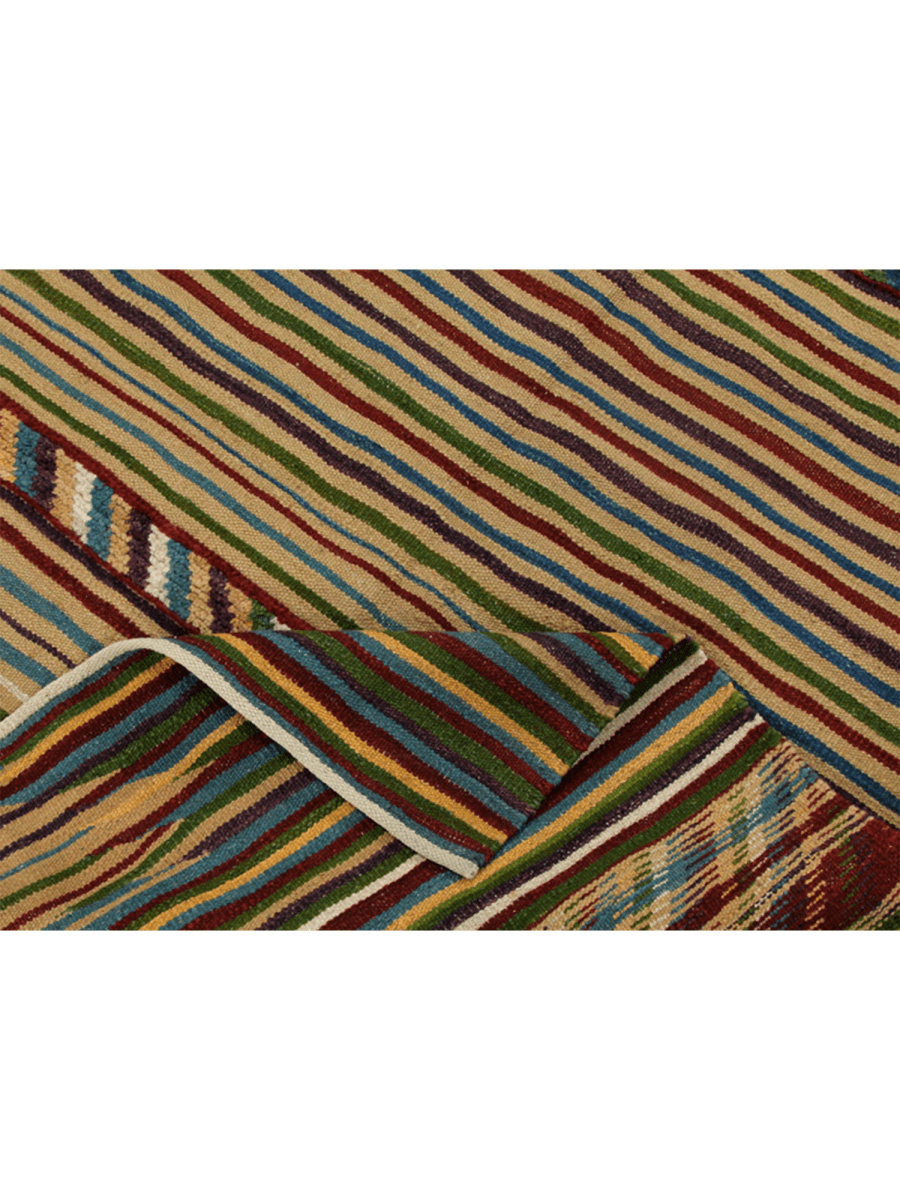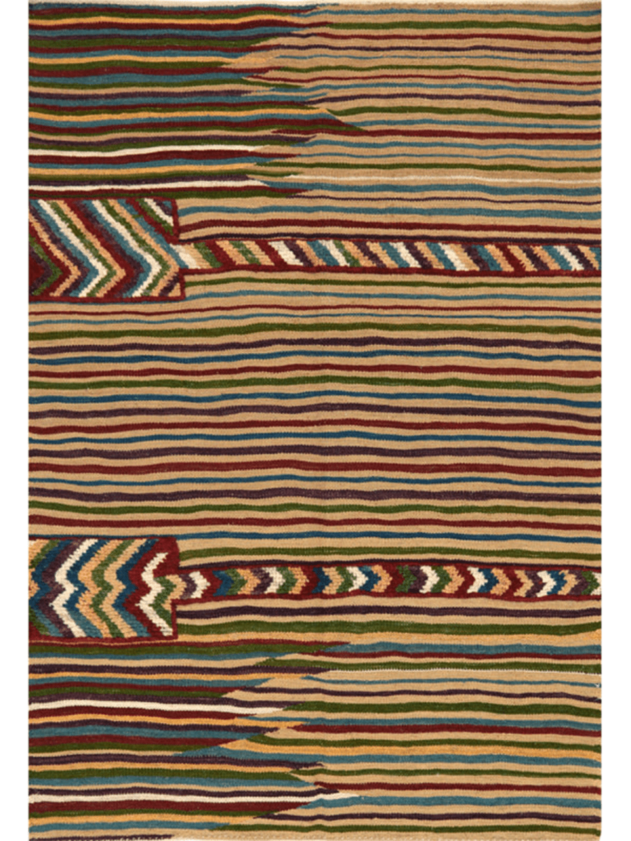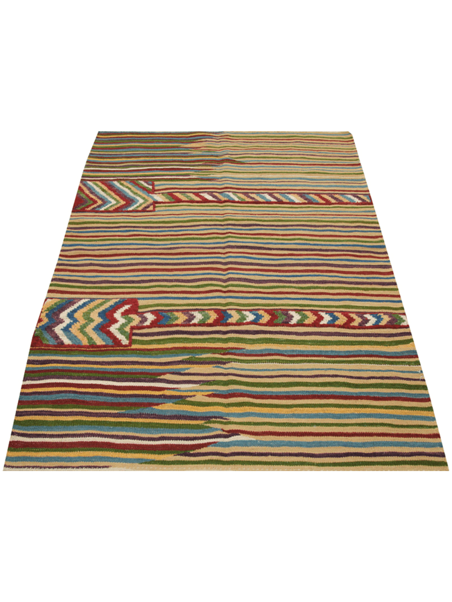 Enhance your space with this 4x6 Persian Kilim rug, expertly handwoven from premium wool. Designed with a classic striped pattern, it showcases rich hues of tan, beige, green blue, and rust, creating a timeless and inviting look. Its flatweave construction ensures durability while maintaining a lightweight and flexible feel, making it a practical yet stylish addition to your home. This versatile Kilim rug seamlessly blends into various interior styles. Its intricate craftsmanship and bold yet subtle tones add depth and texture to any room.