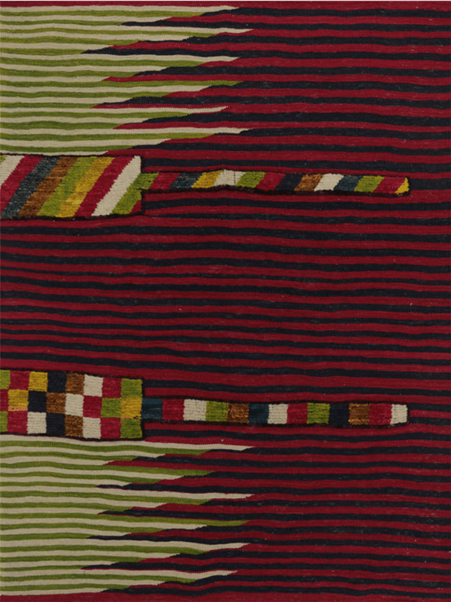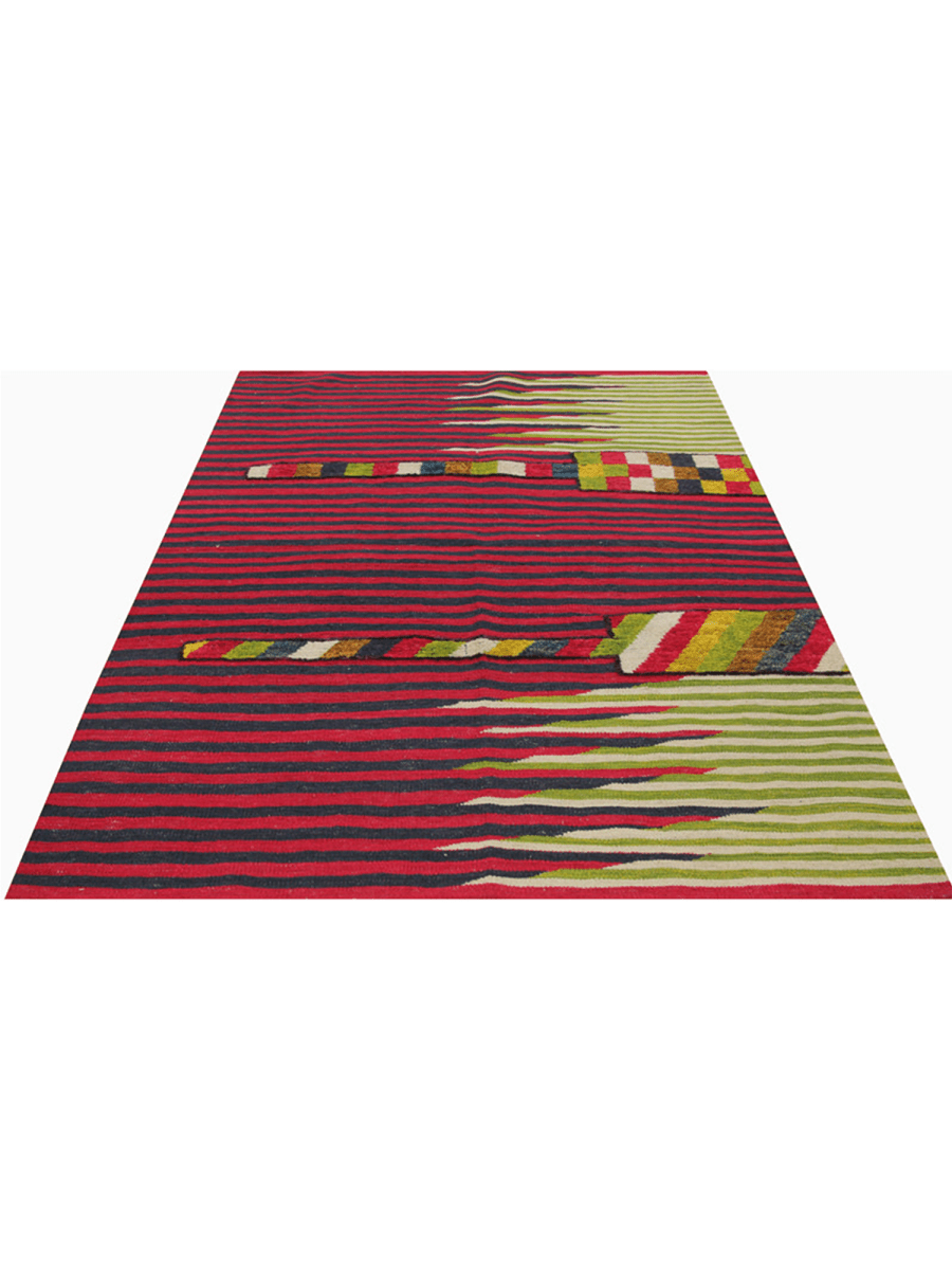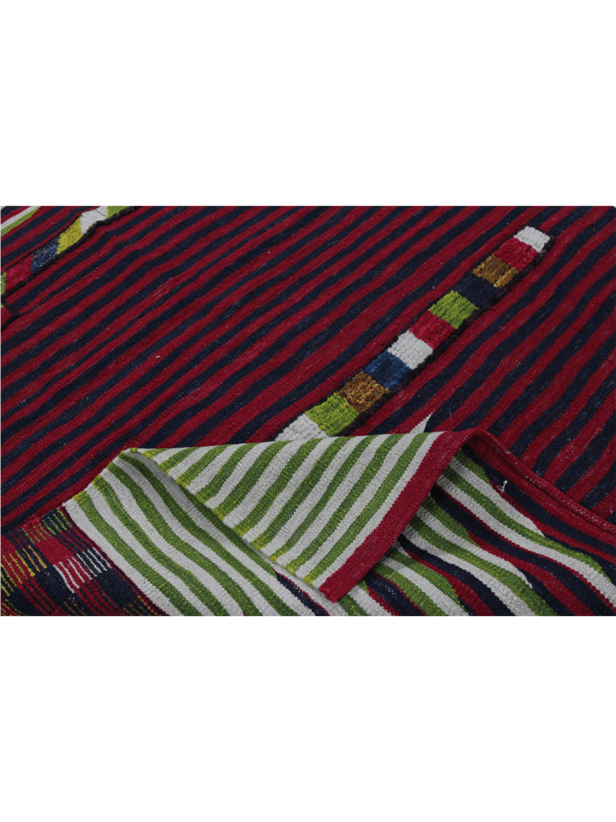 Bring an authentic Persian touch to your home with this 4x6 hand-knotted wool Kilim rug. Showcasing rich tones of red, black, green, and beige, its striped design creates a striking visual effect this rug adds texture and warmth to any setting. The high-quality wool construction ensures long-lasting durability, making it a versatile addition to your space. A stunning blend of elegance. Free shipping within the US.