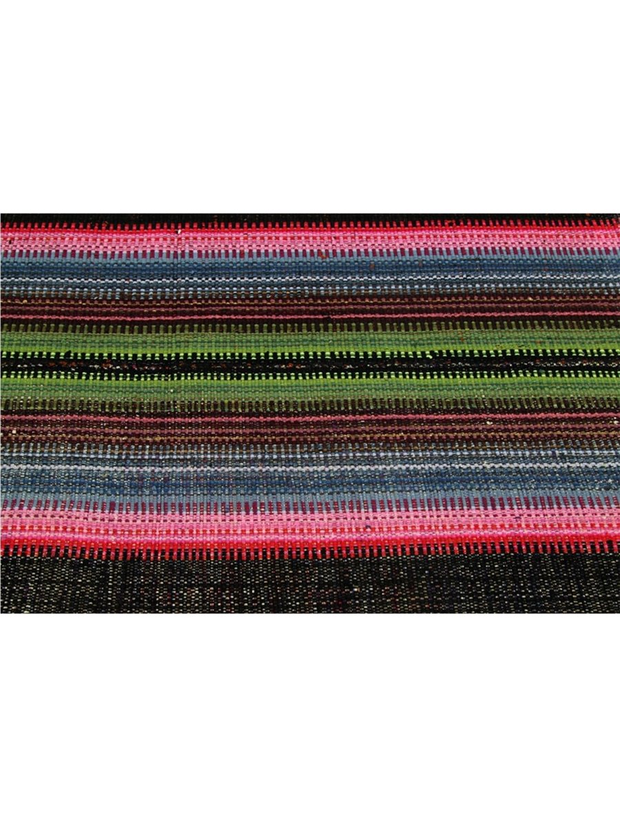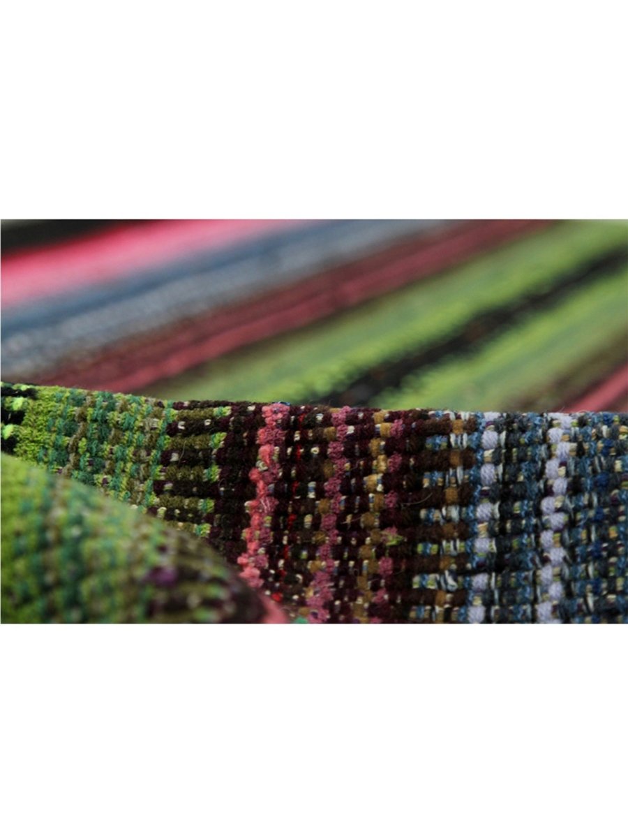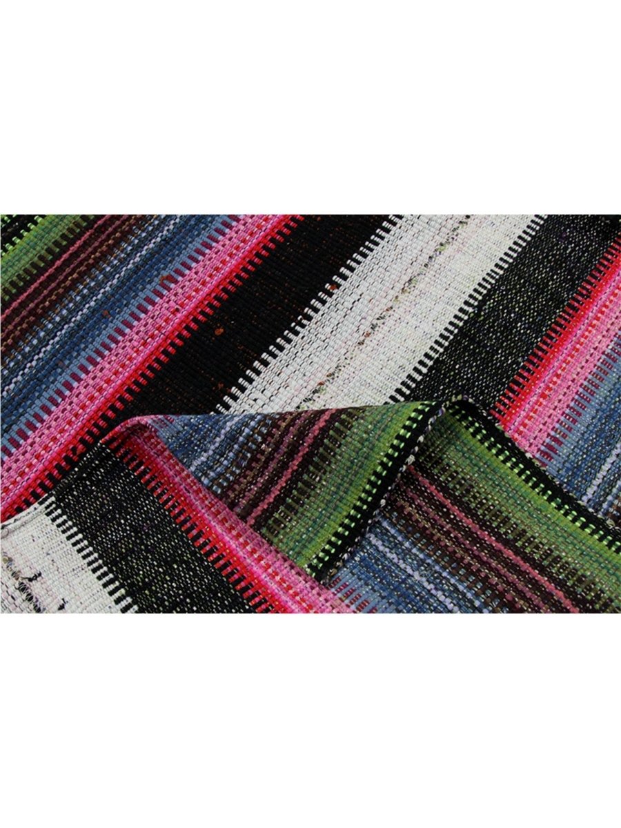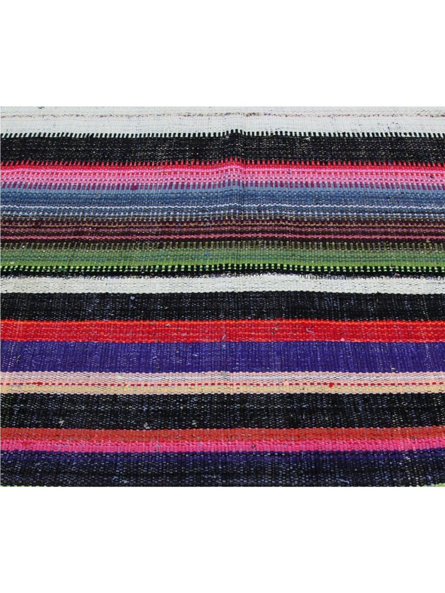 The 5x7 Persian Kilim Area Rug is a vibrant and colorful work of art, perfect for adding personality to your space. Hand-knotted in Persia from durable wool, this rug features bold horizontal stripes in a mix of black and white, punctuated by vivid hues of green, pink, blue, and red. The varied stripe thickness creates a lively rhythm, while finely woven details add texture and richness. For eclectic, bohemian, or chic interiors. Its durable craftsmanship ensures long-lasting beauty, making it a timeless addition to any home. Elevate your decor with this striking fusion of culture and style.