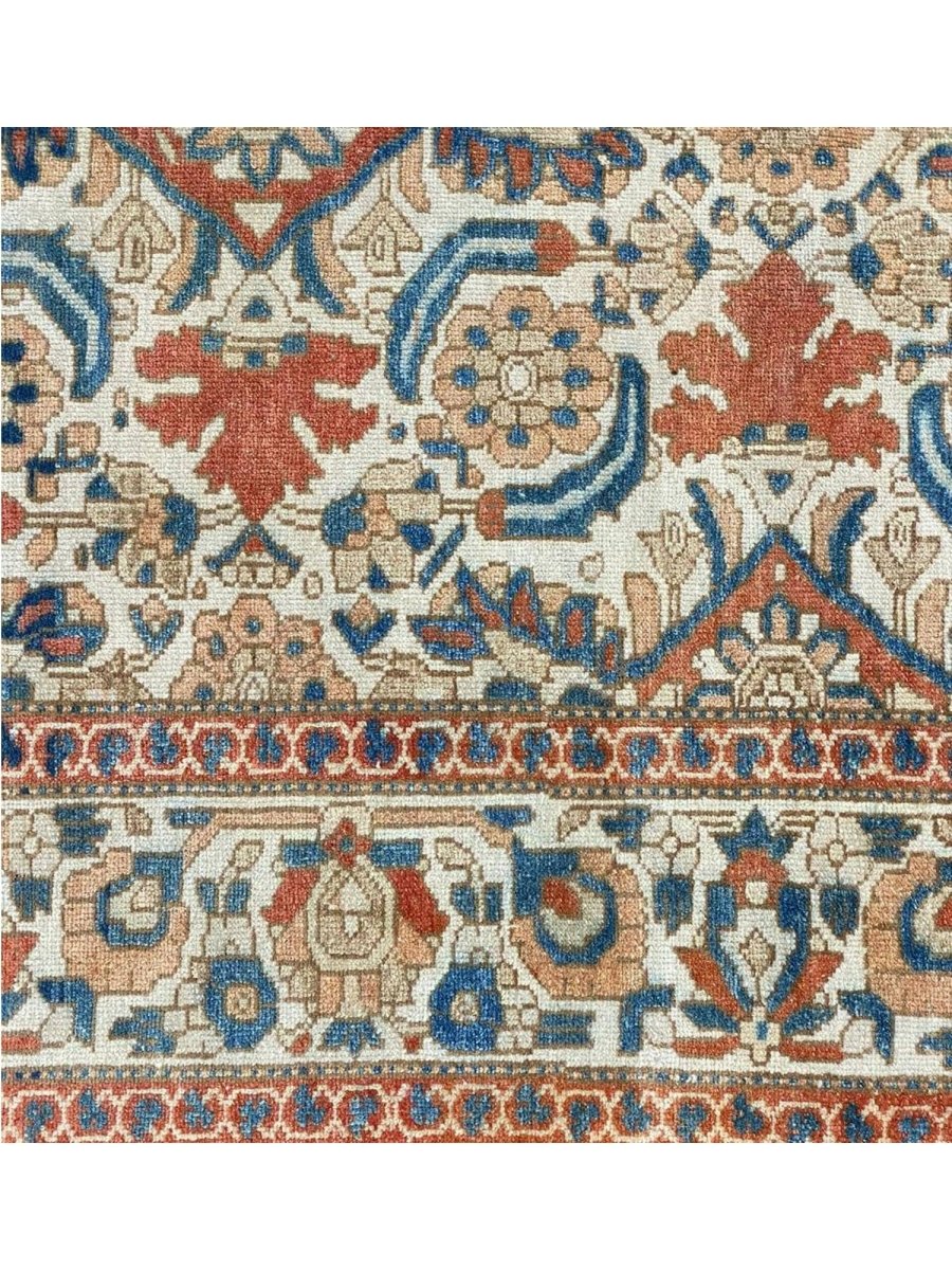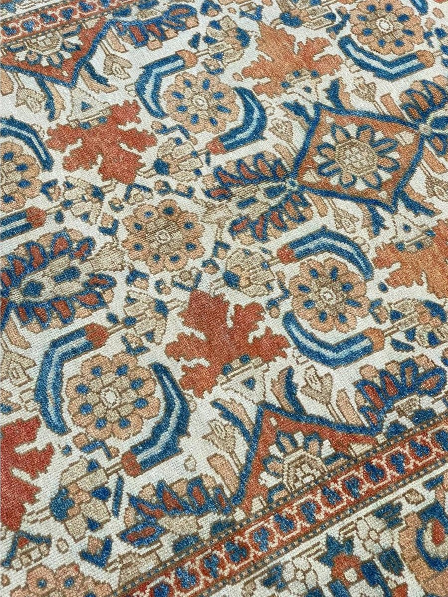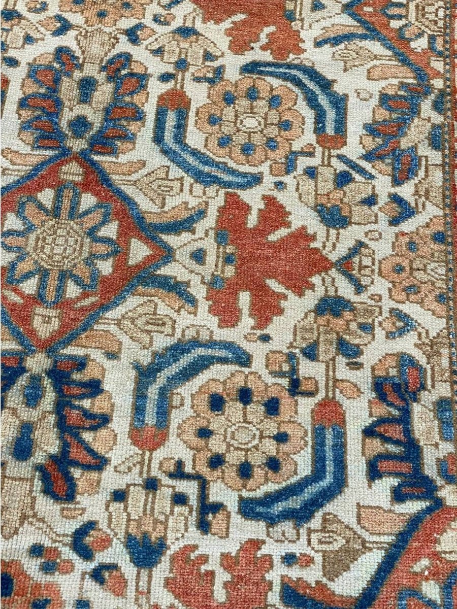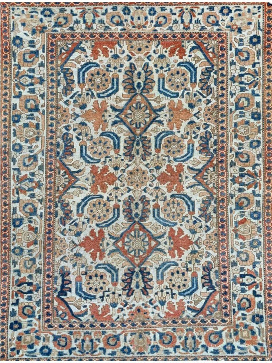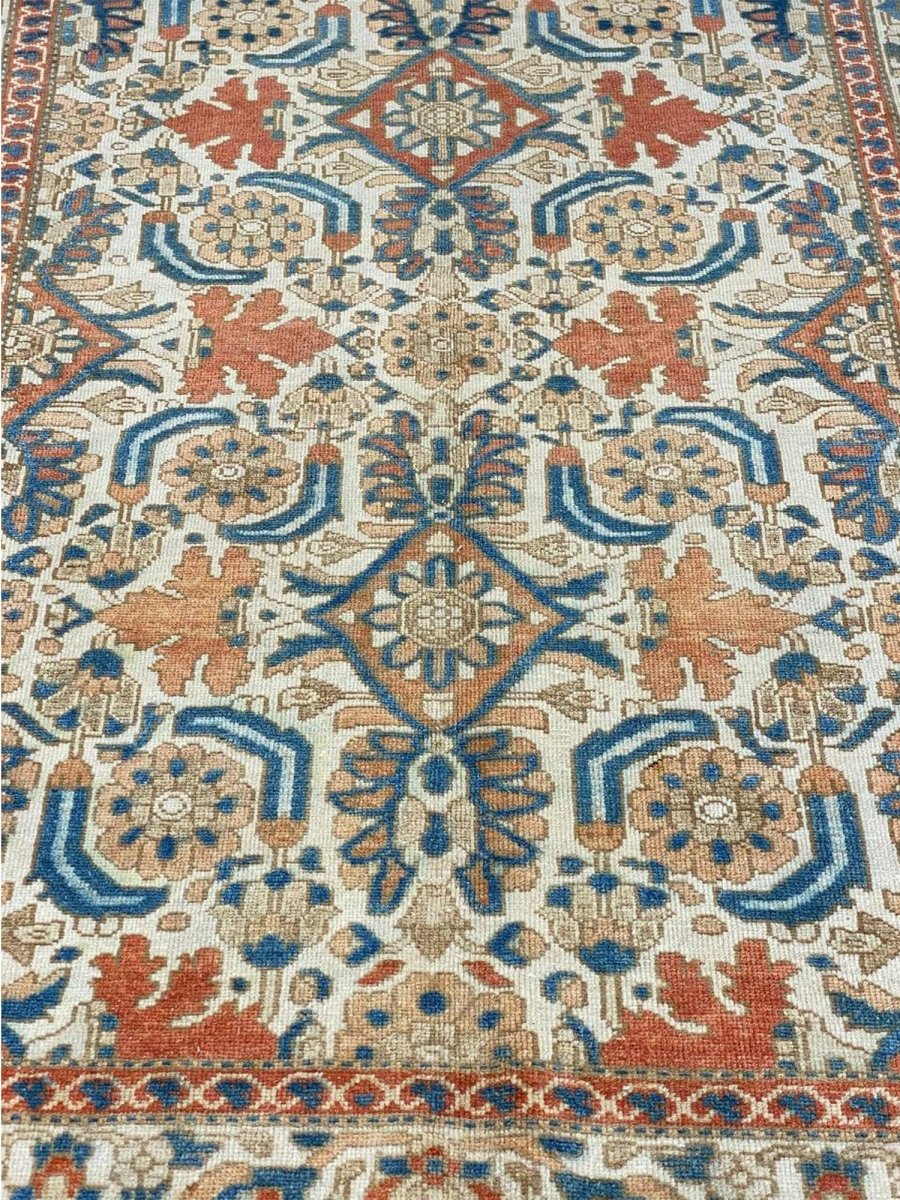 Elevate your space with the timeless beauty of this 5x7 Antique Persian Bakhtiari Area Rug. This rug features a geometric pattern with intricate diamond motifs, showcasing the rich artistry of Persian design. The deep blue background is complemented by natural rust tones and beige hints, creating a bold yet elegant aesthetic. A detailed border with geometric designs enhances its classic charm. This rug is handmade in Persia with premium wool and offers durability and a luxurious texture. Perfect for living rooms, dining areas, or cozy spaces, it brings a piece of Persian heritage to your home.