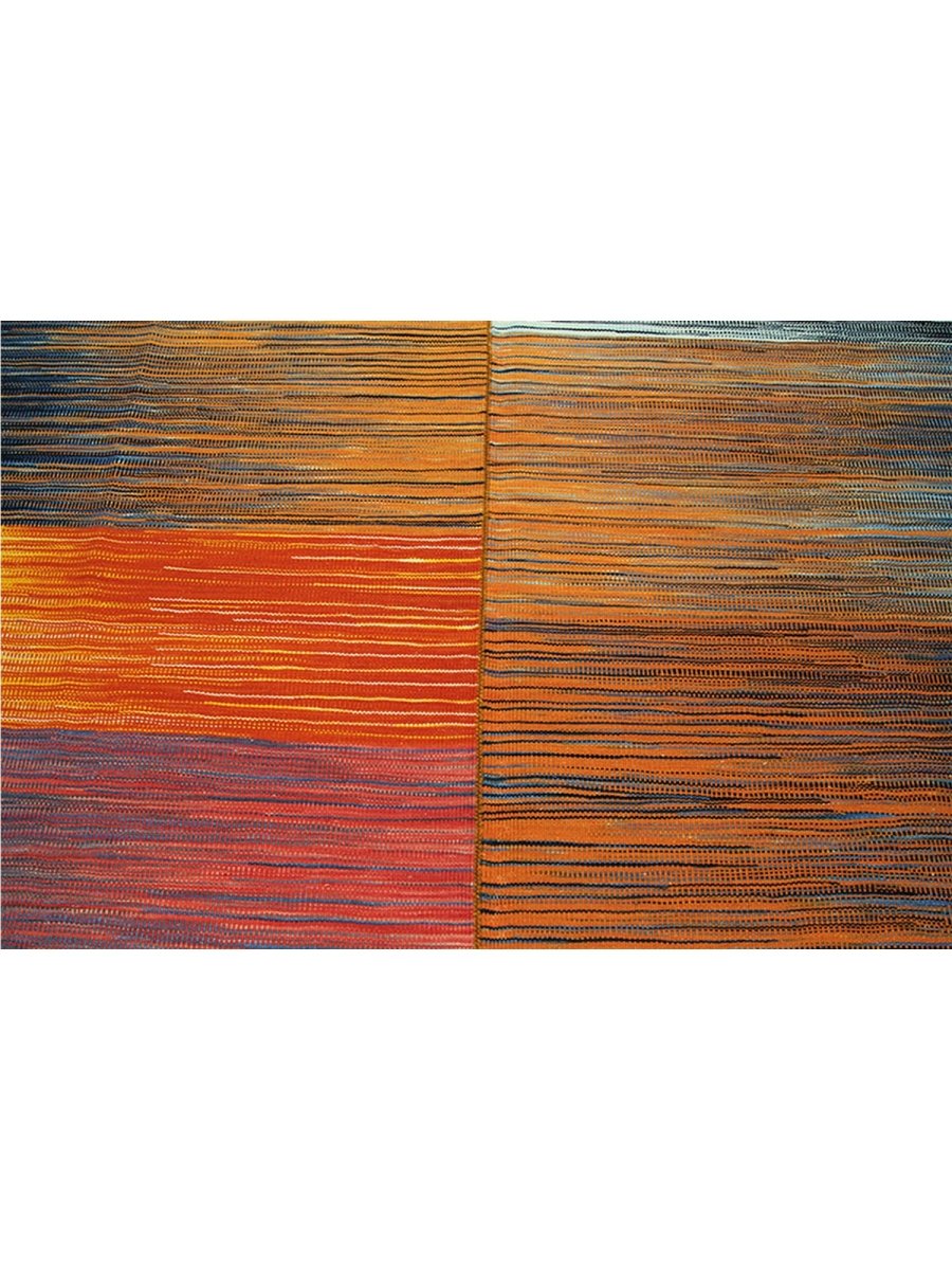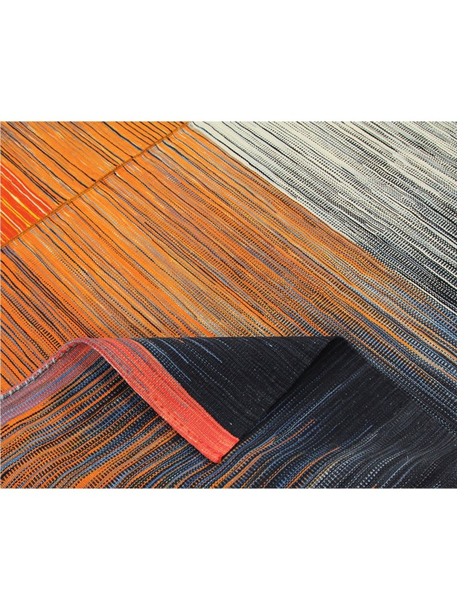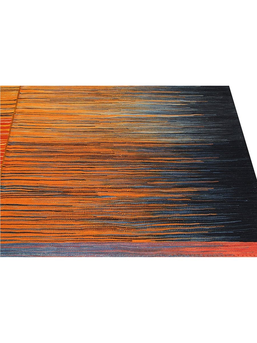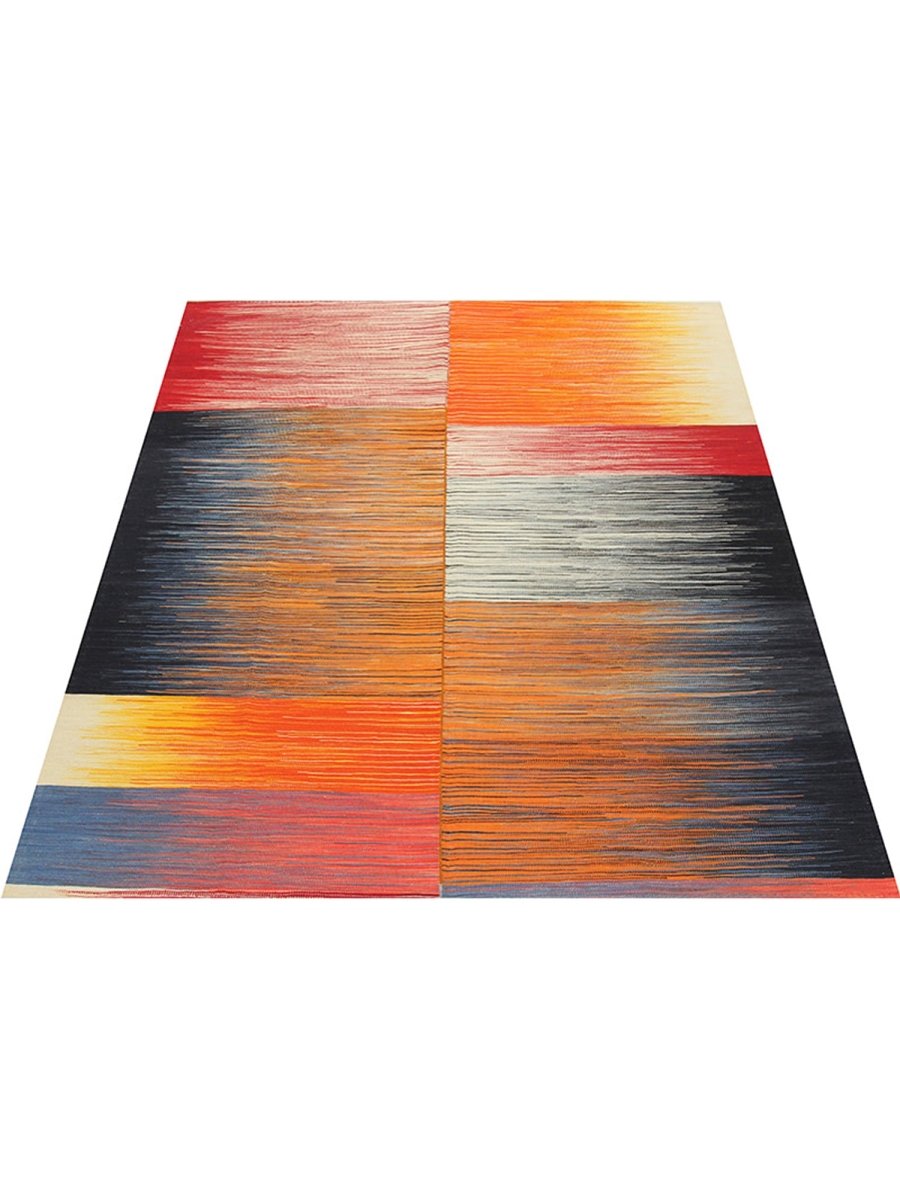 This 5x7 Persian Kilim area rug features a stunning arrangement of vibrant parallel shades, blending rich hues of red, blue, green, yellow, and earth tones. The vibrant yet balanced color scheme creates a dynamic yet harmonious aesthetic, making it a versatile addition to bohemian or rustic interiors. Handwoven from high-quality wool, this flatweave rug is lightweight, durable, and easy to maintain. Its classic kilim artistry combined with trendy color variations makes it a bold yet timeless statement piece.