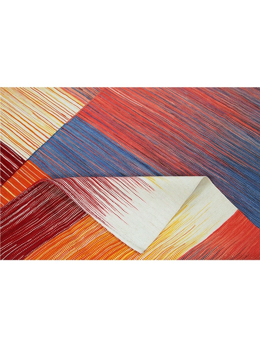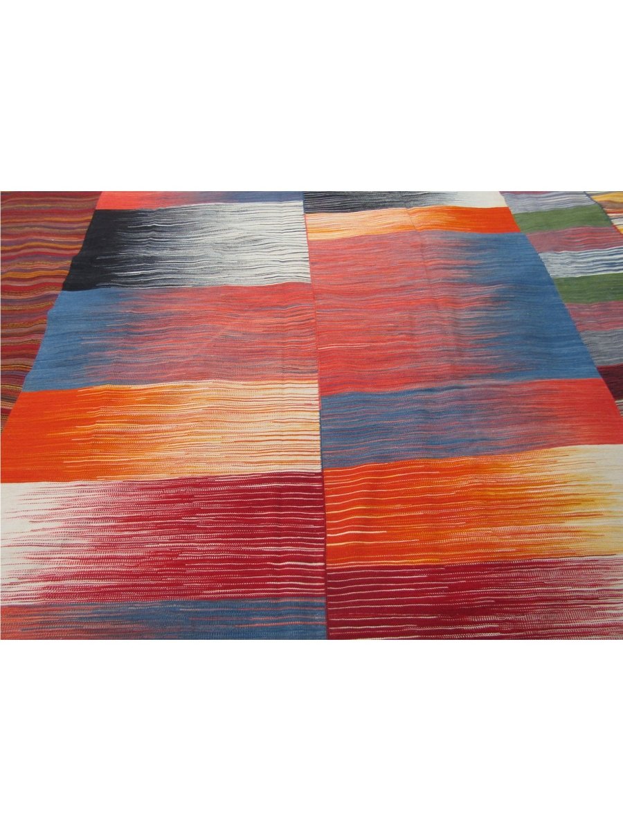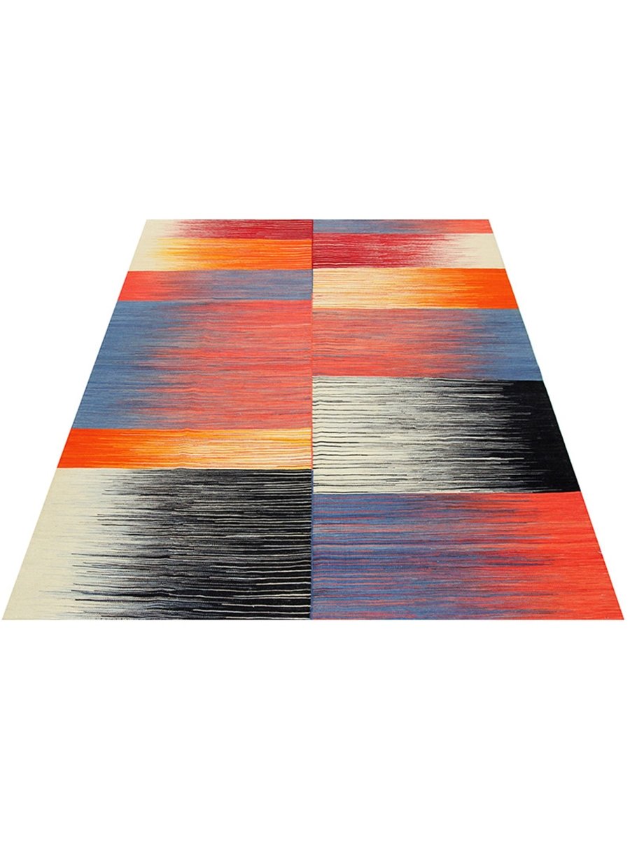 Add warmth and charm to your space with this 5x7 Persian Kilim rug, handwoven from high-quality wool. Its striped design features a rich blend of blue, orange, black, beige, rust, and cream, creating a dynamic visual appeal. The flat-weave construction makes it lightweight and easy to reposition, perfect for high-traffic areas. This rug’s soft yet durable texture ensures lasting comfort underfoot while enhancing your home’s decor. The carefully woven stripes create a harmonious blend of color and pattern, adding depth to any space. Its versatile design complements both classic and sleek interiors with effortless style.