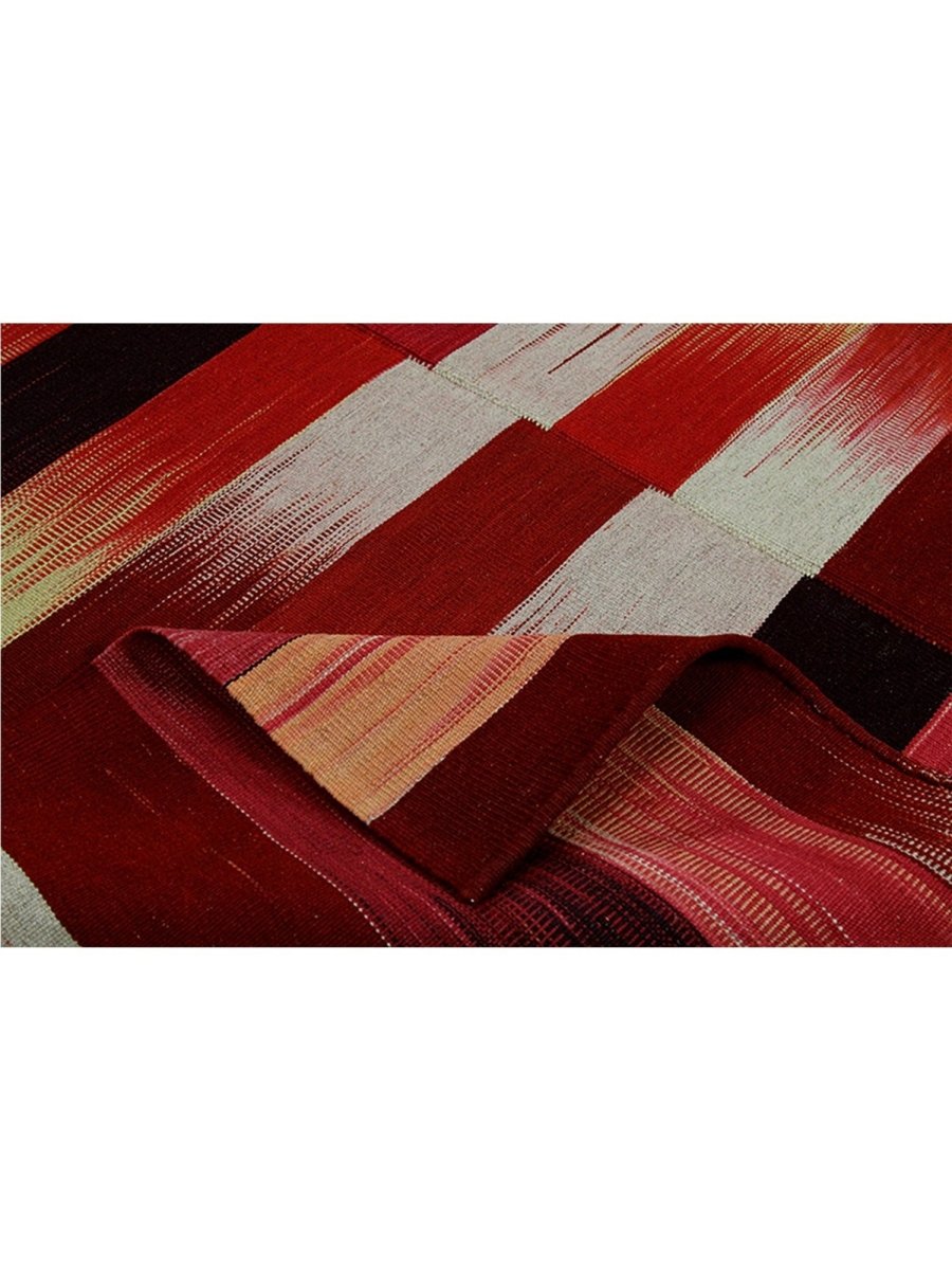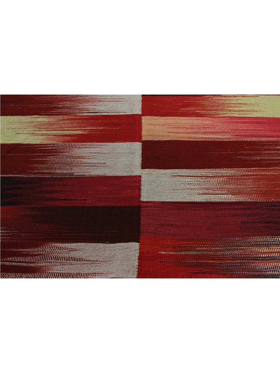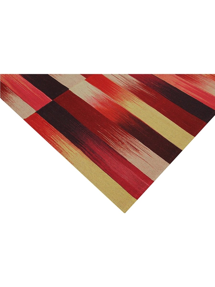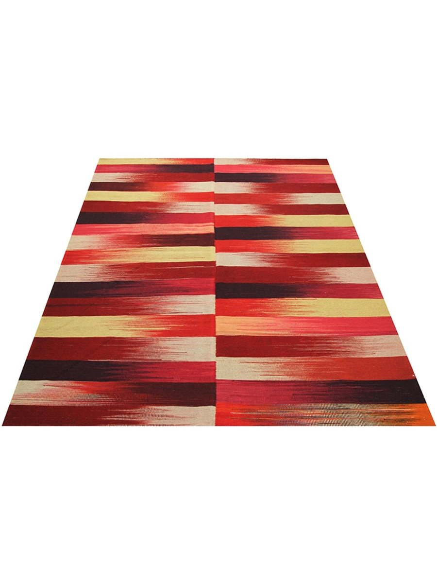 The 5x7 Persian Kilim Area Rug features a captivating design with bold horizontal stripes in rich red, rust, and black, with beige and mustard yellow accents. Each stripe flows seamlessly into the next, creating a beautiful gradient effect. The alternating stripes of intense colors and neutral tones offer a striking contrast that adds movement and texture. Ideal for chic, eclectic, or artistic interiors, this rug serves as a statement piece that injects warmth and energy into living spaces, studios, or any creative environment in need of vibrant character. Crafted with precision and care, this rug offers aesthetic appeal and long-lasting durability, making it a perfect addition to any space.