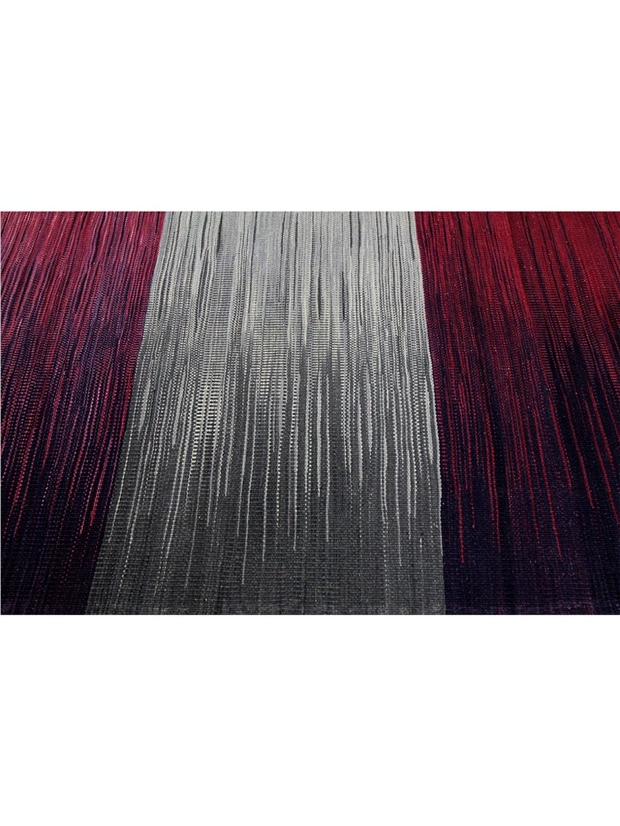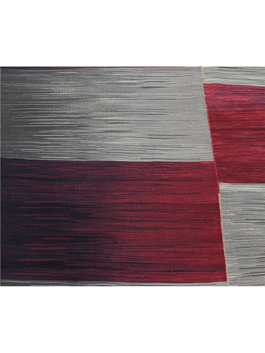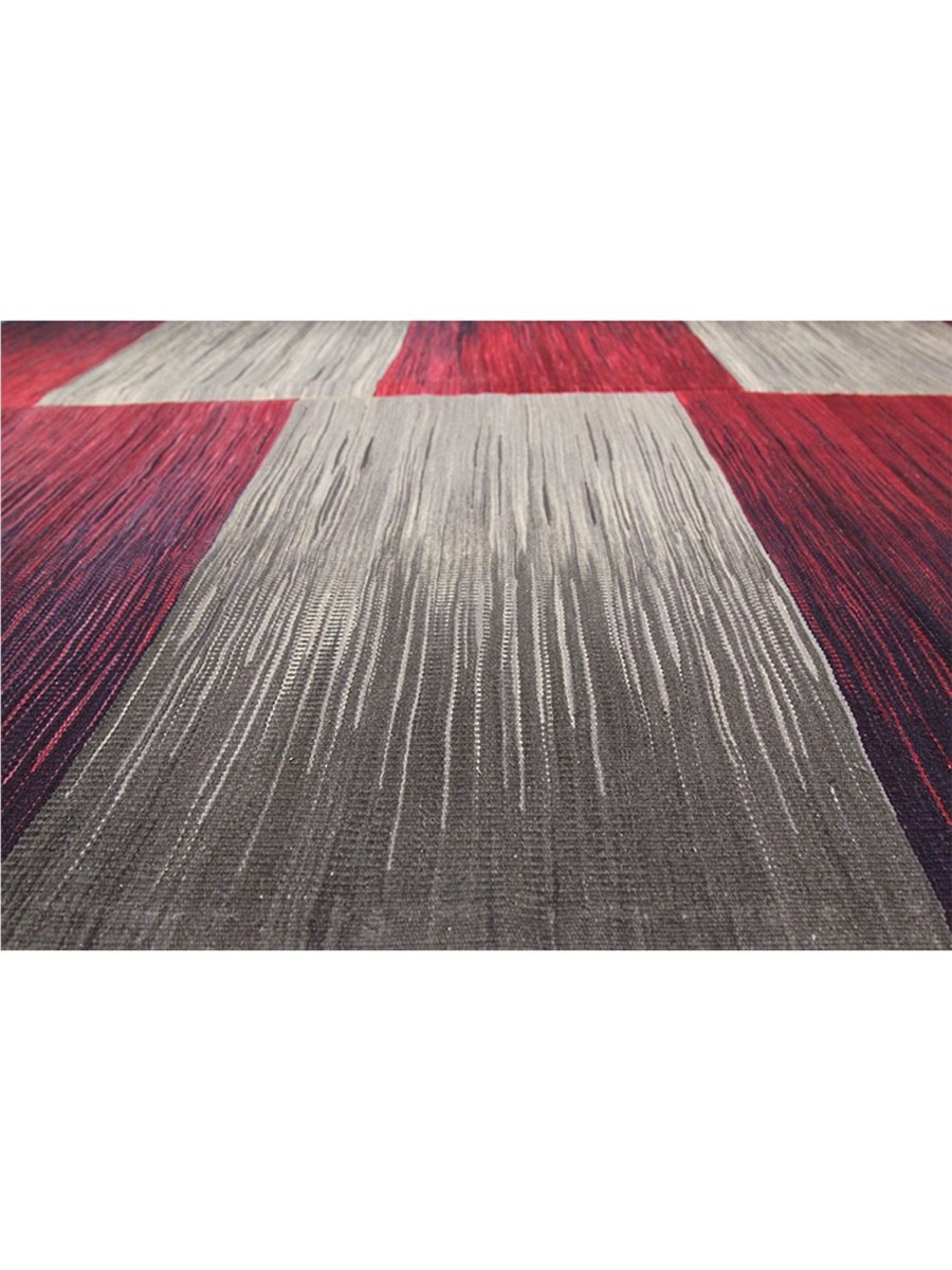 The 5x7 Persian Kilim Area Rug features a sophisticated design with alternating blocks of deep red and soft, silvery-gray tones. These color blocks are separated by subtle gradient shifts, enhancing the rug's sleek and minimalist aesthetic. The deep red areas blend into darker purples, while the silver shades gradually shift into lighter grays. Each block is complemented by smooth, flowing brushstrokes, adding texture and movement. This rug’s refined color palette and clean, symmetrical design make it an excellent choice for chic interiors. It brings balance and elegance to any space, offering versatility and style.