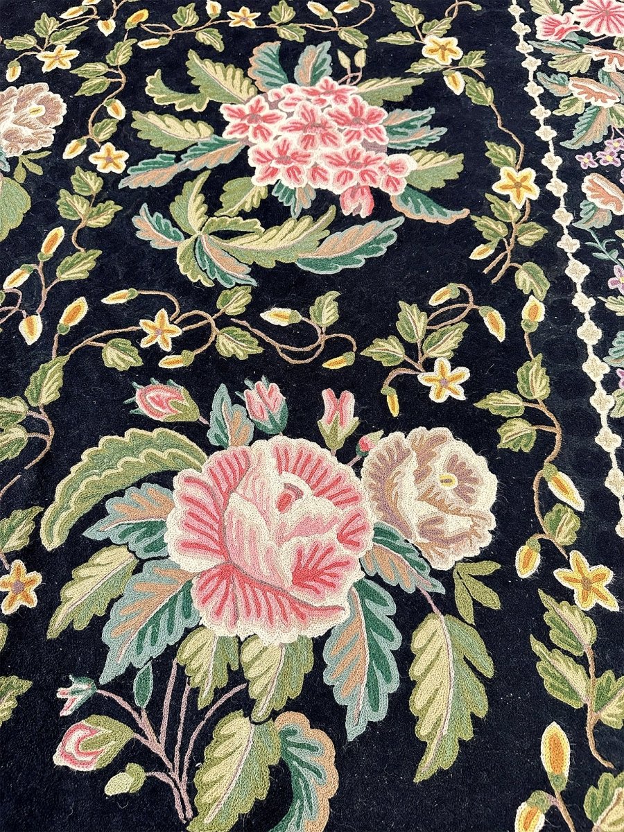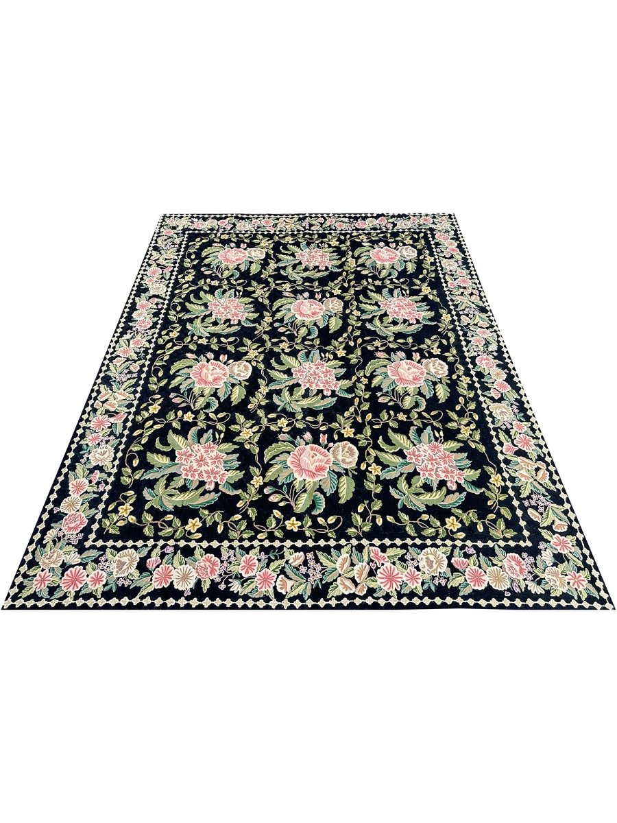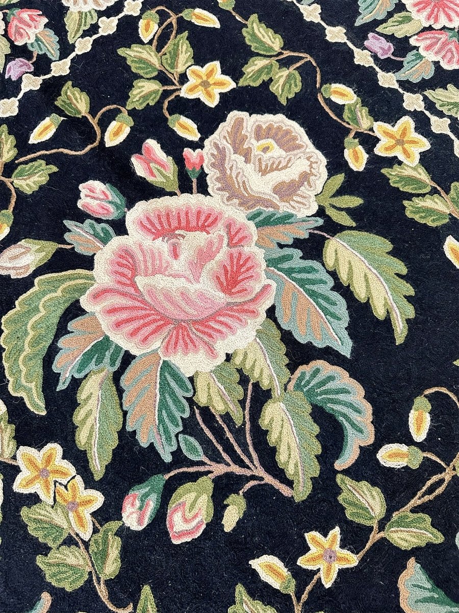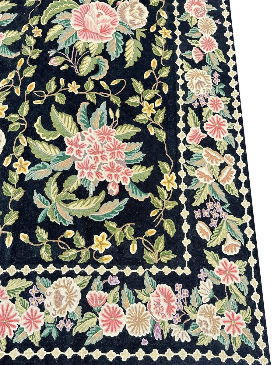 Bring timeless elegance into your home with this beautifully crafted 8x10 Chinese Chain Stitch Area Rug, made from wool and decorated with intricate floral artistry. The deep black field creates a bold foundation that enhances the colorful botanical motifs arranged throughout the design. Each floral cluster—featuring pink, cream, green, yellow, and soft pastel accents—is carefully worked using traditional chain-stitch embroidery, giving the rug a richly textured, handcrafted appearance.