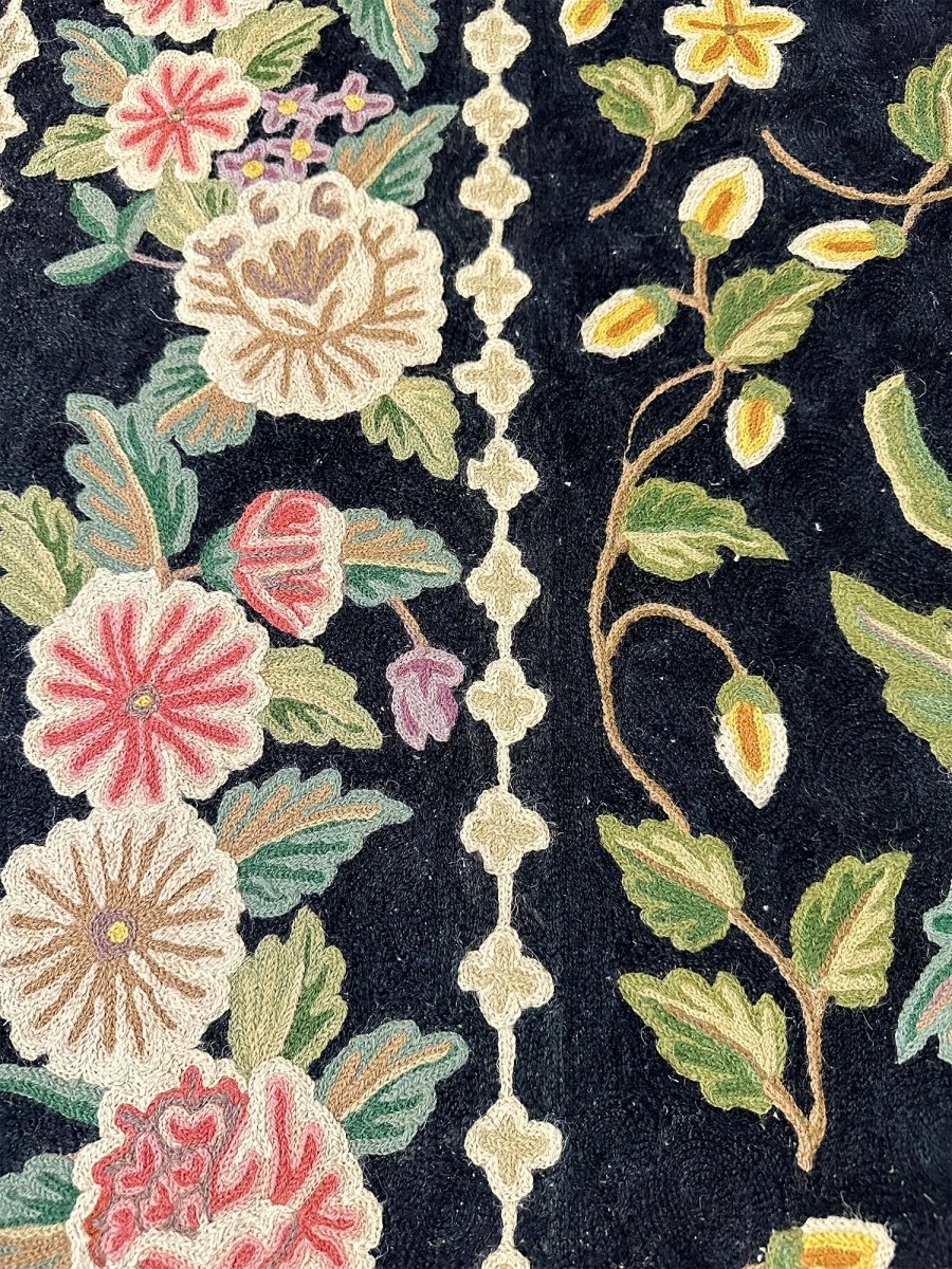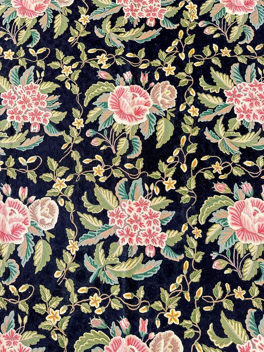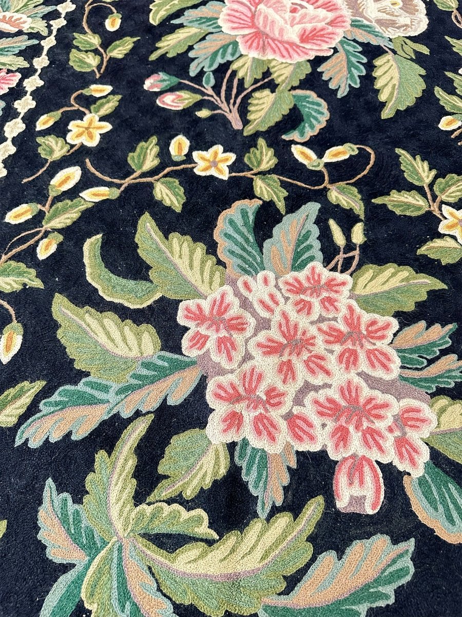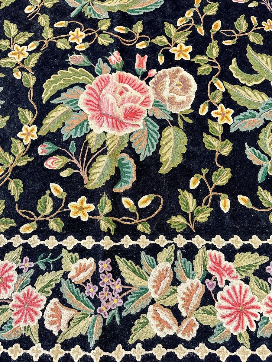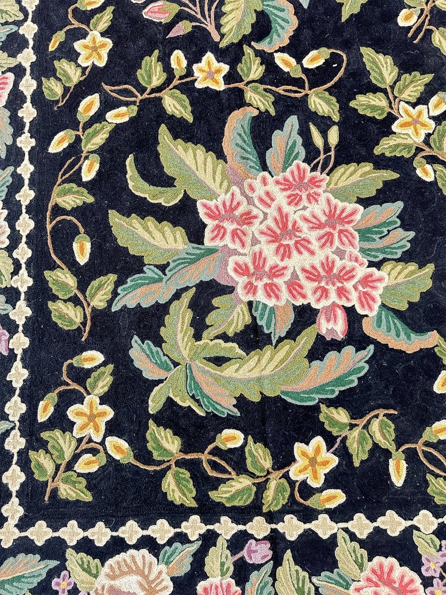Bring timeless elegance into your home with this beautifully crafted 8x10 Chinese Chain Stitch Area Rug, made from wool and decorated with intricate floral artistry. The deep black field creates a bold foundation that enhances the colorful botanical motifs arranged throughout the design. Each floral cluster—featuring pink, cream, green, yellow, and soft pastel accents—is carefully worked using traditional chain-stitch embroidery, giving the rug a richly textured, handcrafted appearance.