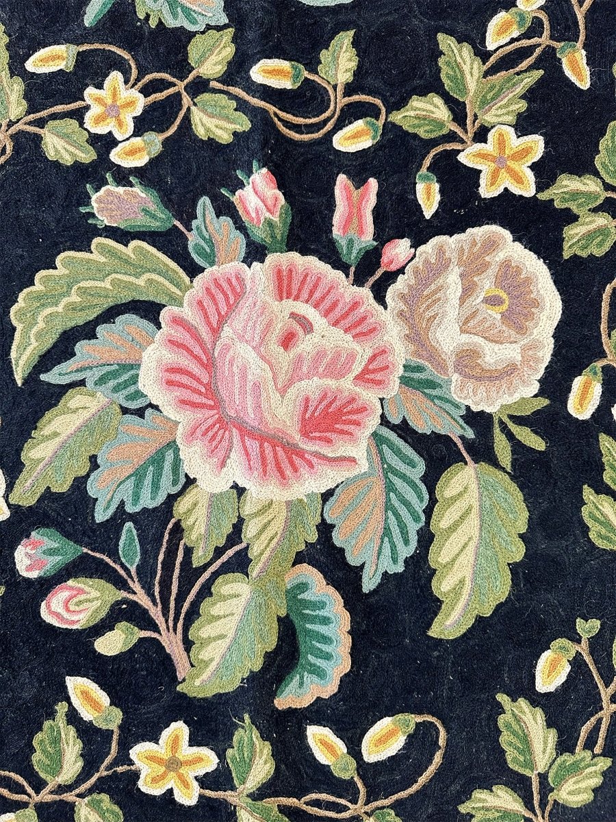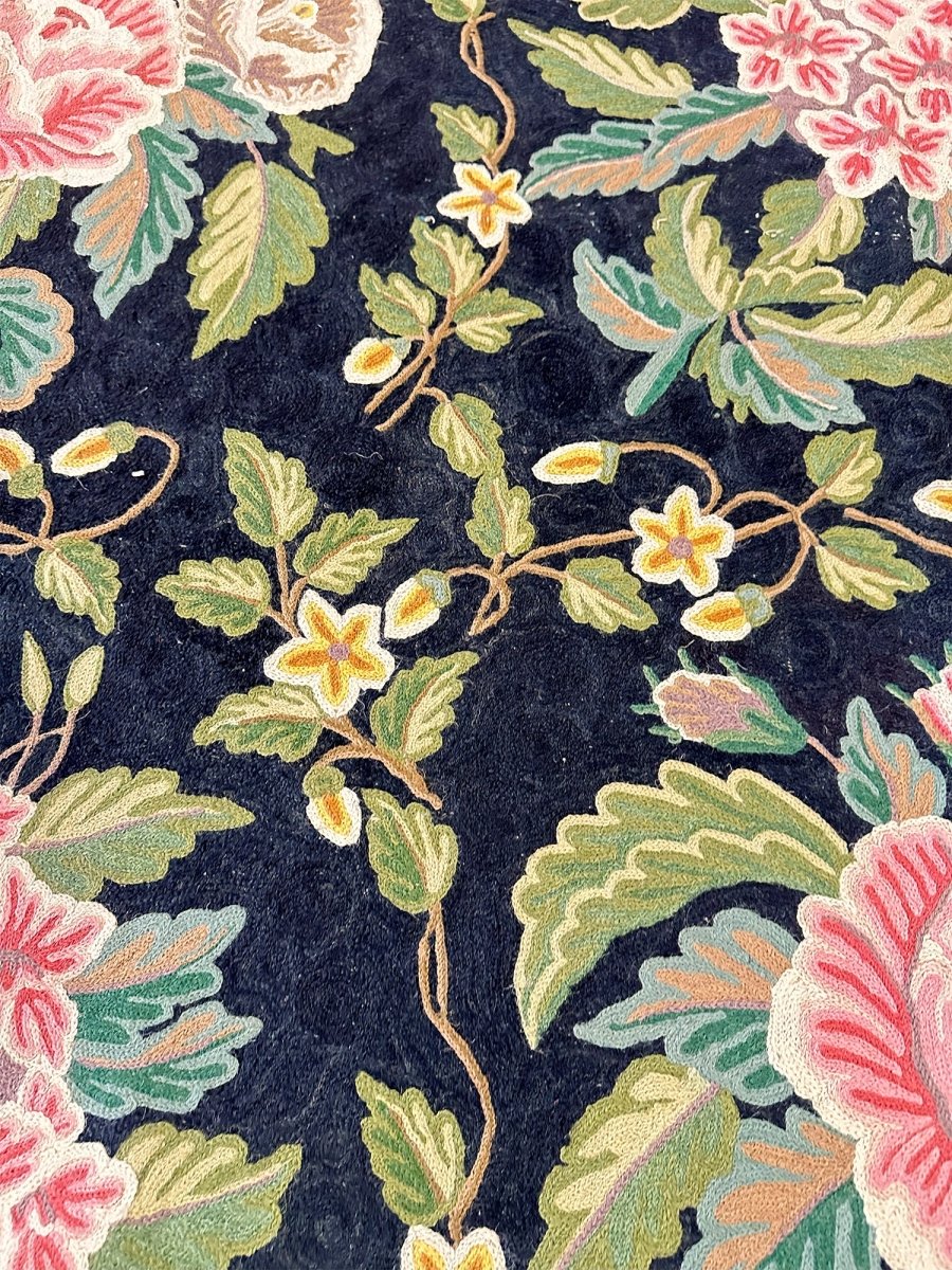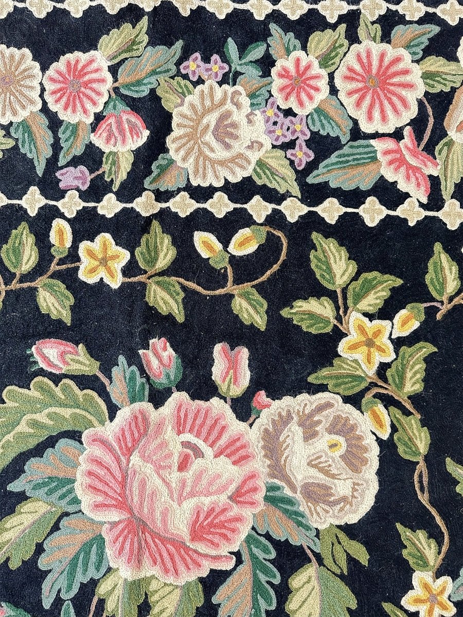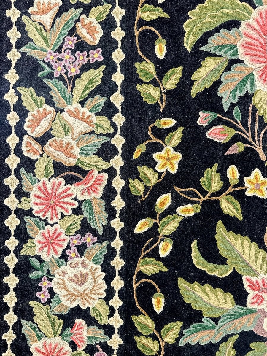 Bring timeless elegance into your home with this beautifully crafted 8x10 Chinese Chain Stitch Area Rug, made from wool and decorated with intricate floral artistry. The deep black field creates a bold foundation that enhances the colorful botanical motifs arranged throughout the design. Each floral cluster—featuring pink, cream, green, yellow, and soft pastel accents—is carefully worked using traditional chain-stitch embroidery, giving the rug a richly textured, handcrafted appearance.
