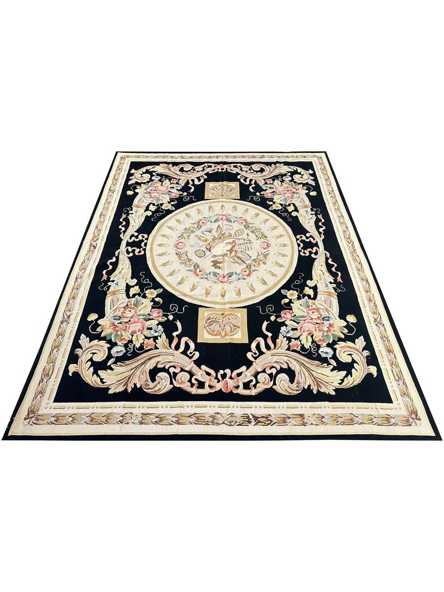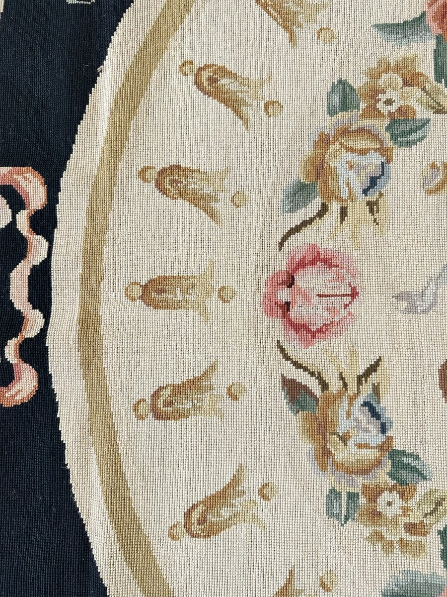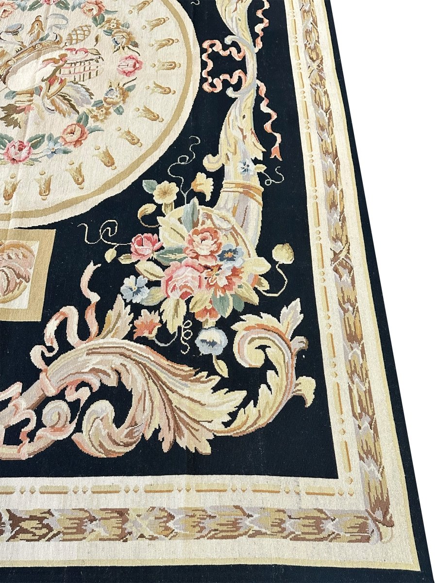 The deep black primary field provides a dramatic backdrop, enhancing the richness of the design. At the center, an ivory oval medallion displays a graceful arrangement of flowers, ribbons, and classical motifs, surrounded by a wreath of multicolored blooms in pink, blue, gold, and soft green. Large cornucopia-style bouquets in each corner echo the central theme, adding harmony and visual balance.