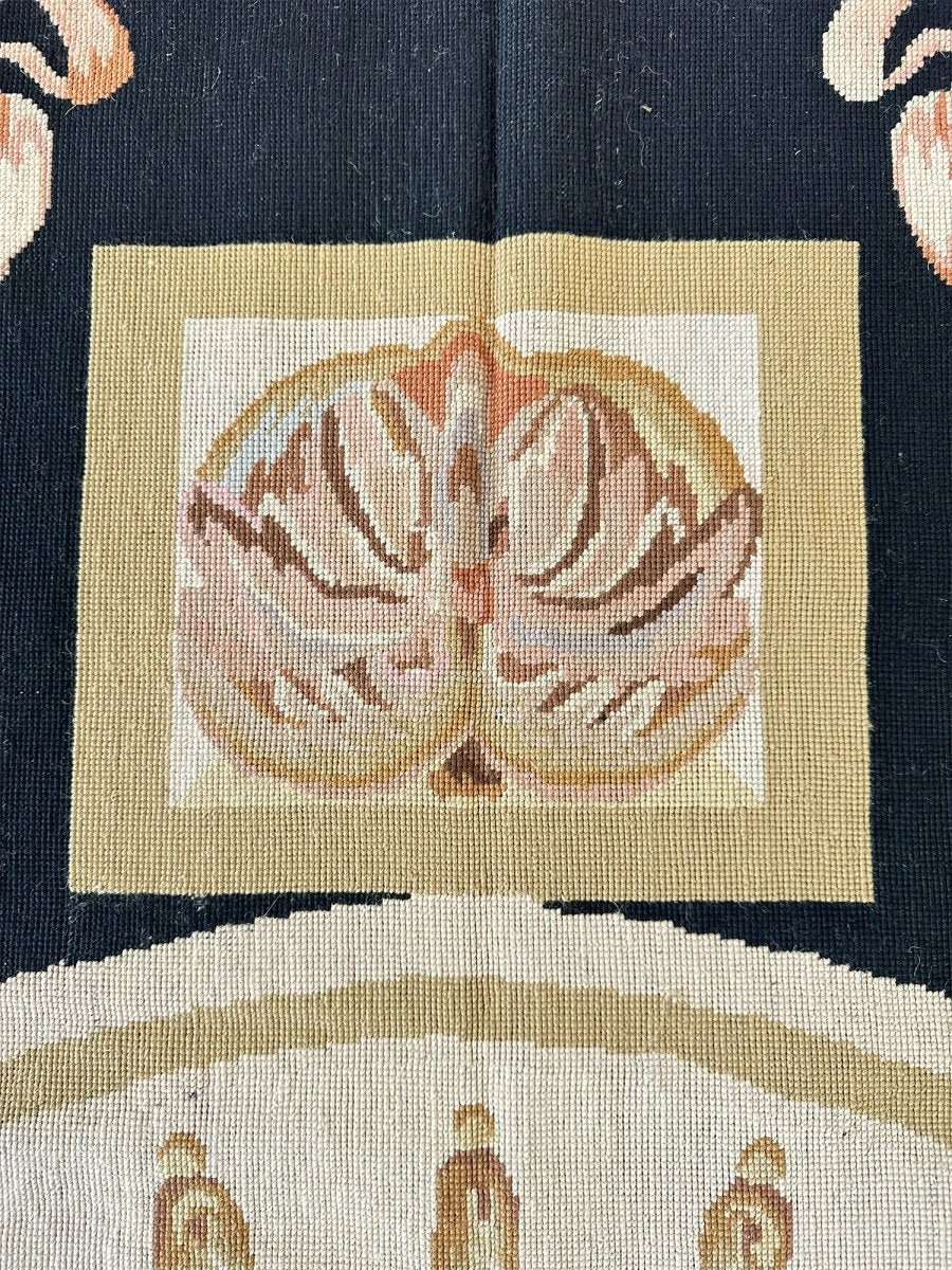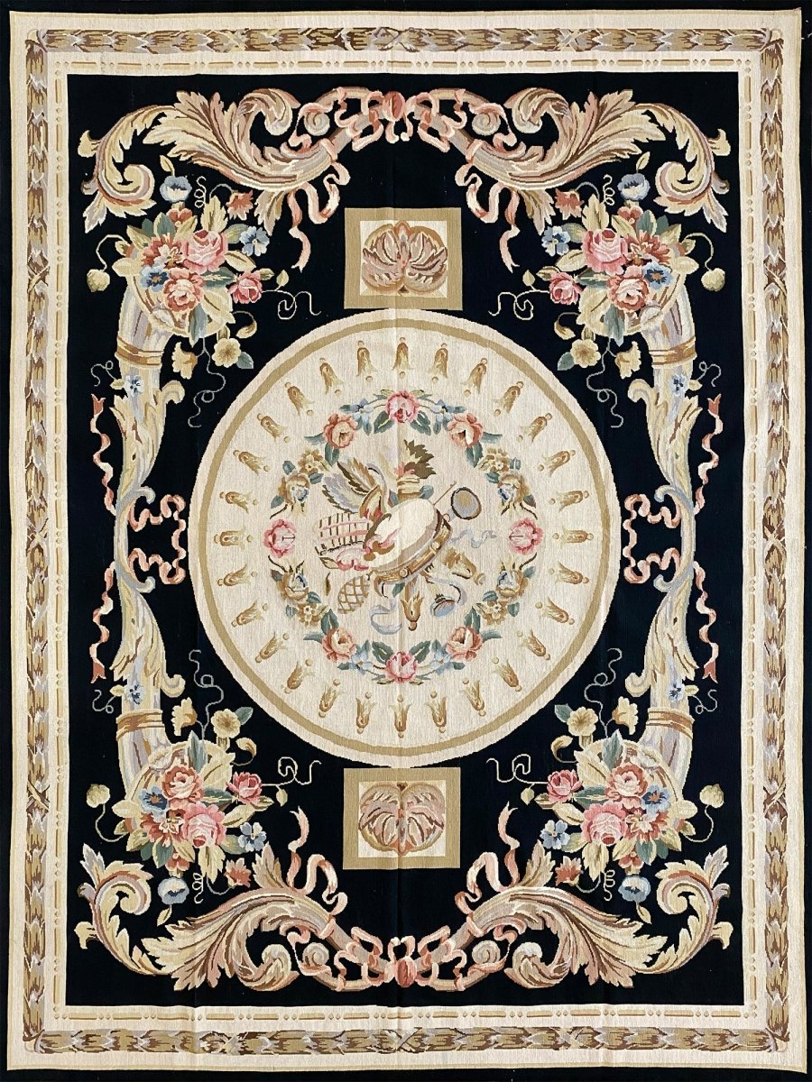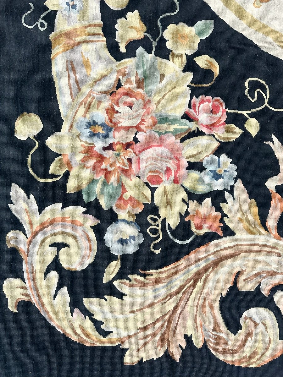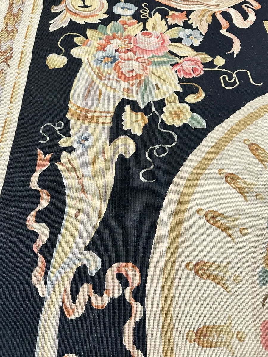 The deep black primary field provides a dramatic backdrop, enhancing the richness of the design. At the center, an ivory oval medallion displays a graceful arrangement of flowers, ribbons, and classical motifs, surrounded by a wreath of multicolored blooms in pink, blue, gold, and soft green. Large cornucopia-style bouquets in each corner echo the central theme, adding harmony and visual balance.