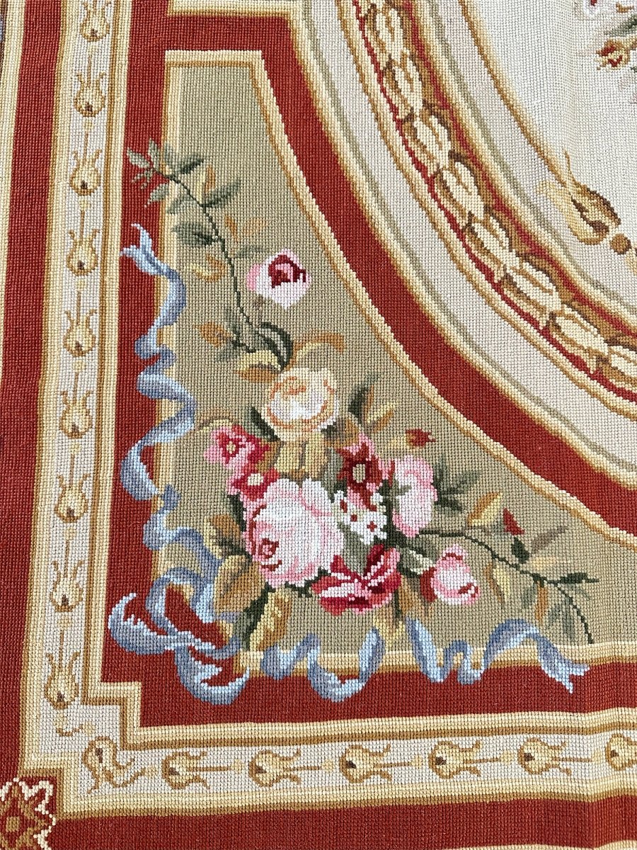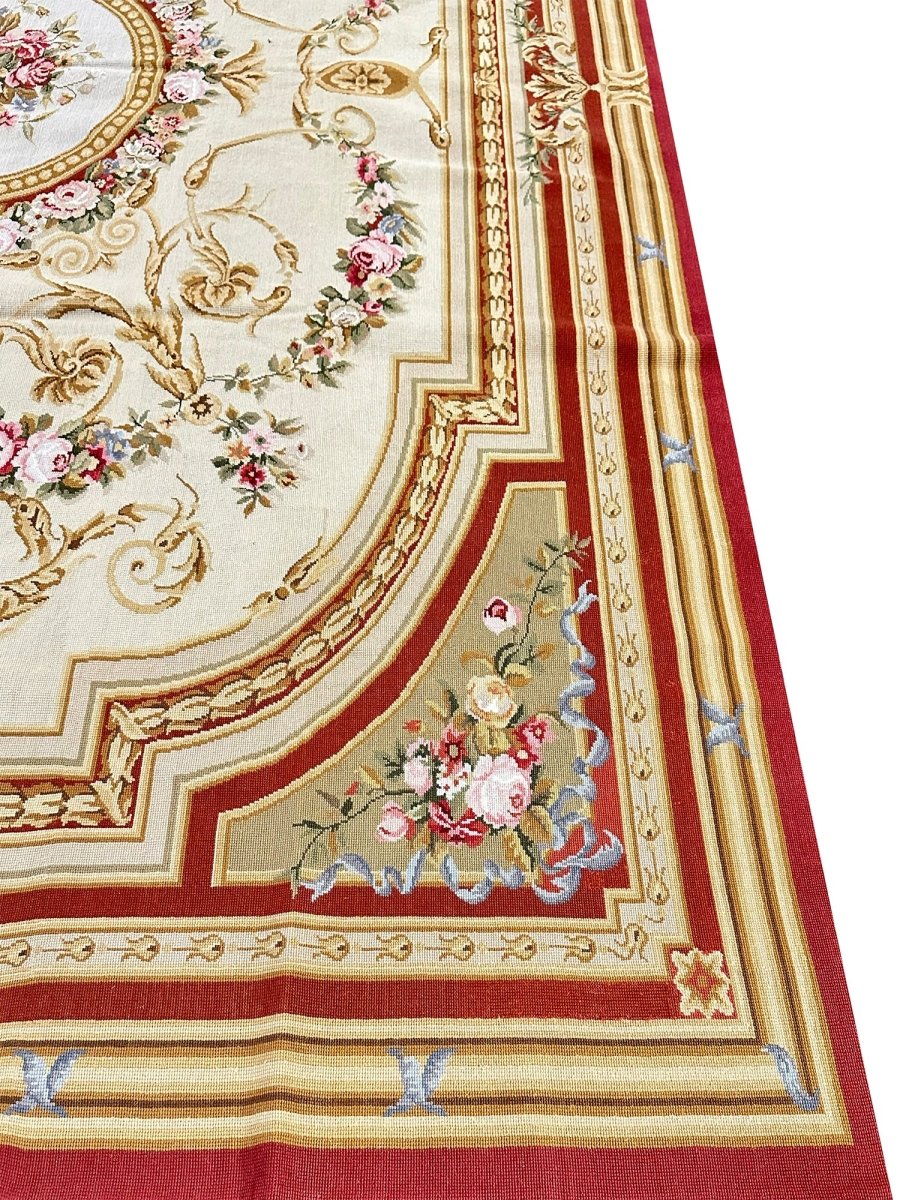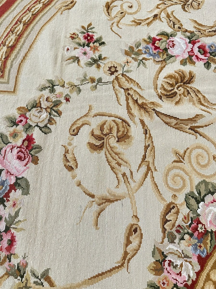 The design is centered around a circular floral medallion filled with layered rose motifs, framed by ornate scrollwork, acanthus leaves, and garlanded detailing. A creamy-toned interior provides a luminous foundation for the intricate pattern, while surrounding red accents add warmth and depth throughout the borders and framing elements.