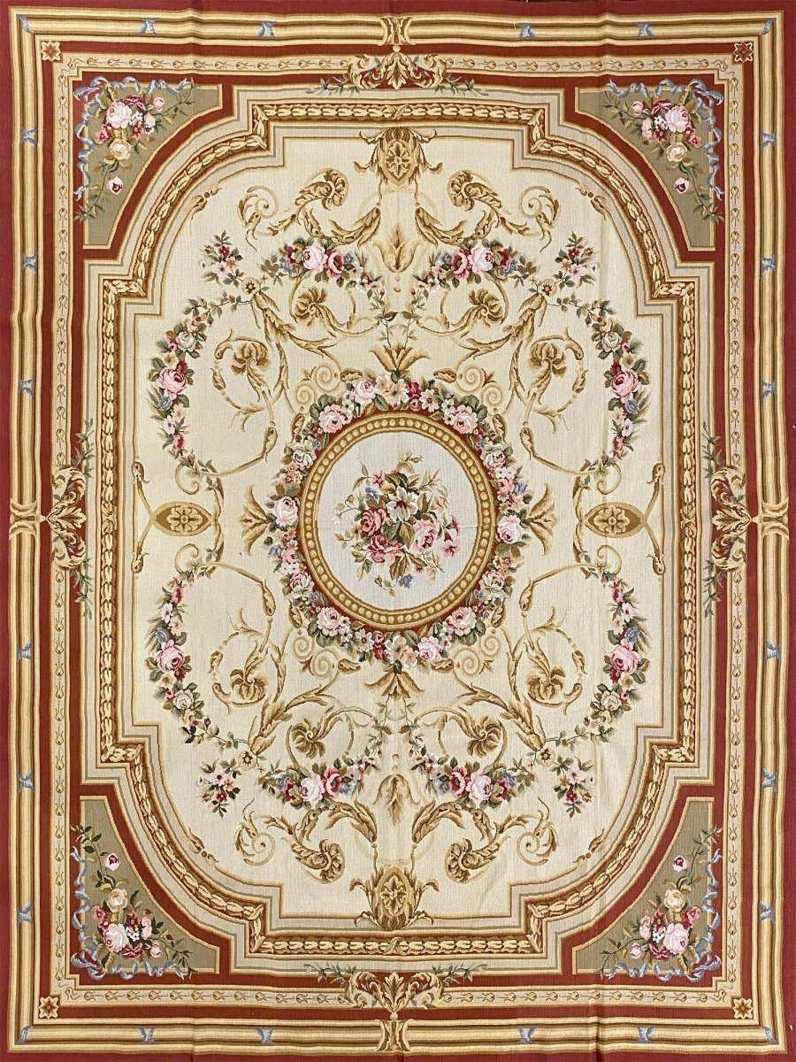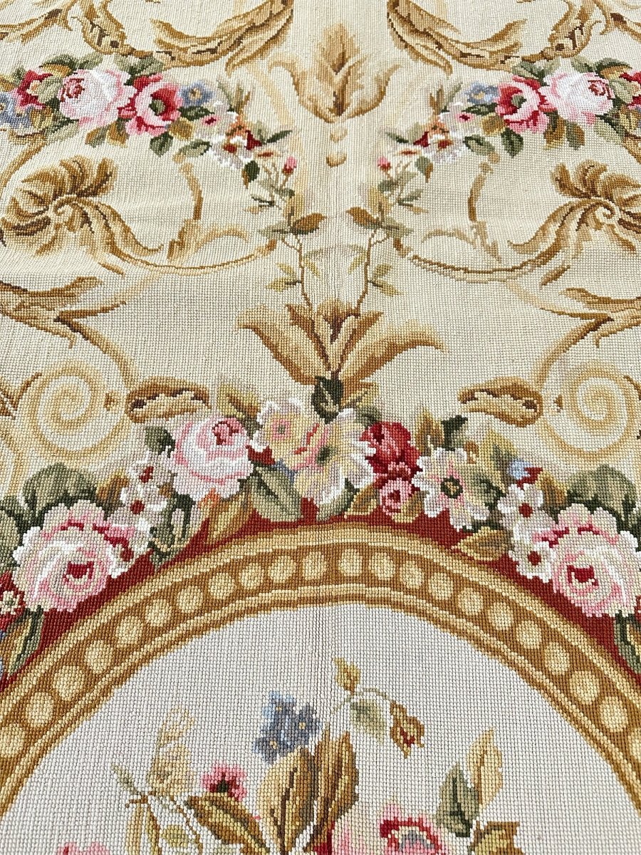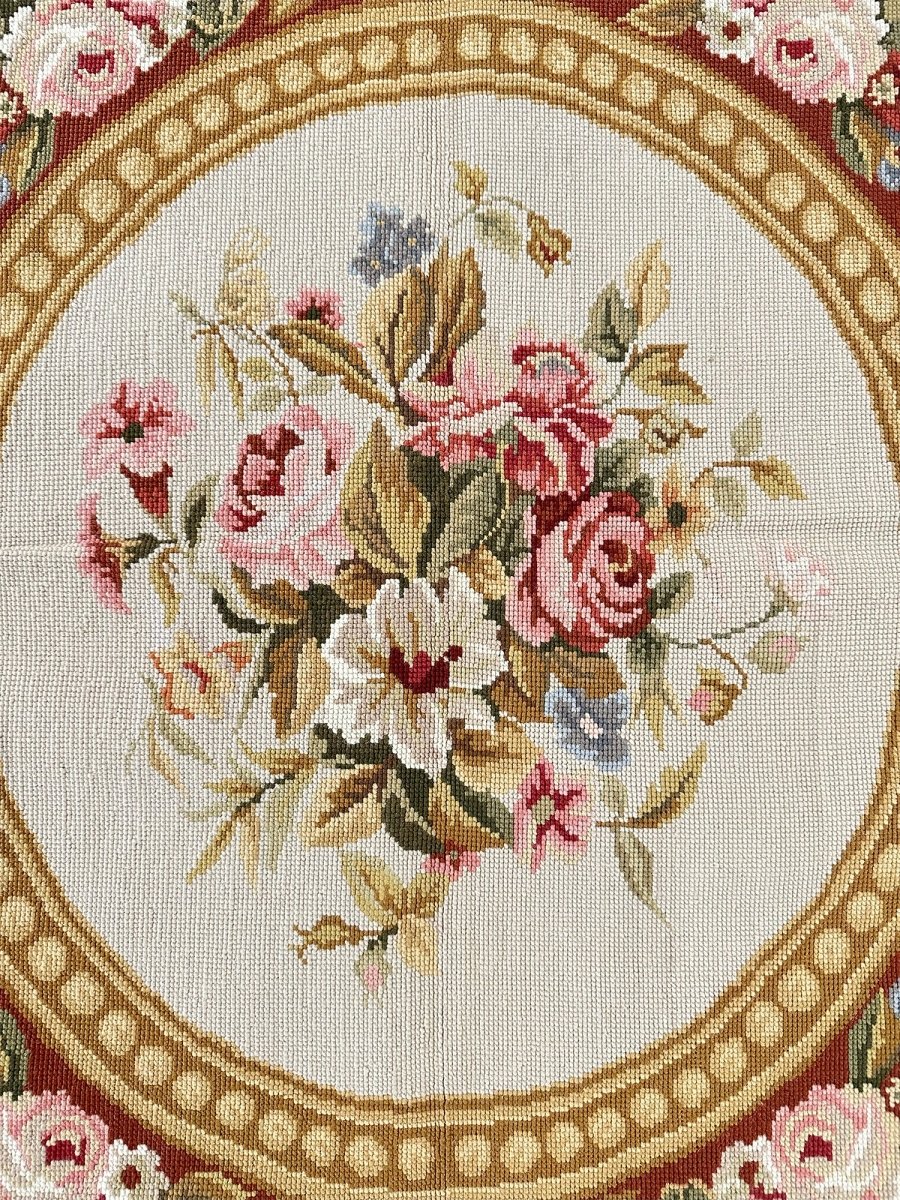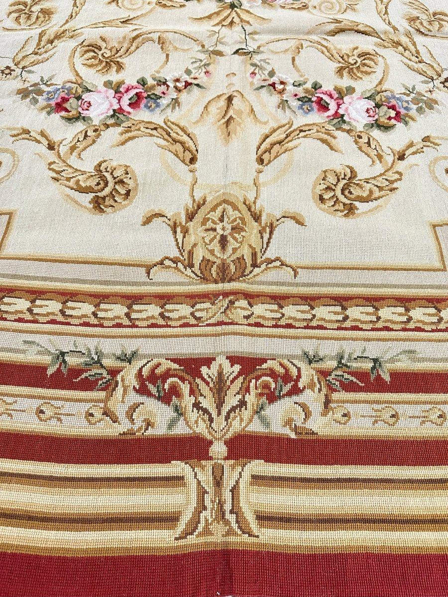The design is centered around a circular floral medallion filled with layered rose motifs, framed by ornate scrollwork, acanthus leaves, and garlanded detailing. A creamy-toned interior provides a luminous foundation for the intricate pattern, while surrounding red accents add warmth and depth throughout the borders and framing elements.