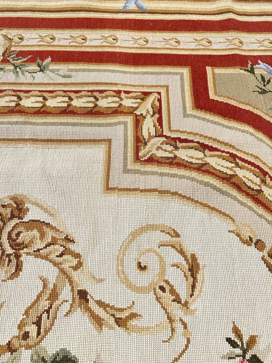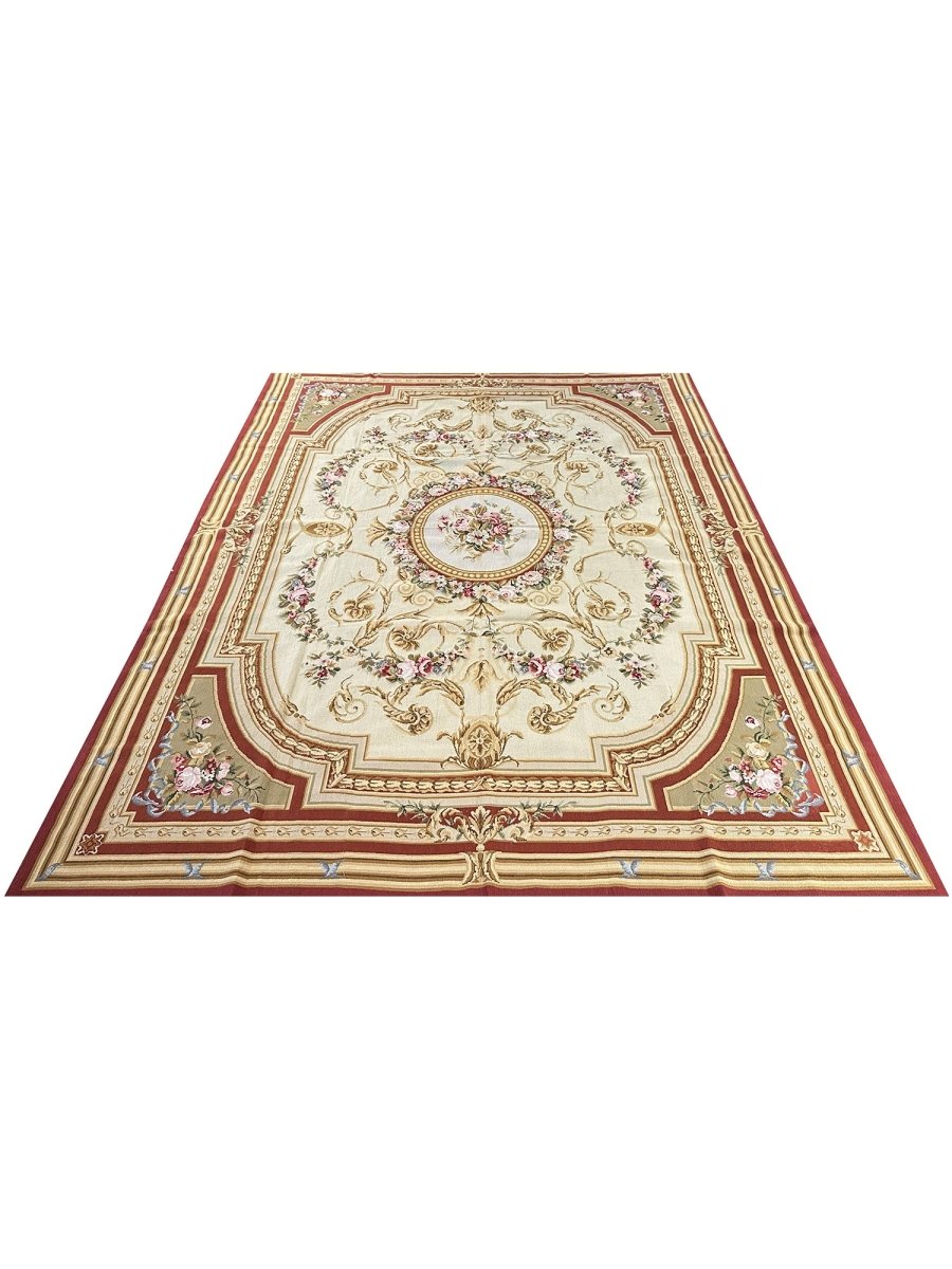 Multiple decorative bands and paneled borders create a sense of structure and dimension, enhanced by subtle gold-toned highlights and delicate floral flourishes. The balanced symmetry and fine detailing give the rug a tapestry-like appearance with a distinctly European character.