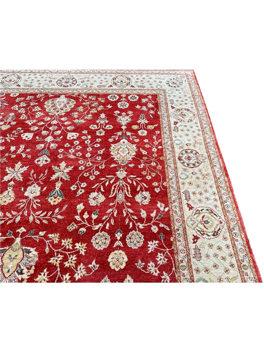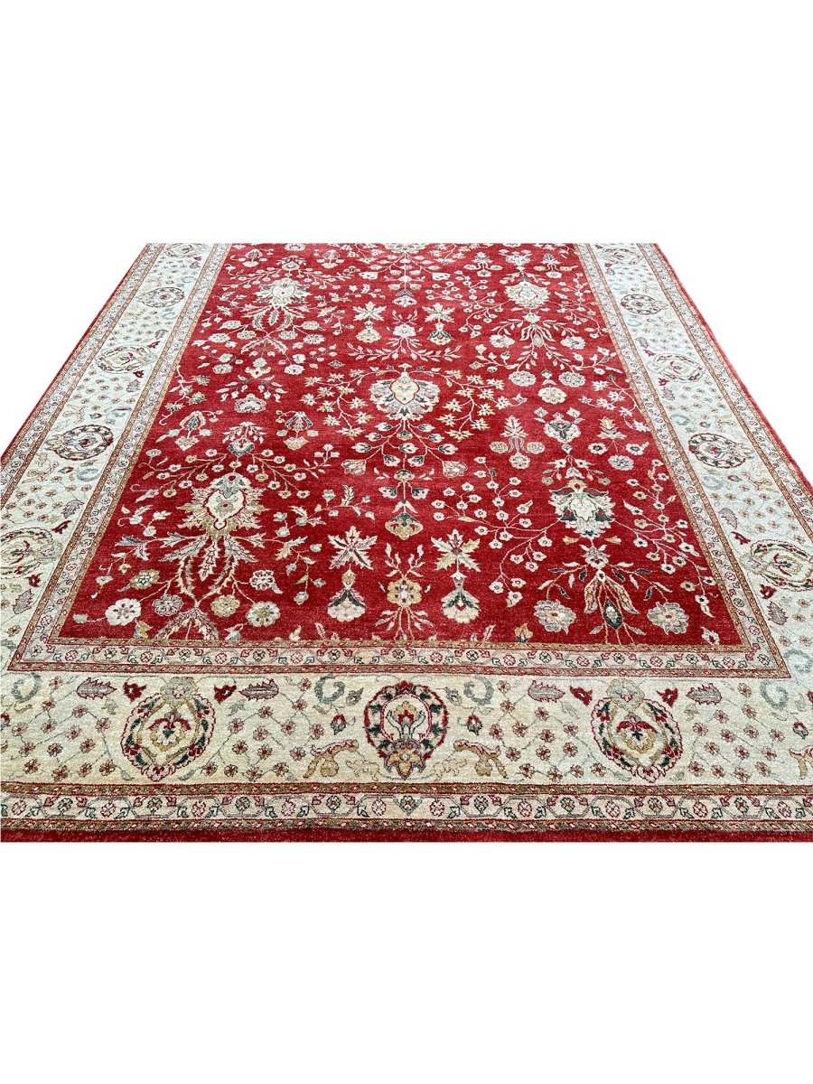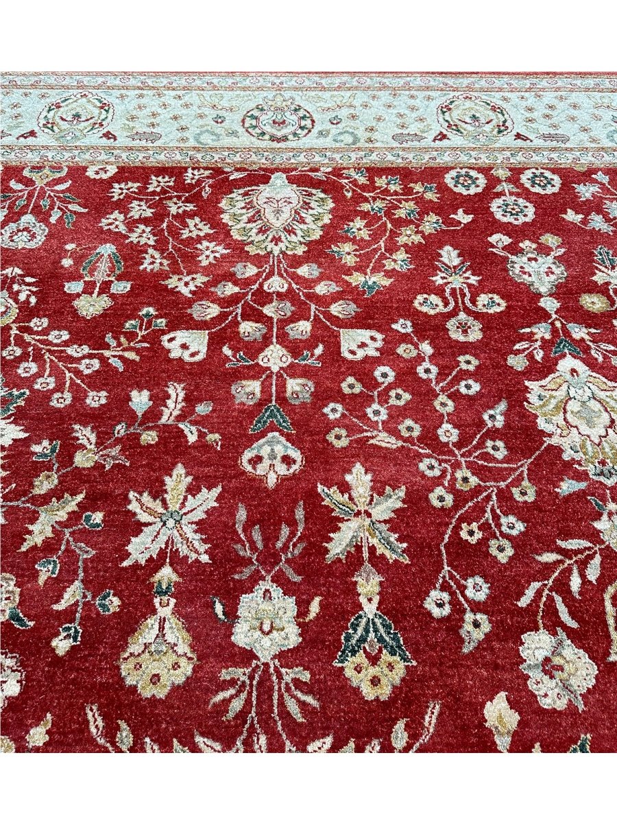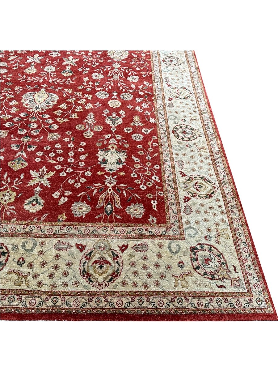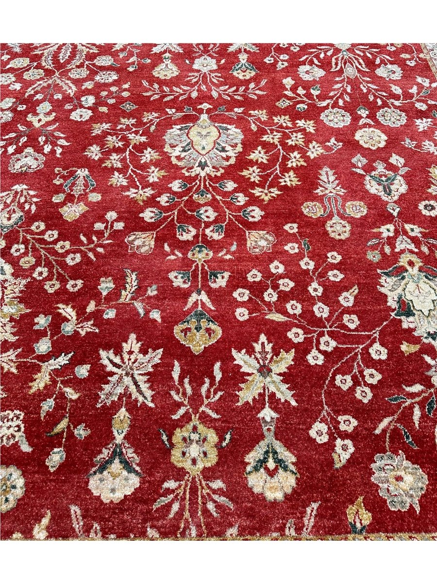 Bring warmth and elegance to your space with this striking 9x12 Handwoven Indian Agra area rug. Hand-knotted in India, this rug features a captivating geometric pattern that covers the entire field. While featuring repeating motifs reminiscent of traditional designs, the structured layout and elements give it a distinct geometric character. The rich, vibrant red field provides a bold and beautiful backdrop for the intricate details. A contrasting light-colored border, likely ivory or beige, frames the central design, adding balance and brightness. The pattern incorporates a variety of colors within the motifs, including shades of beige, gold, and blue, adding depth and visual interest. Creating a beautiful focal point and adding comfort. Enjoy the convenience of free US shipping.