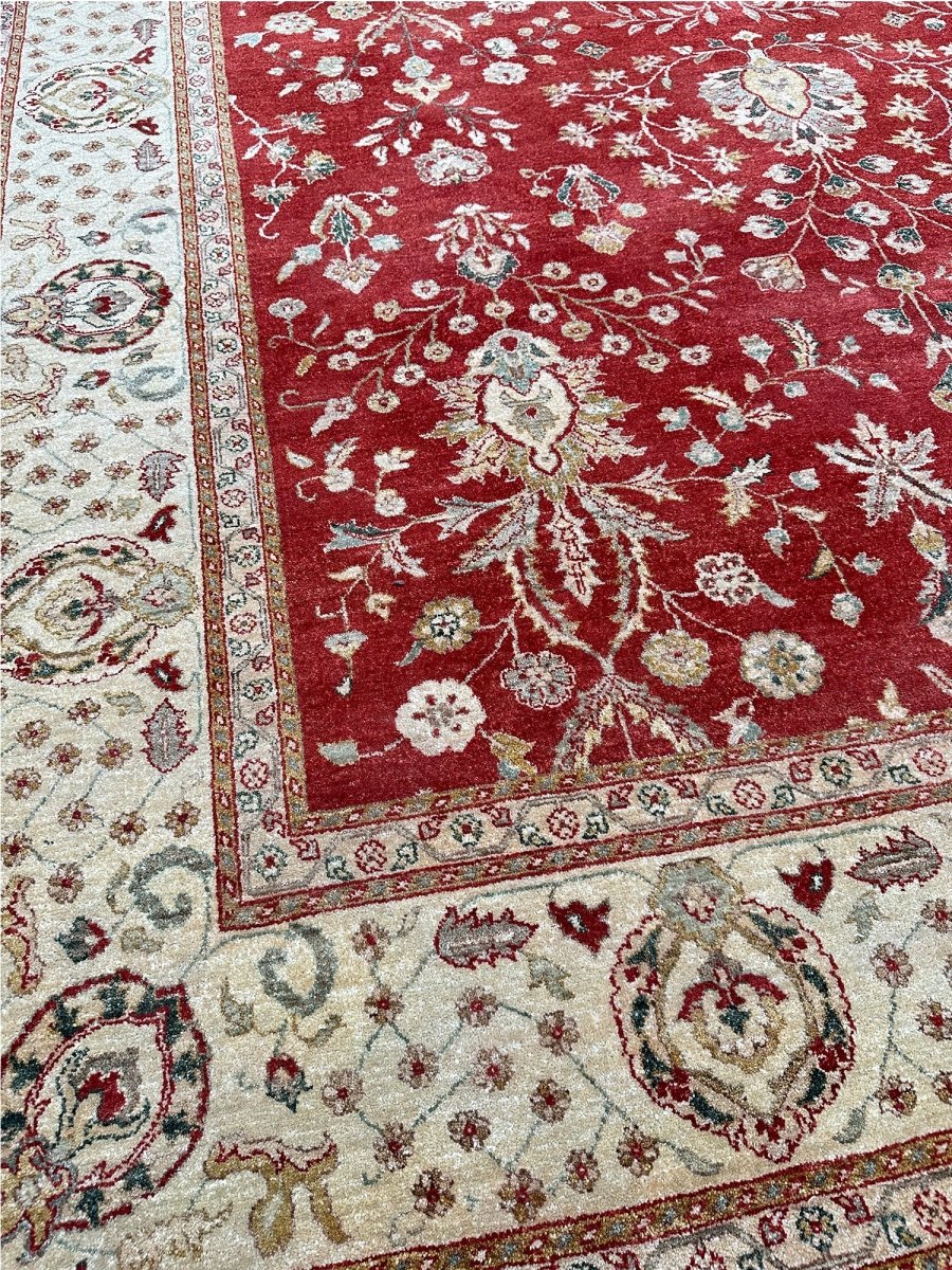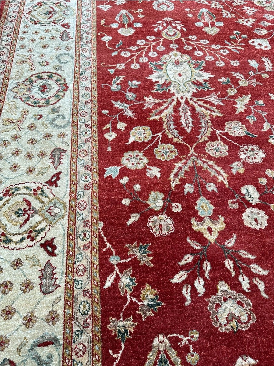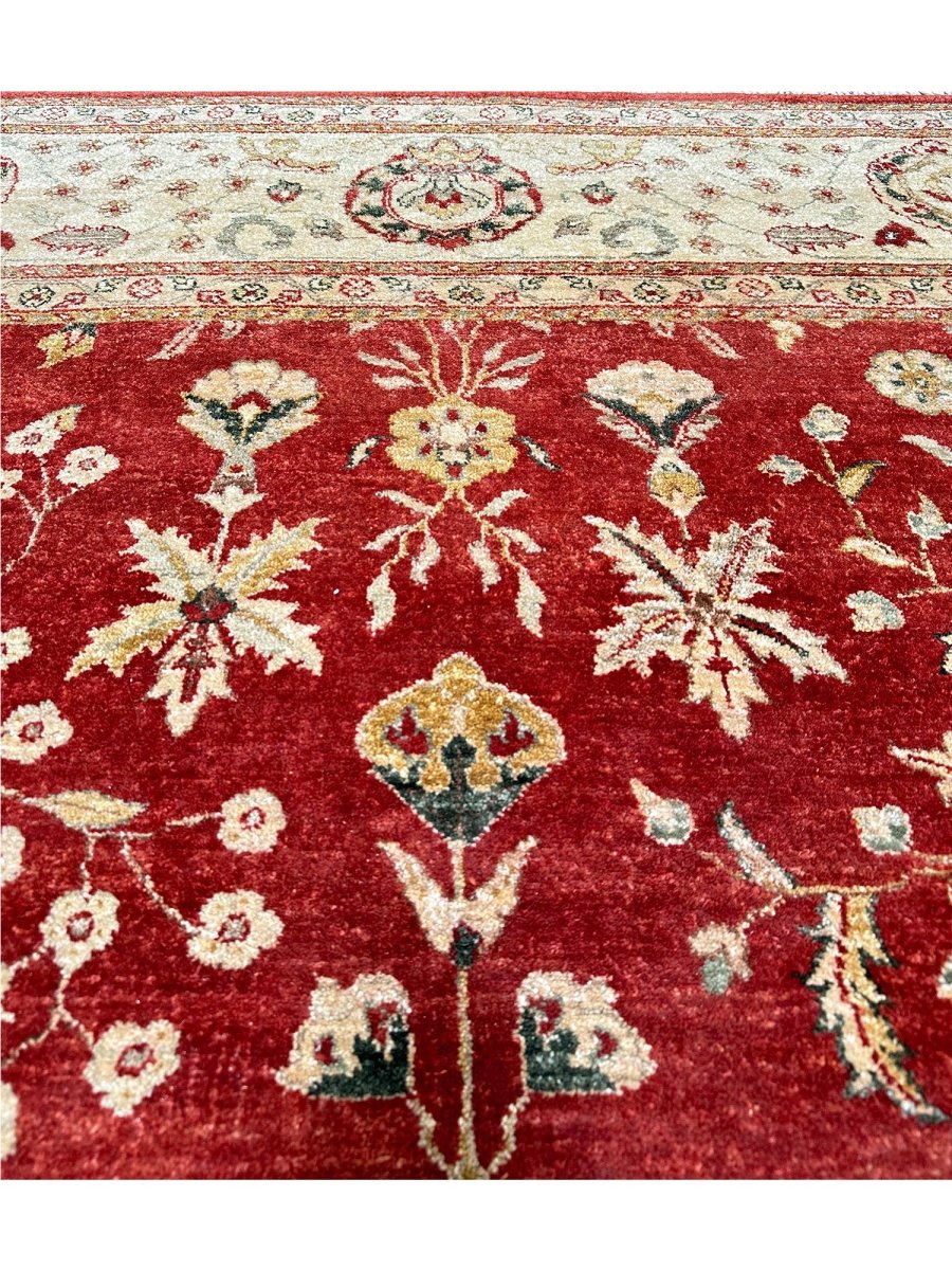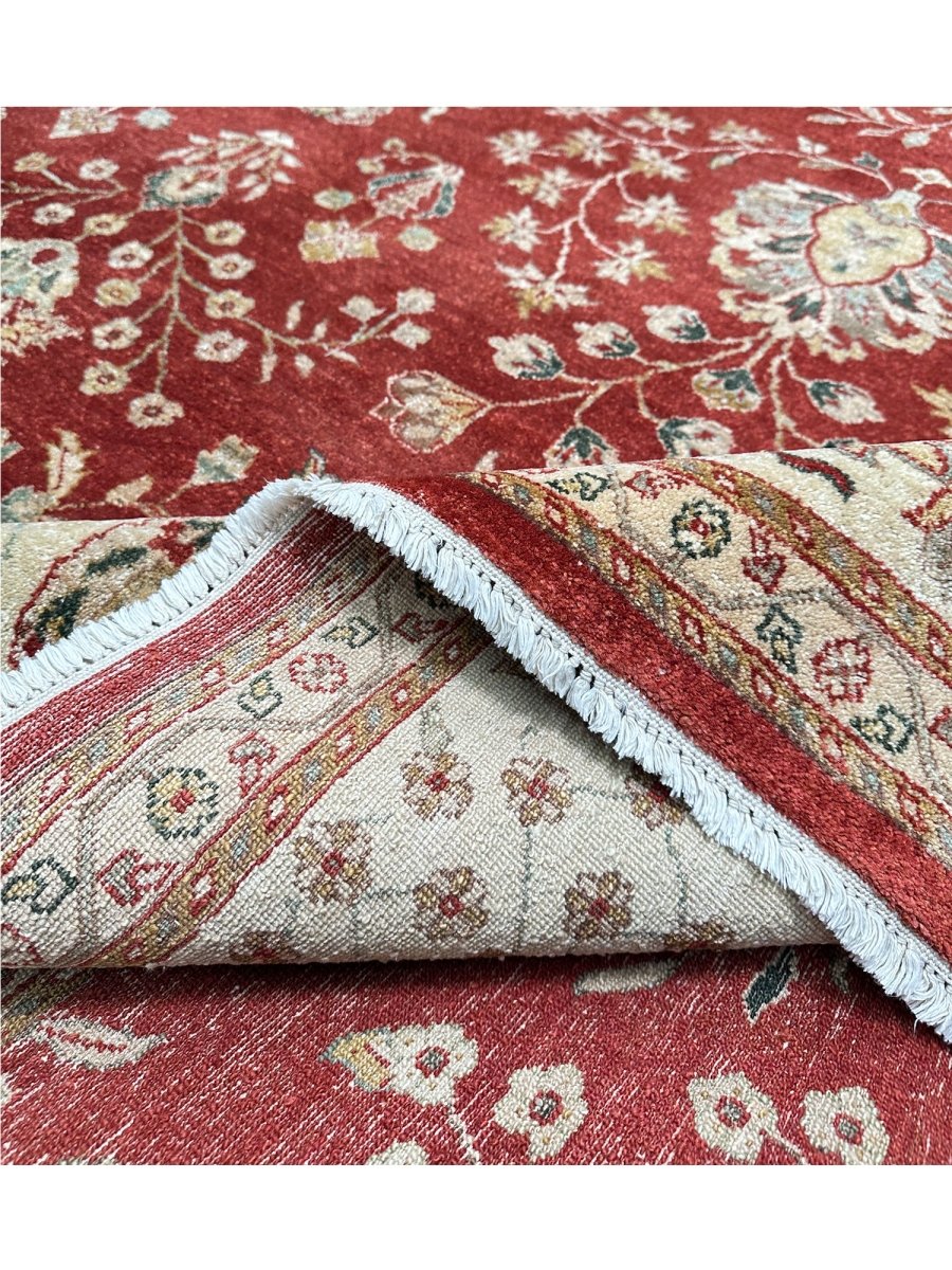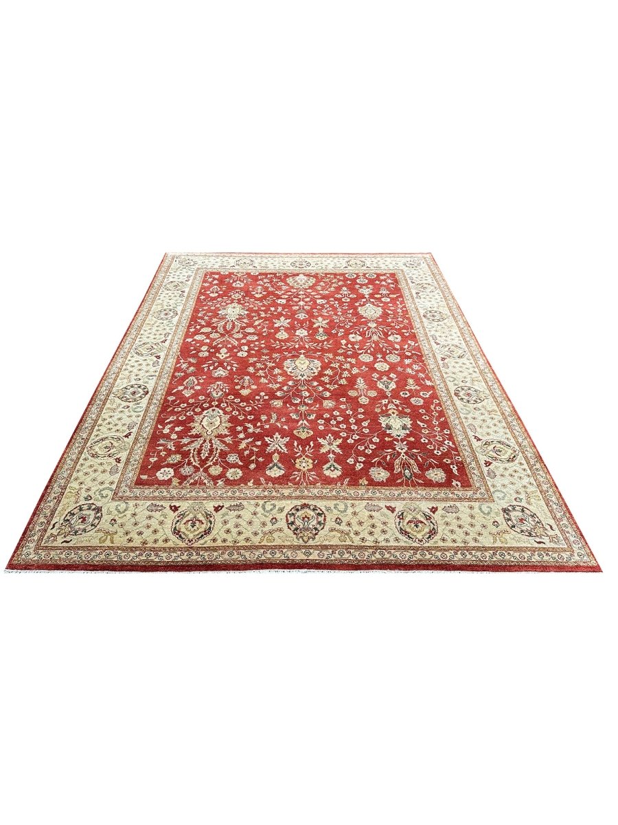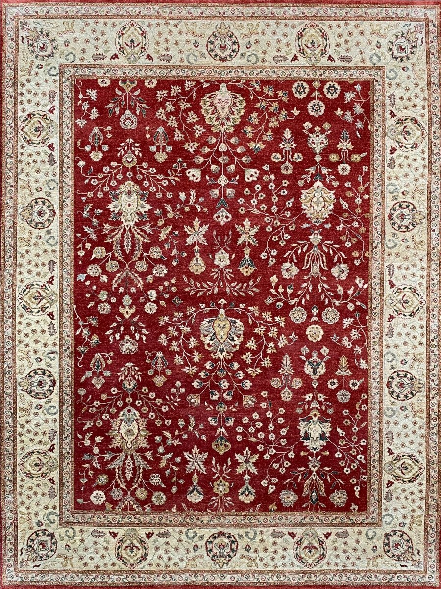 Bring warmth and elegance to your space with this striking 9x12 Handwoven Indian Agra area rug. Hand-knotted in India, this rug features a captivating geometric pattern that covers the entire field. While featuring repeating motifs reminiscent of traditional designs, the structured layout and elements give it a distinct geometric character. The rich, vibrant red field provides a bold and beautiful backdrop for the intricate details. A contrasting light-colored border, likely ivory or beige, frames the central design, adding balance and brightness. The pattern incorporates a variety of colors within the motifs, including shades of beige, gold, and blue, adding depth and visual interest. Creating a beautiful focal point and adding comfort. Enjoy the convenience of free US shipping.