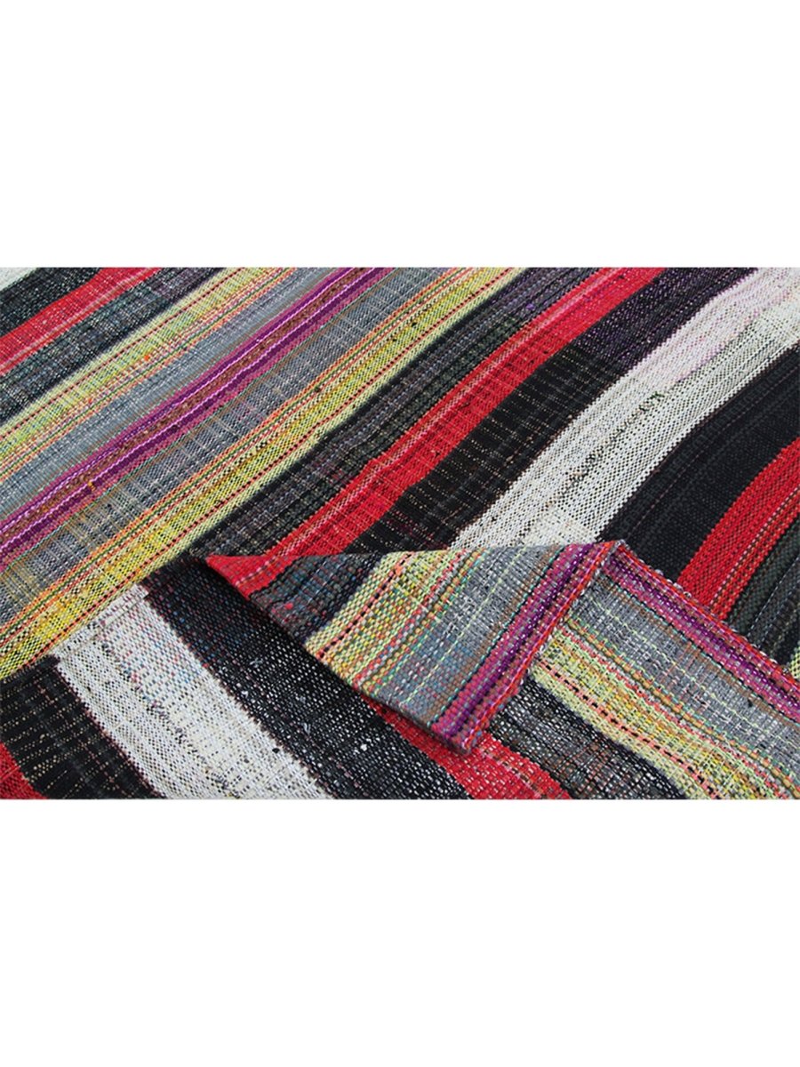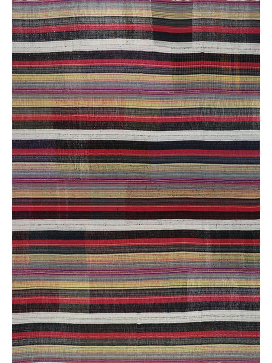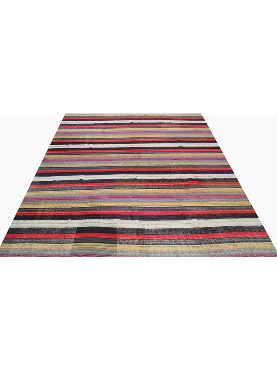 Add character to your interior with the 9x12 Persian Kilim Area Rug, handwoven in Persia using a premium cotton blend. This eclectic rug showcases a vibrant striped pattern that blends bold shades of red, black, and white with subtle accents of yellow, purple, and earthy hues. The alternating stripe thicknesses and intricate woven details add texture and visual complexity. Some sections feature gradient-like shifts that seamlessly blend colors, enhancing the dynamic appeal. This vibrant yet well-balanced design makes the rug an ideal centerpiece for eclectic, bohemian, or rustic interiors. Its durable construction ensures it stands up to daily wear while adding personality and charm to your living space.
