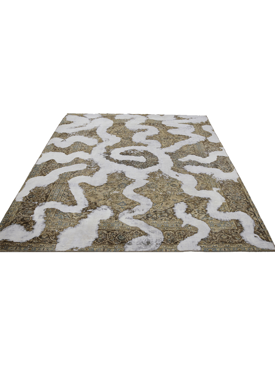The 9x12 Vintage Distressed Persian Area Rug is a one-of-a-kind piece, offering a captivating blend of Persian artistry and sleek distressed design. Hand-knotted in Persia from high-quality wool, this rug features a bold, distressed pattern with intricate floral motifs in soft beige, cream, and brown tones. The design incorporates striking floral elements that enhance the rug's vintage look, making it a standout addition to any room.