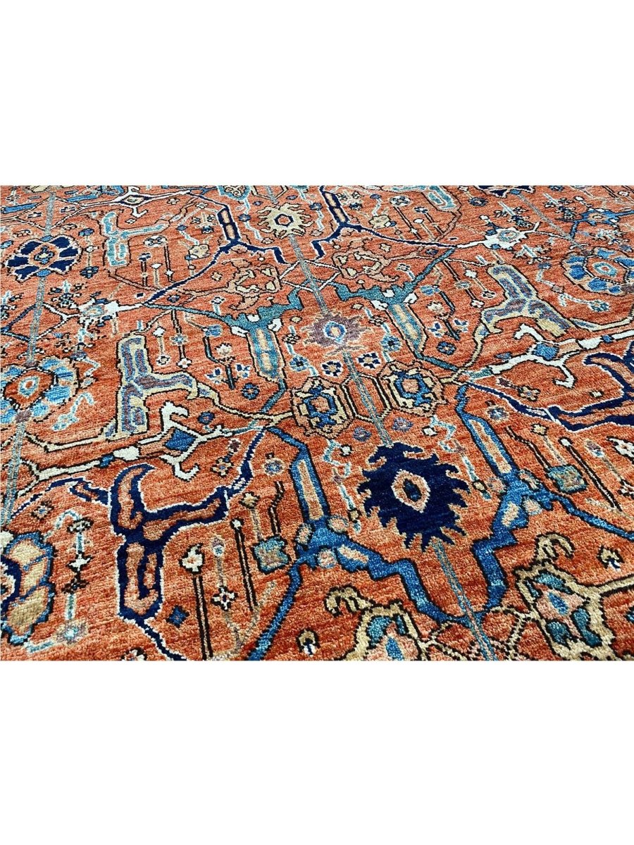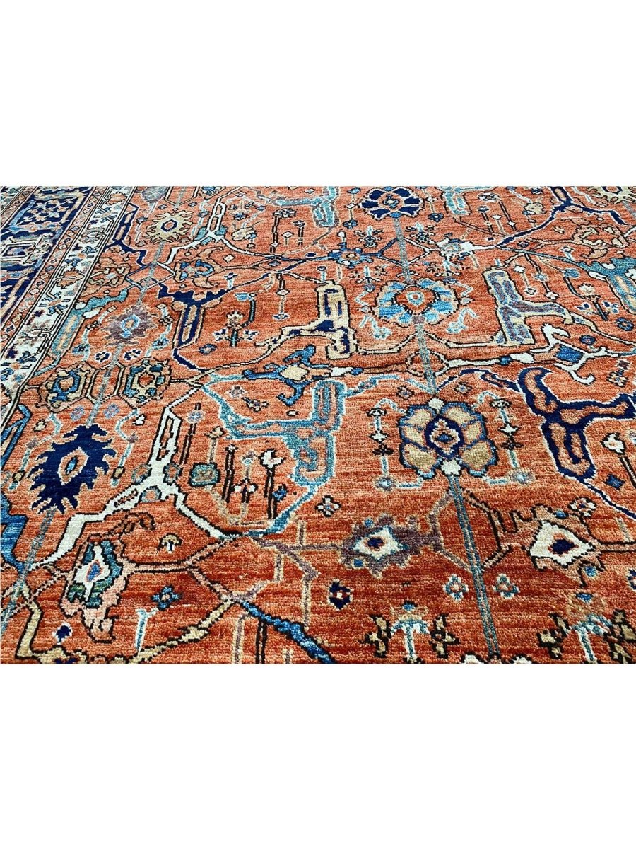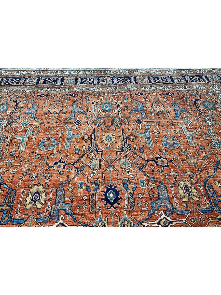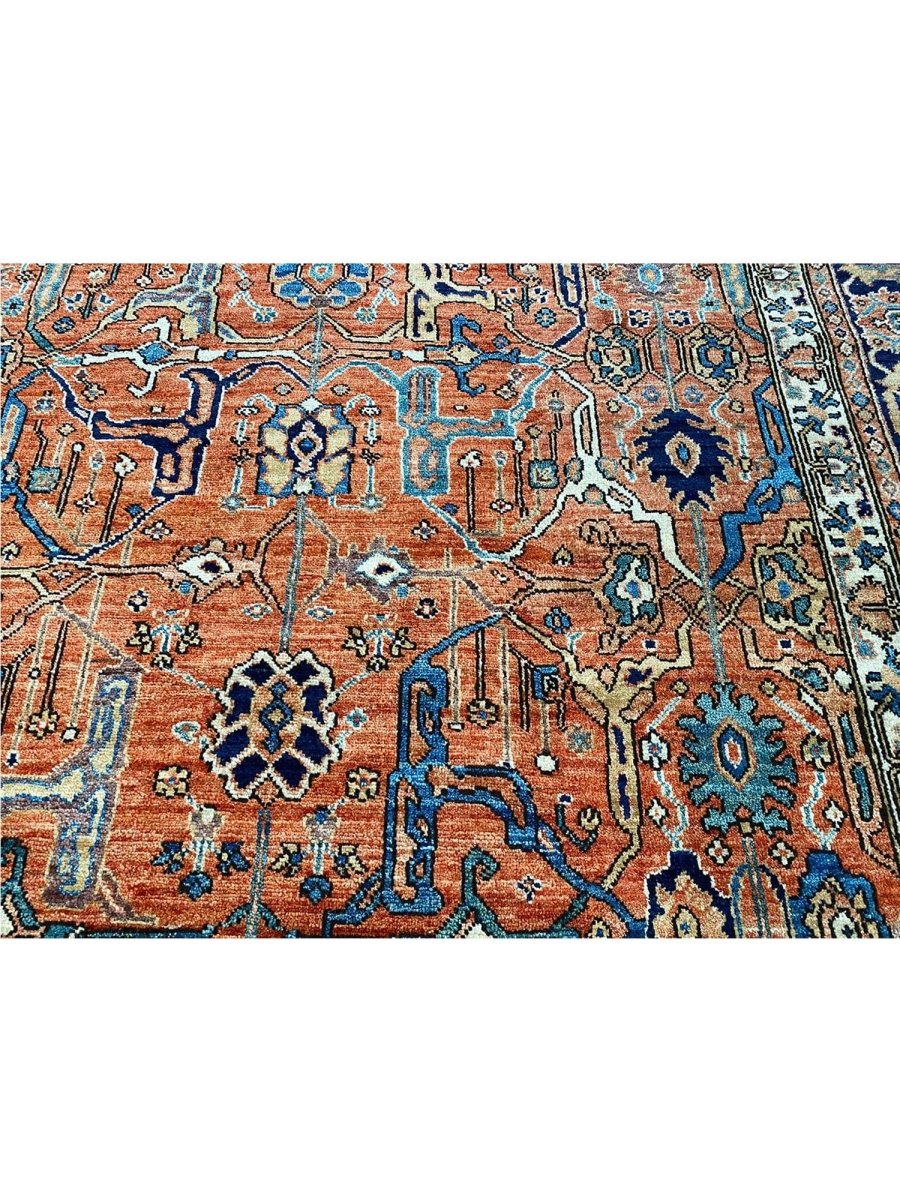 Experience the elegance of the 9x12 Handwoven Serapi Style Area Rug, a unique piece that brings traditional beauty to your home. Hand-knotted from quality wool, this beautiful rug boasts a geometric pattern that adds charm to any room. Ideal for grand living rooms, dining rooms, or as a focal point in your entranceway, it makes any space feel cozy and inviting. The stunning combination of rust, pink, blue, and ivory colors make it a great option for any style. This outstanding item not only beautifies your space but also stands as a stunning piece of art. Get free shipping in the US.