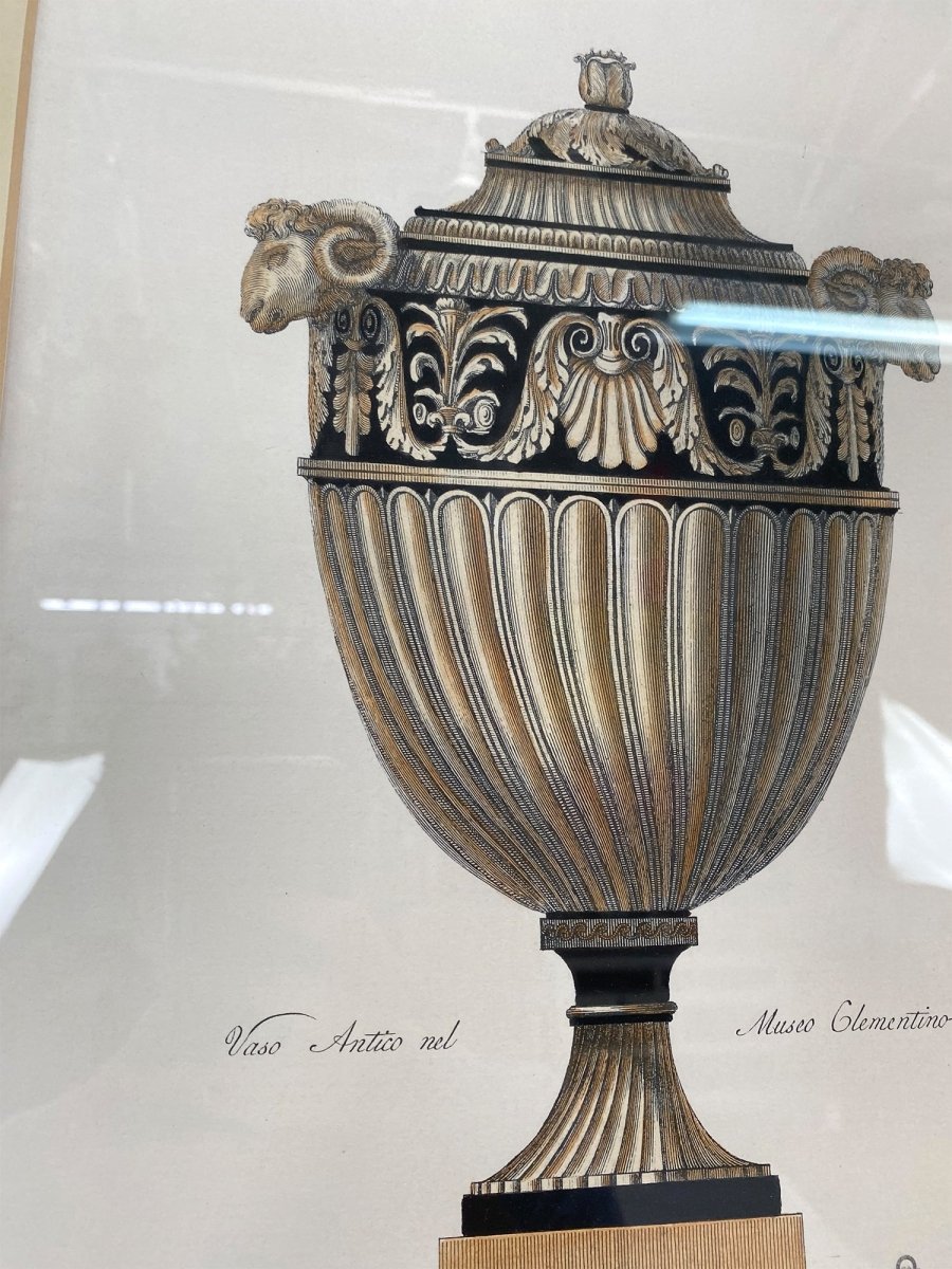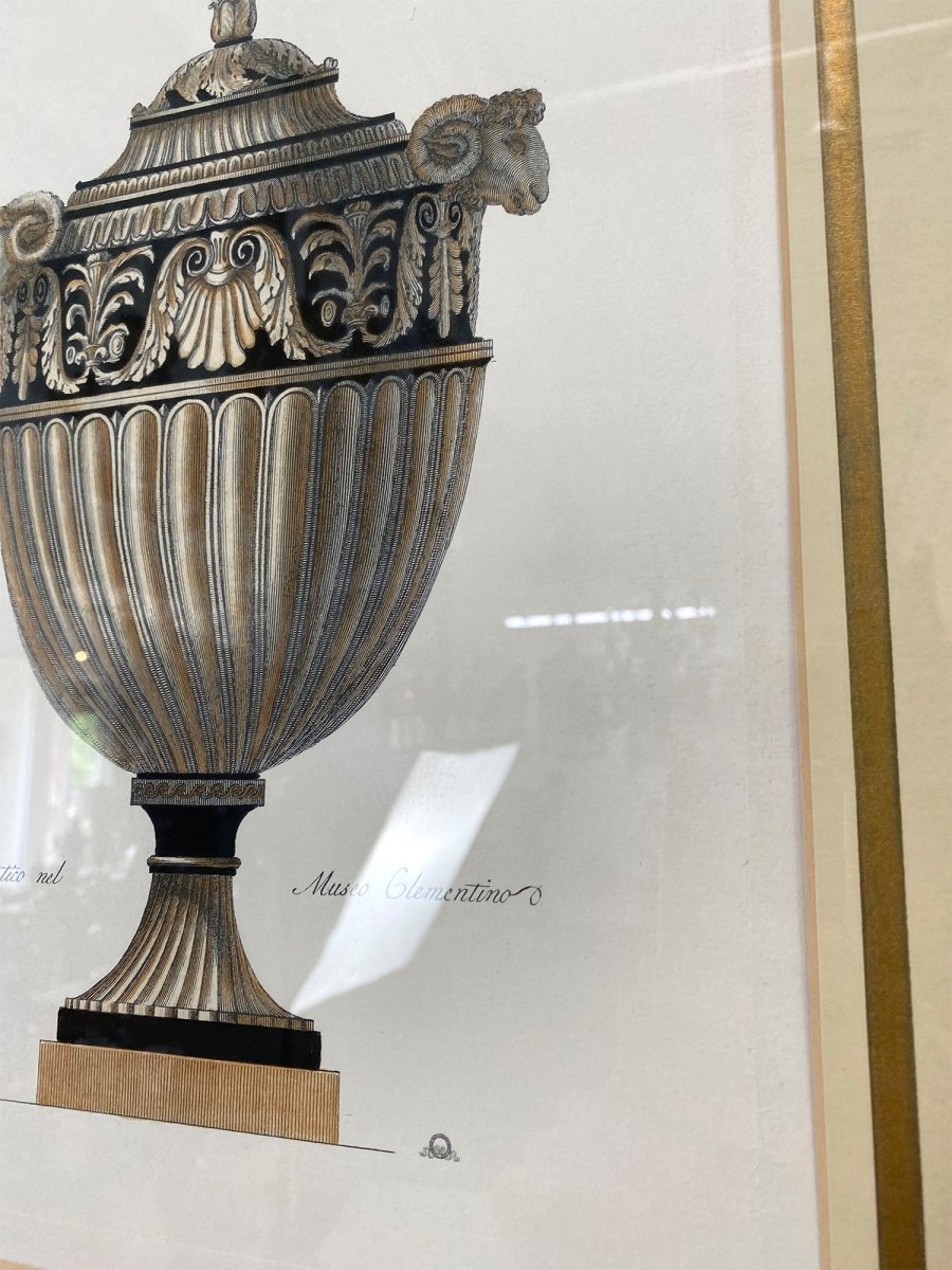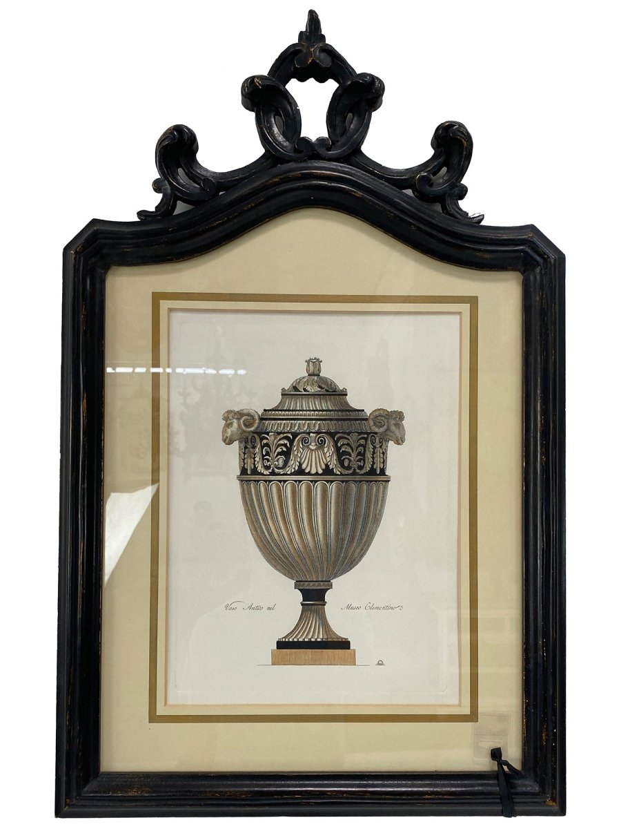 Bring timeless European elegance into your collection with this exquisite antique hand-etched engraving, Vaso Antico nel Musco Clementino. Featuring a classical urn design inspired by historic Italian artistry, with ram’s head handles, an acanthus leaf frieze, and a beautifully fluted urn body, this piece reflects refined craftsmanship and traditional decorative style.