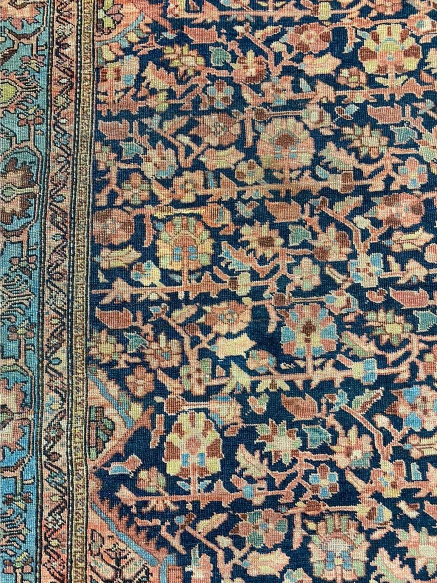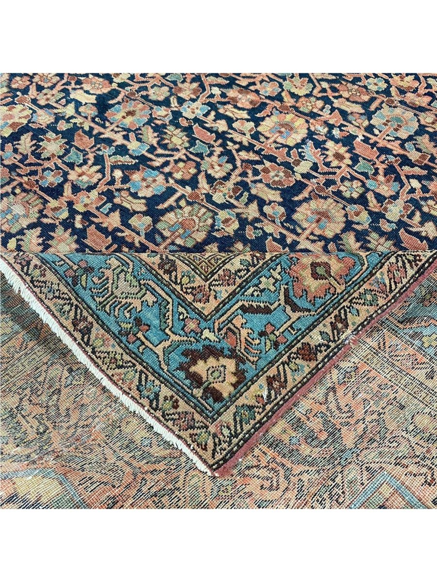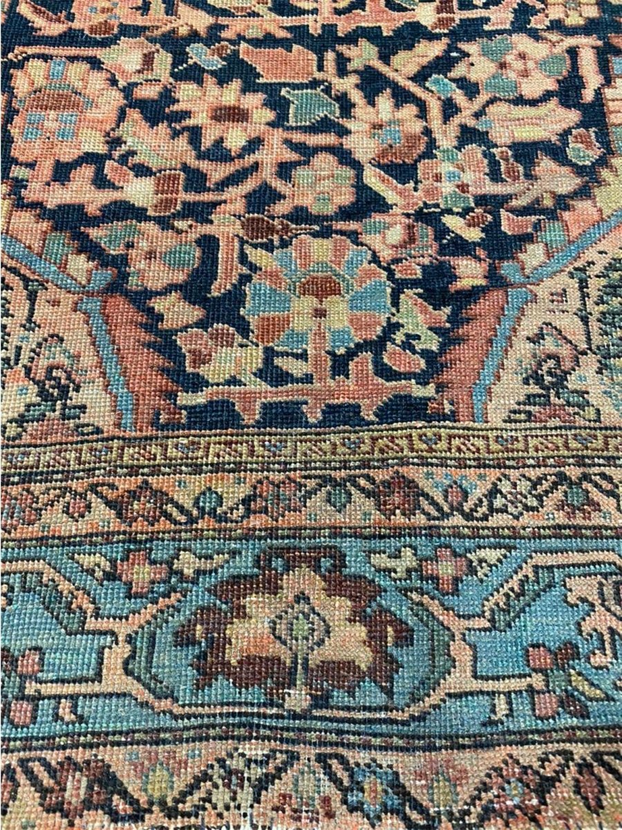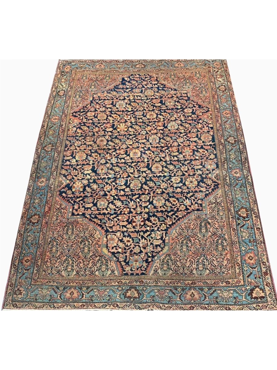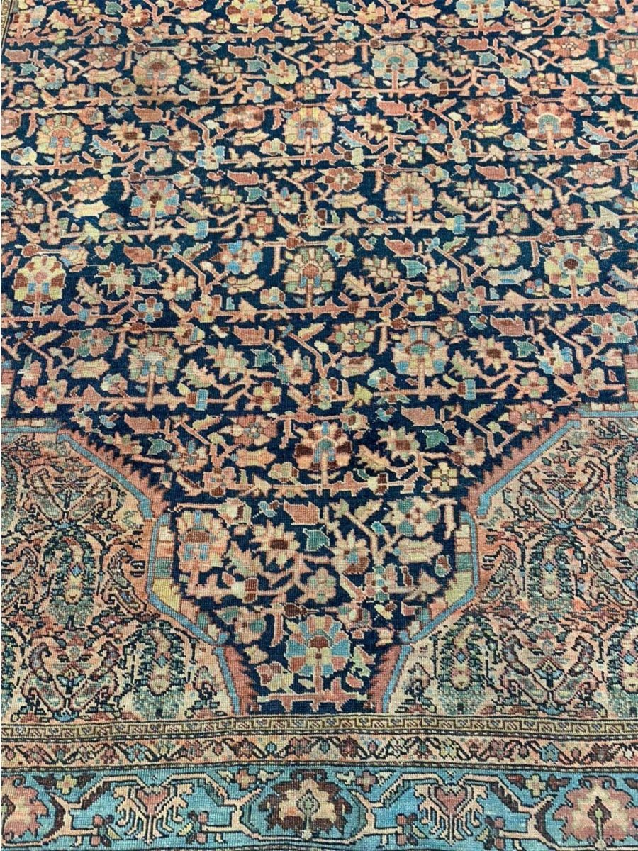 Explore the intricate artistry of this 5x6 Antique Persian Farahan area rug. Hand-knotted in Persia, this rug features a captivating all-over pattern detailed across its surface. The design features a distinctive central shape and surrounding motifs, seamlessly blending floral and geometric elements. A deep navy blue forms the background within the central area, providing a striking contrast. Surrounding areas and borders feature lighter tones, such as beige, ivory, and soft pinkish hues. The intricate pattern details incorporate a rich palette including pink, red, beige, warm gold, and serene light blue. This versatile 5x6 size fits well in various spaces, like a small living area or bedroom. This rug offers lasting beauty and a comfortable feel. Enjoy free US shipping.