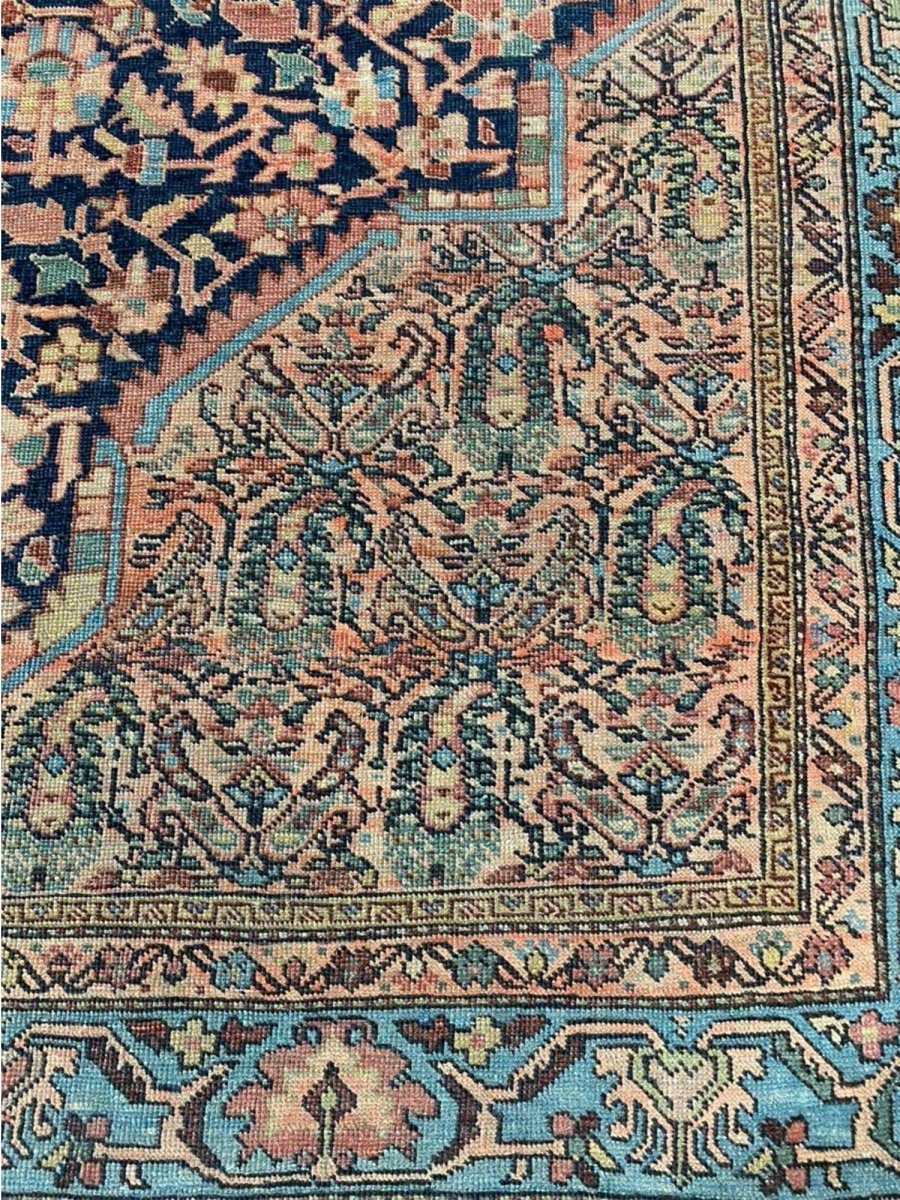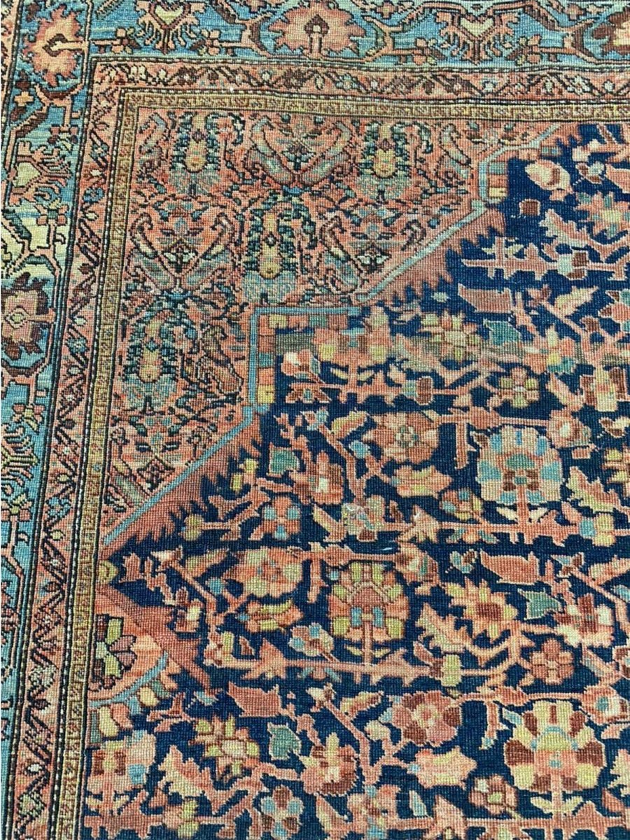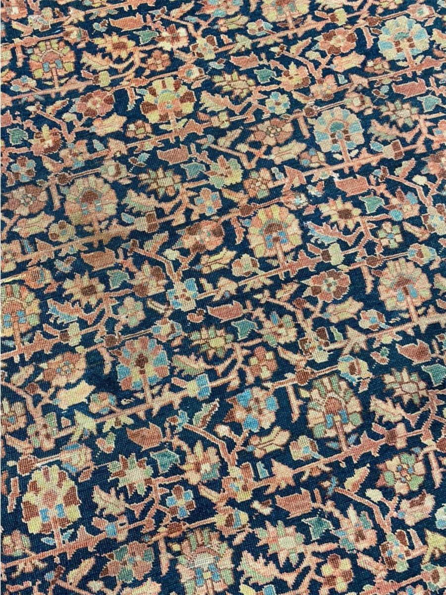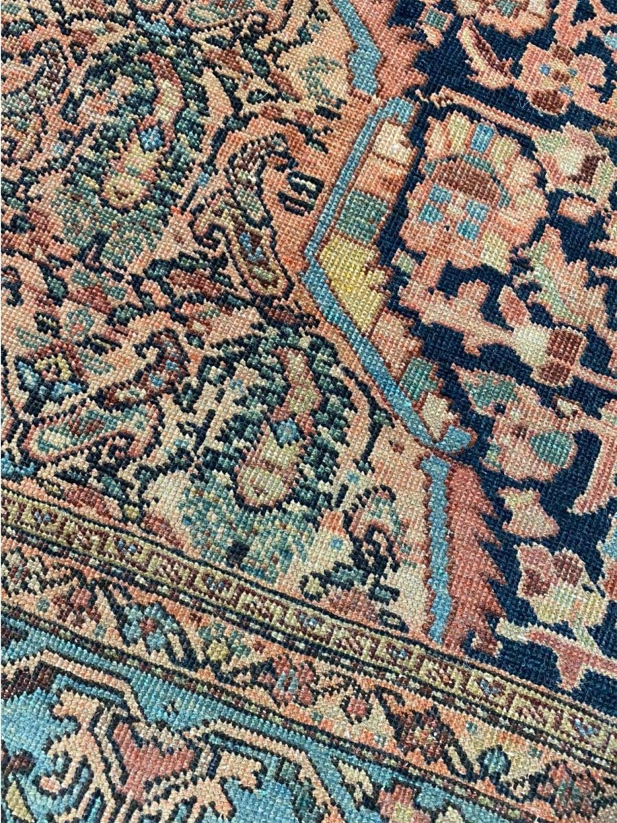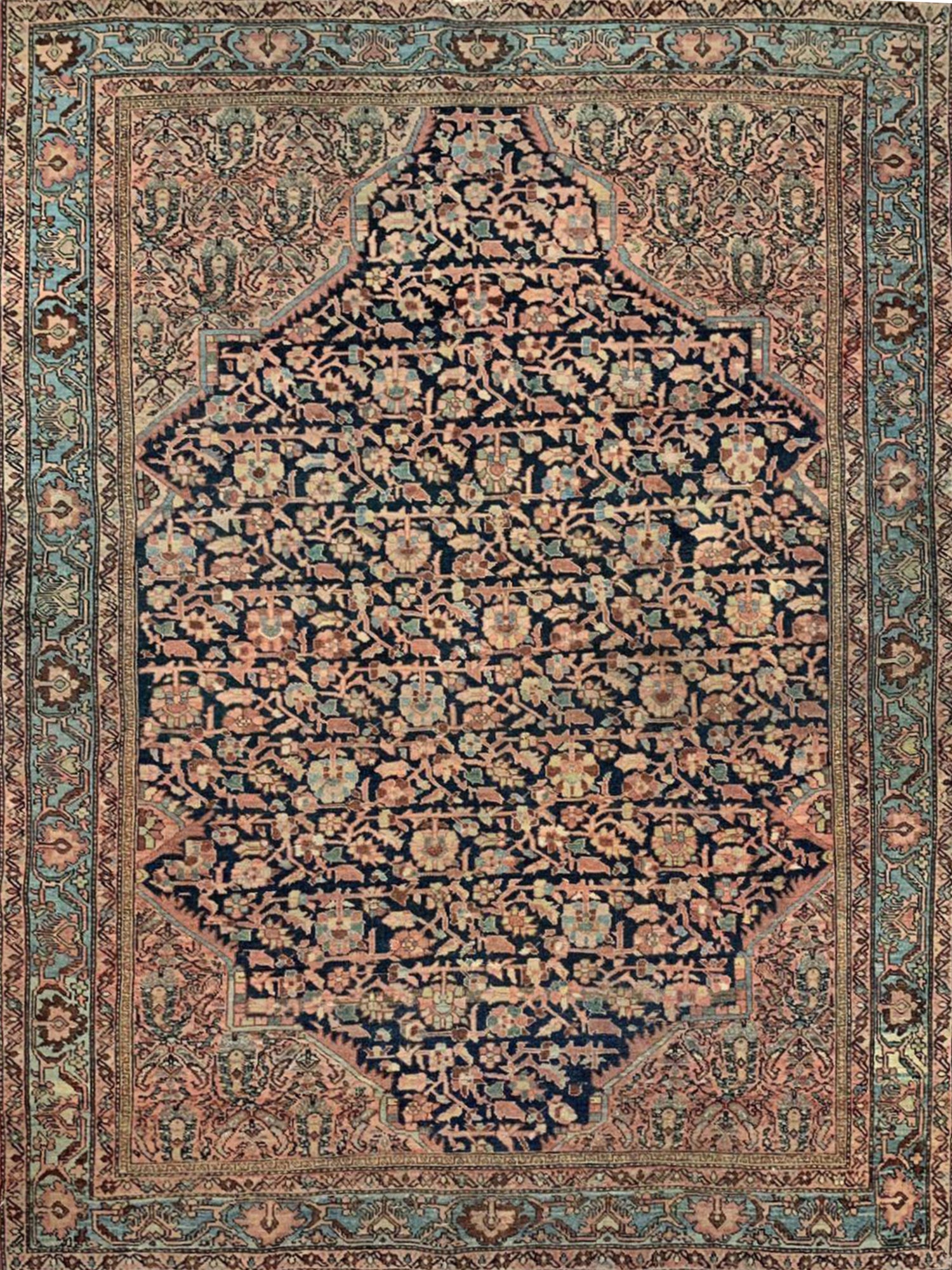 Explore the intricate artistry of this 5x6 Antique Persian Farahan area rug. Hand-knotted in Persia, this rug features a captivating all-over pattern detailed across its surface. The design features a distinctive central shape and surrounding motifs, seamlessly blending floral and geometric elements. A deep navy blue forms the background within the central area, providing a striking contrast. Surrounding areas and borders feature lighter tones, such as beige, ivory, and soft pinkish hues. The intricate pattern details incorporate a rich palette including pink, red, beige, warm gold, and serene light blue. This versatile 5x6 size fits well in various spaces, like a small living area or bedroom. This rug offers lasting beauty and a comfortable feel. Enjoy free US shipping.