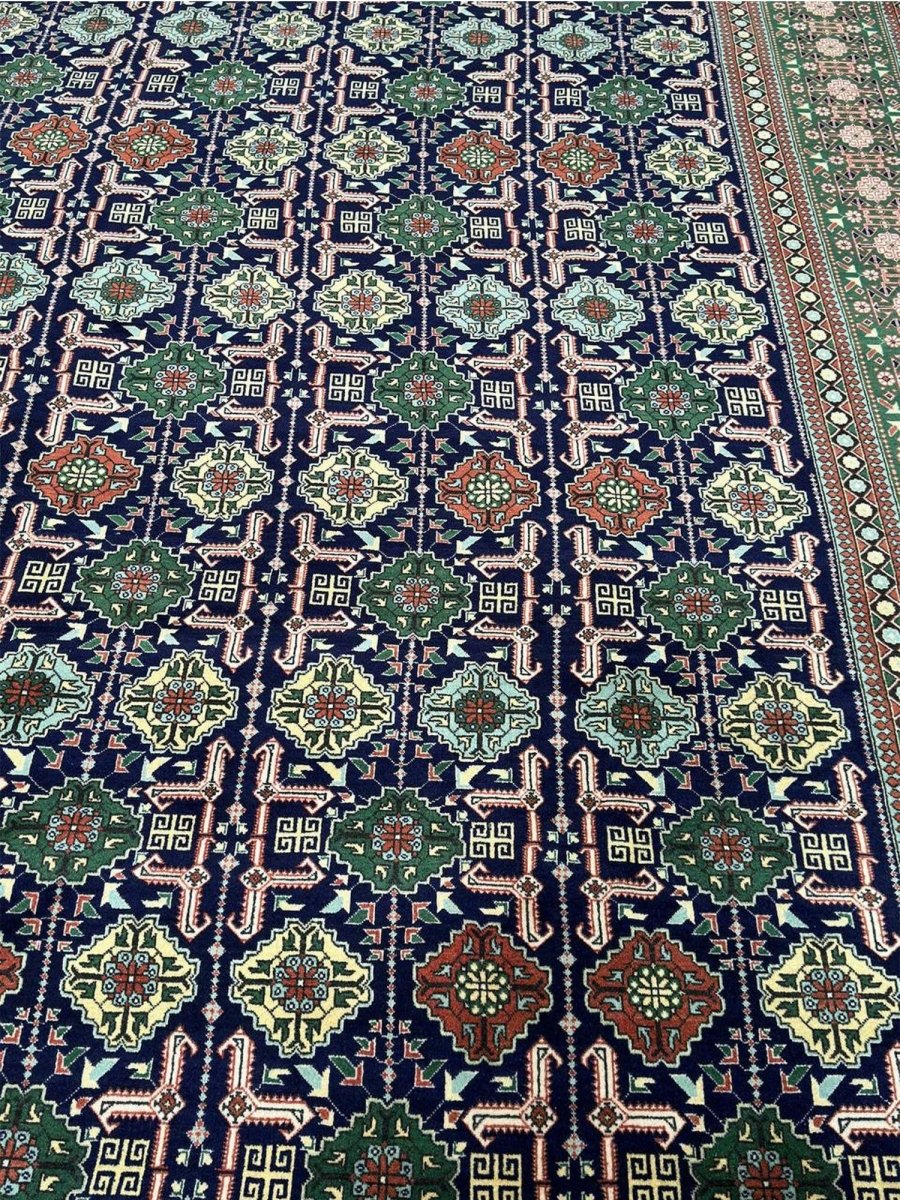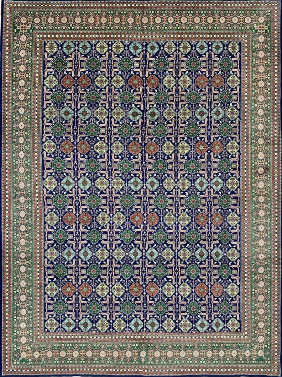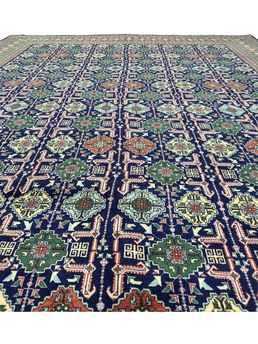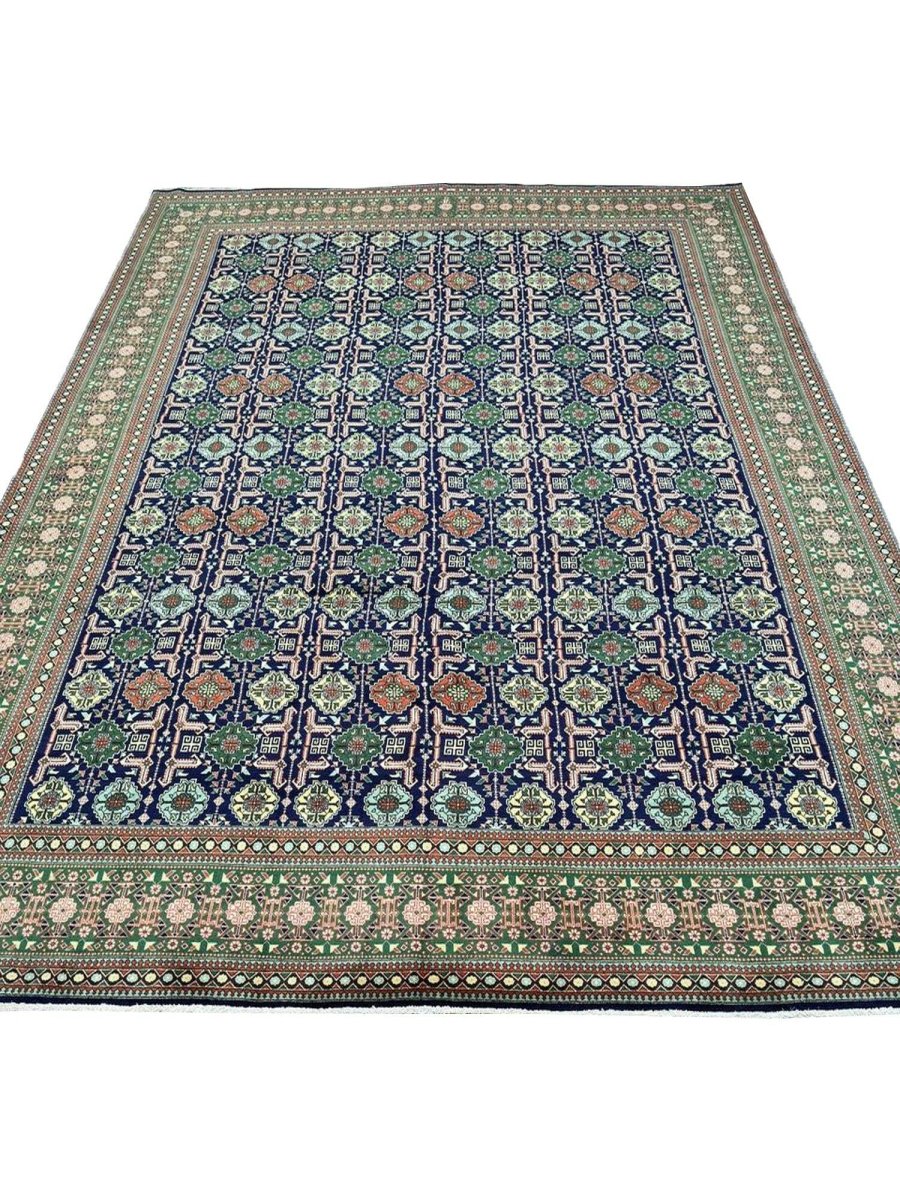 Decorate your space with the striking beauty of this 10x13 Old Persian Tabriz area rug. The magnificent rug is handmade in Persia from wool and showcases a captivating all-over pattern throughout the surface. Intricate geometric, floral motifs fill the field in a structured layout. The background presents a beautiful, deep navy blue tone, providing the classic backdrop to the design. Rich, elaborate design has a color palette of light blue, green, pink, red, yellow, and beige. This generously sized piece is perfect for anchoring spacious bedrooms, living rooms, or dining areas. Crafted with traditional hand-making techniques, this wool rug offers enduring durability and a soft touch underfoot. Enjoy the convenience of free and fast delivery within the United States.
