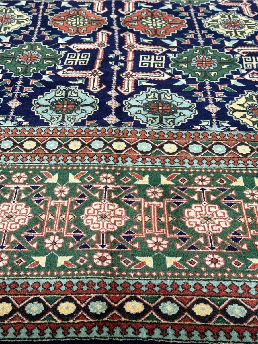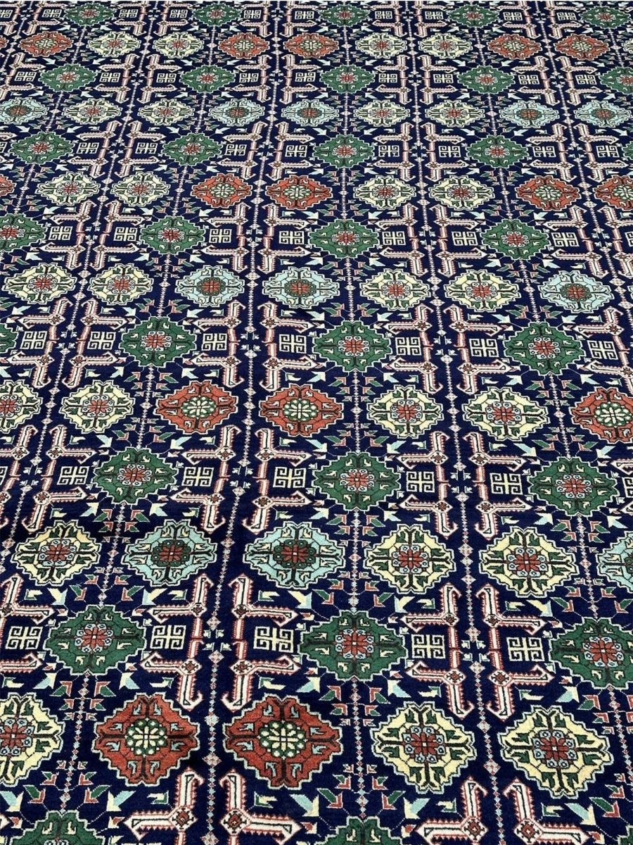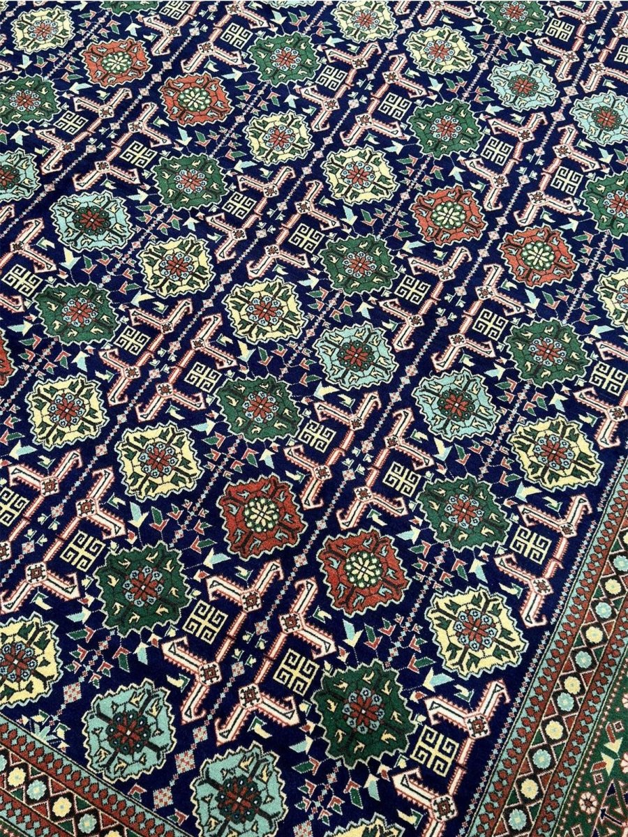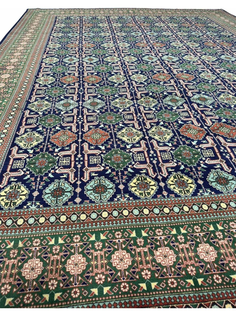 Decorate your space with the striking beauty of this 10x13 Old Persian Tabriz area rug. The magnificent rug is handmade in Persia from wool and showcases a captivating all-over pattern throughout the surface. Intricate geometric, floral motifs fill the field in a structured layout. The background presents a beautiful, deep navy blue tone, providing the classic backdrop to the design. Rich, elaborate design has a color palette of light blue, green, pink, red, yellow, and beige. This generously sized piece is perfect for anchoring spacious bedrooms, living rooms, or dining areas. Crafted with traditional hand-making techniques, this wool rug offers enduring durability and a soft touch underfoot. Enjoy the convenience of free and fast delivery within the United States.