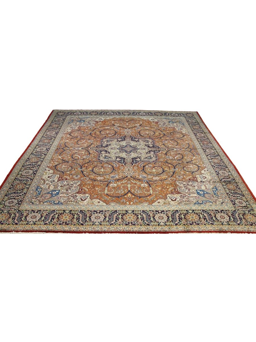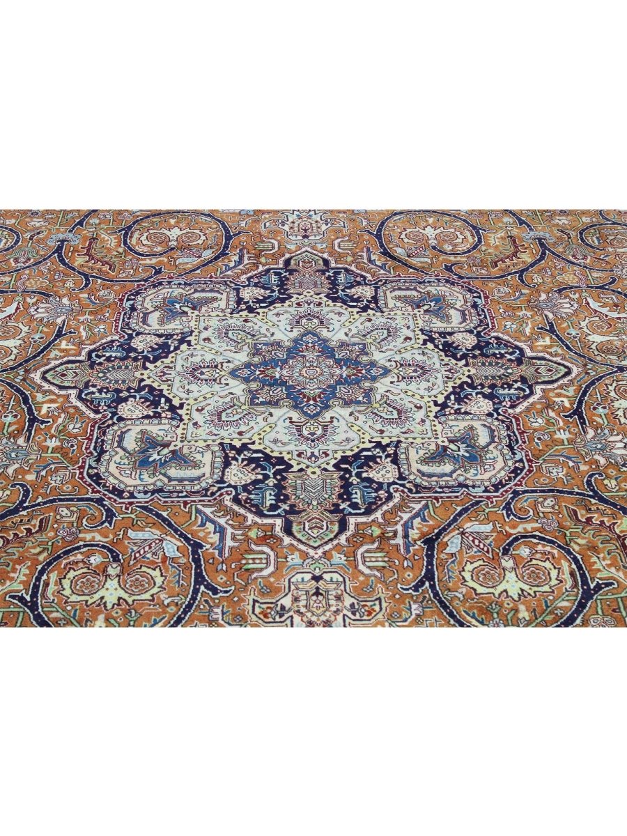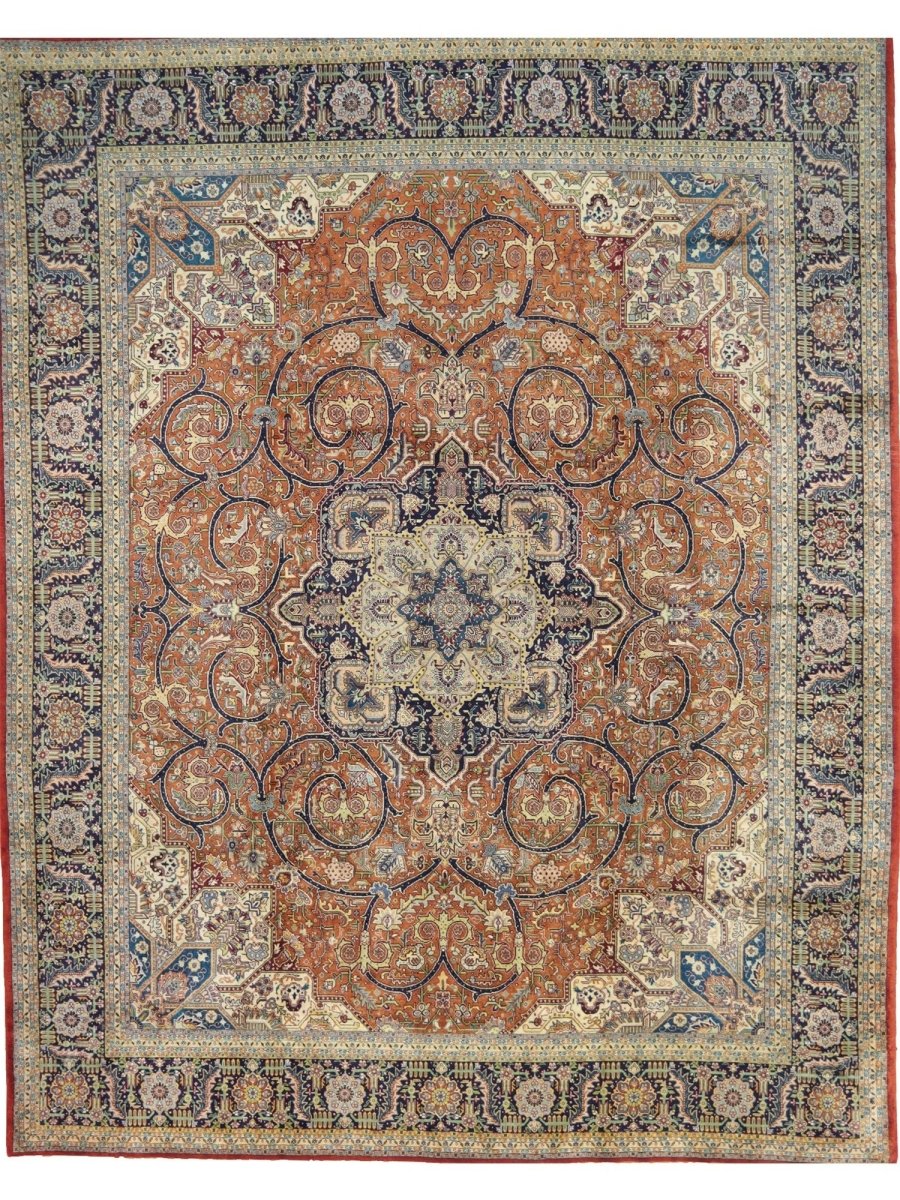 Discover the beauty of this 10x13 Old Persian Tabriz Area Rug. Handwoven in Persia, this rug showcases skilled artistry. Its generous size makes it an excellent choice for filling large spaces like living rooms, dining rooms, and even spacious bedrooms, adding a touch of traditional elegance to your decor. The central medallion pattern gives it a sophisticated and eye-catching focal point. The color palette features warm tones of rust and beige as primary colors, complemented by navy blue, light blue, and cream within the intricate floral and geometric motifs. These rich tones work together to create a vibrant and inviting ambiance. Made from durable wool, this rug is more than just a floor covering; it's a work of art that will enhance your home decor for years. Enjoy the lasting charm of a handwoven rug, plus free US shipping.