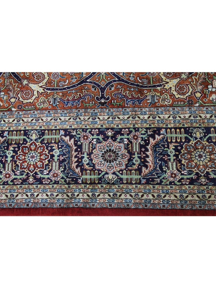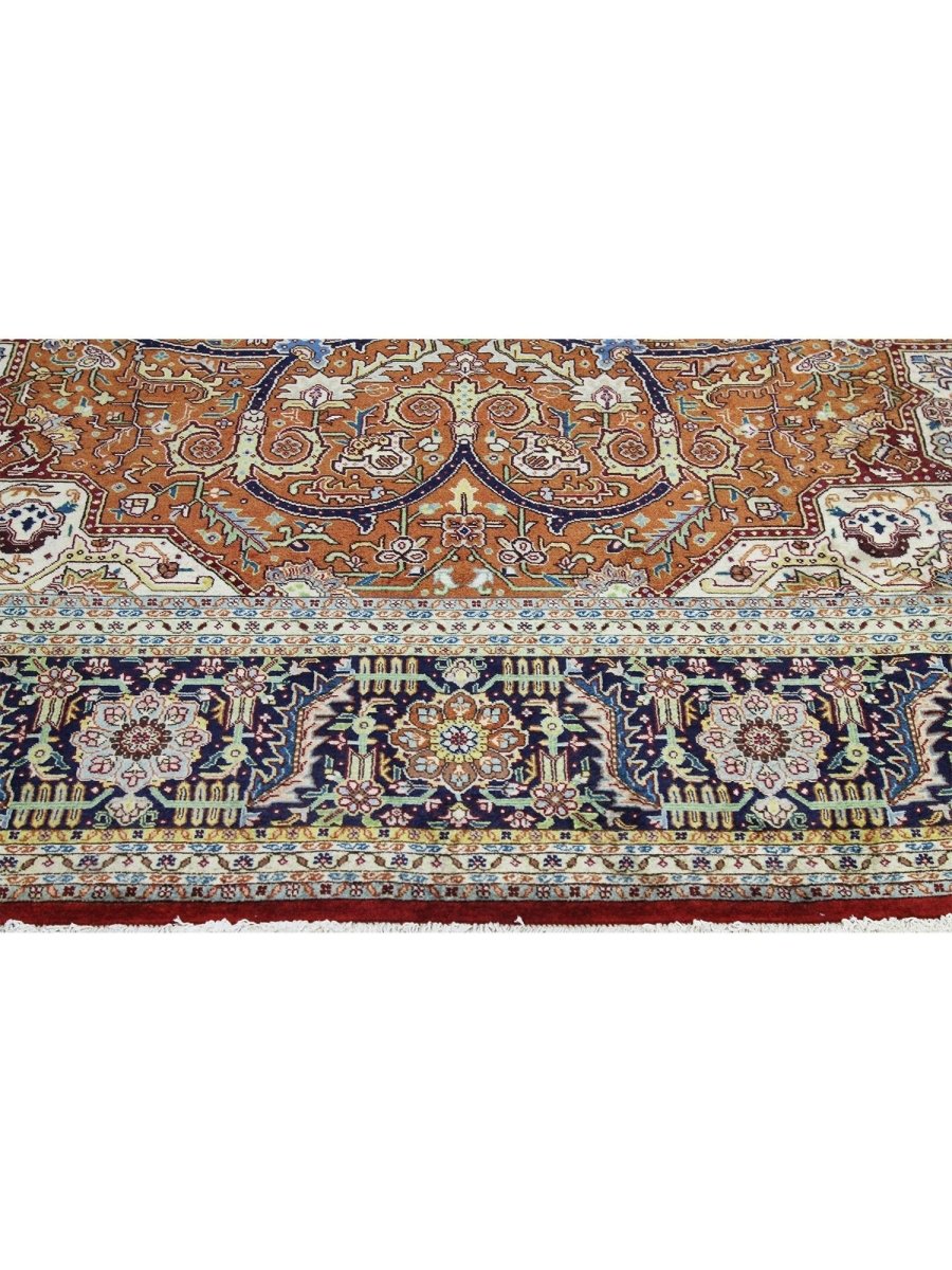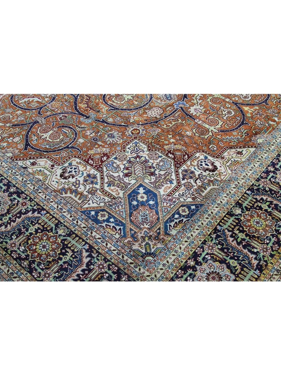 Discover the beauty of this 10x13 Old Persian Tabriz Area Rug. Handwoven in Persia, this rug showcases skilled artistry. Its generous size makes it an excellent choice for filling large spaces like living rooms, dining rooms, and even spacious bedrooms, adding a touch of traditional elegance to your decor. The central medallion pattern gives it a sophisticated and eye-catching focal point. The color palette features warm tones of rust and beige as primary colors, complemented by navy blue, light blue, and cream within the intricate floral and geometric motifs. These rich tones work together to create a vibrant and inviting ambiance. Made from durable wool, this rug is more than just a floor covering; it's a work of art that will enhance your home decor for years. Enjoy the lasting charm of a handwoven rug, plus free US shipping.