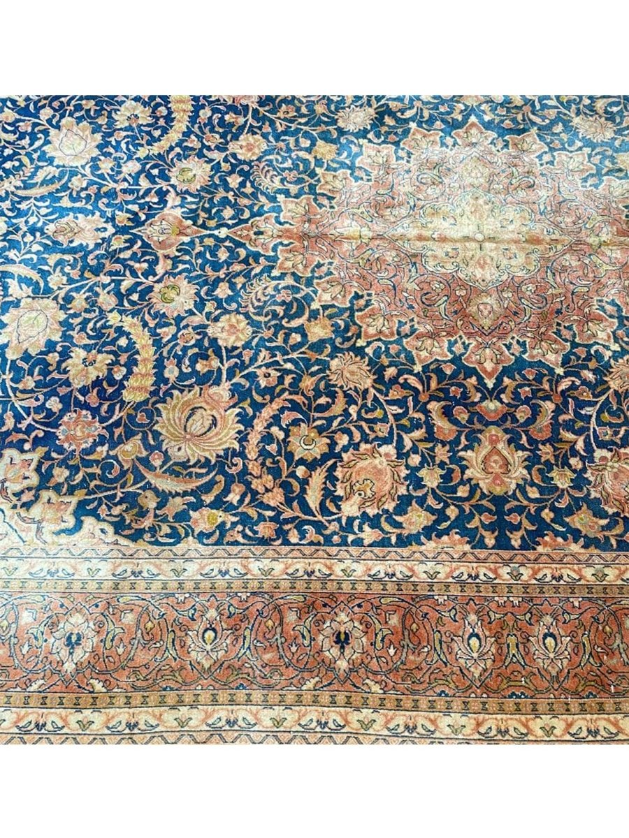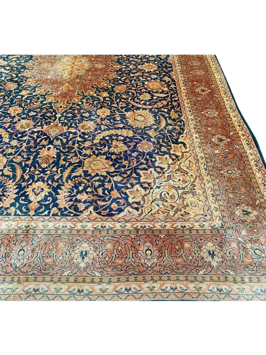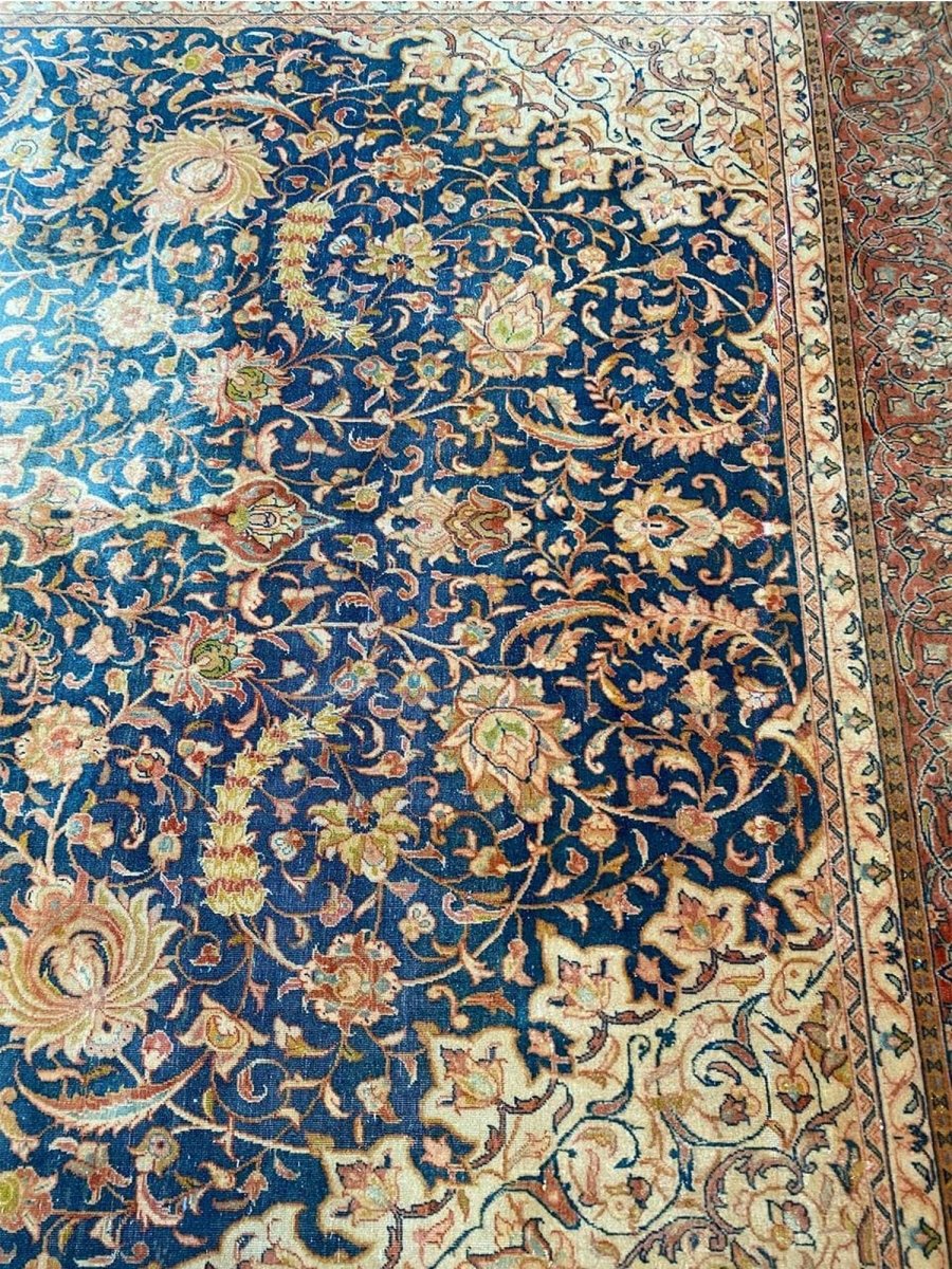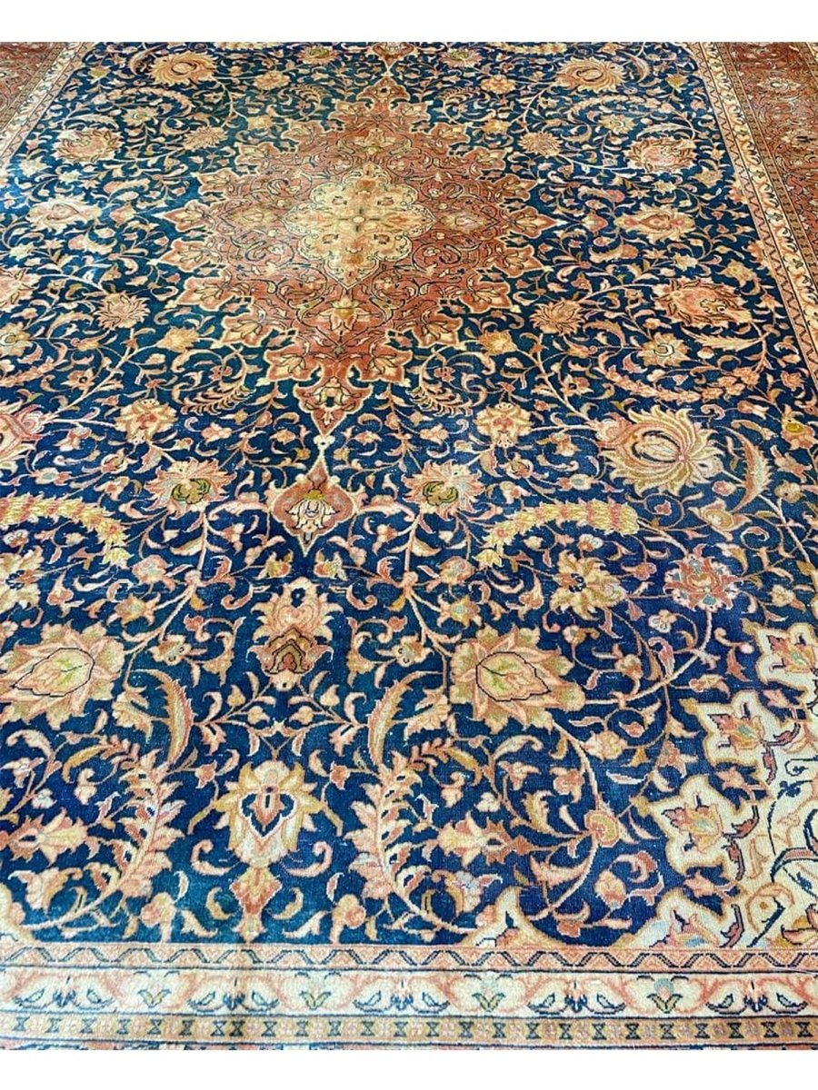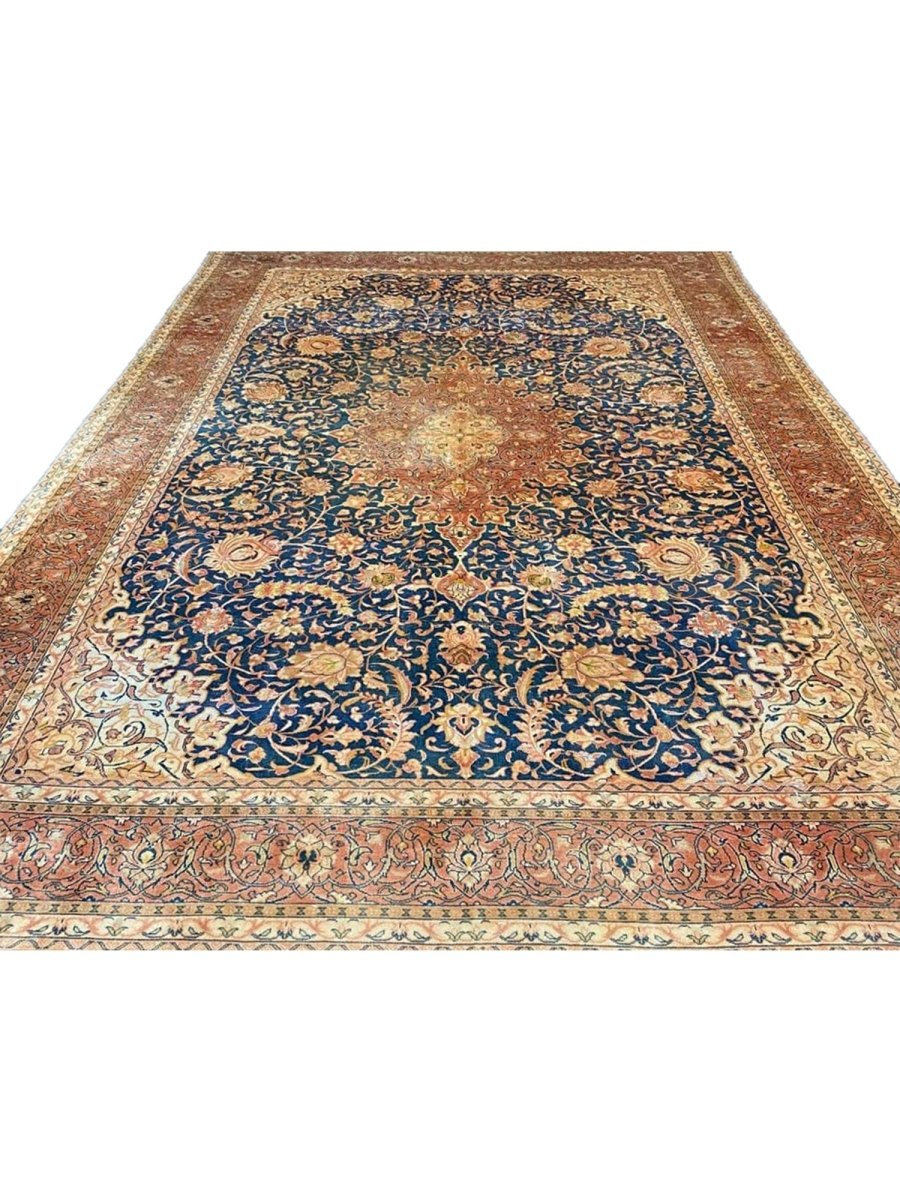This beautiful Antique Persian Tabriz rug showcases a graceful interplay of deep blue, deep red, light beige, and gold accents. The intricate central medallion is surrounded by dense floral motifs and vine patterns, creating an enchanting visual harmony. Hand-knotted with care using premium wool, it offers durability and a comfortable underfoot experience, ideal for formal and casual living spaces. Its gently faded nature adds authenticity and charm, gracefully reflecting its rich Persian heritage. With sophisticated artistry and meticulous detailing, this rug is perfect for enhancing the elegance of a spacious living room, dining area, or large bedroom, effortlessly complementing classical and traditional decor styles. A timeless addition to your home, this rug embodies beauty, culture, and warmth. Shop and get free shipping in the United States.