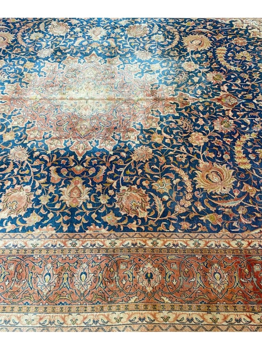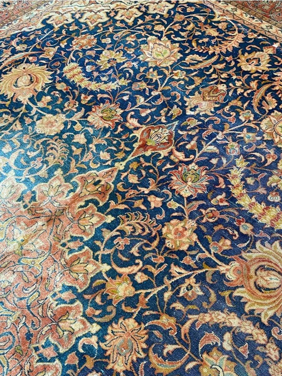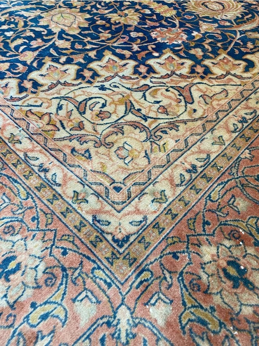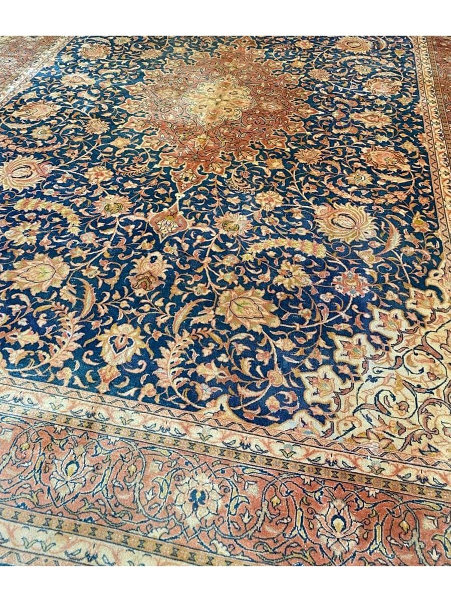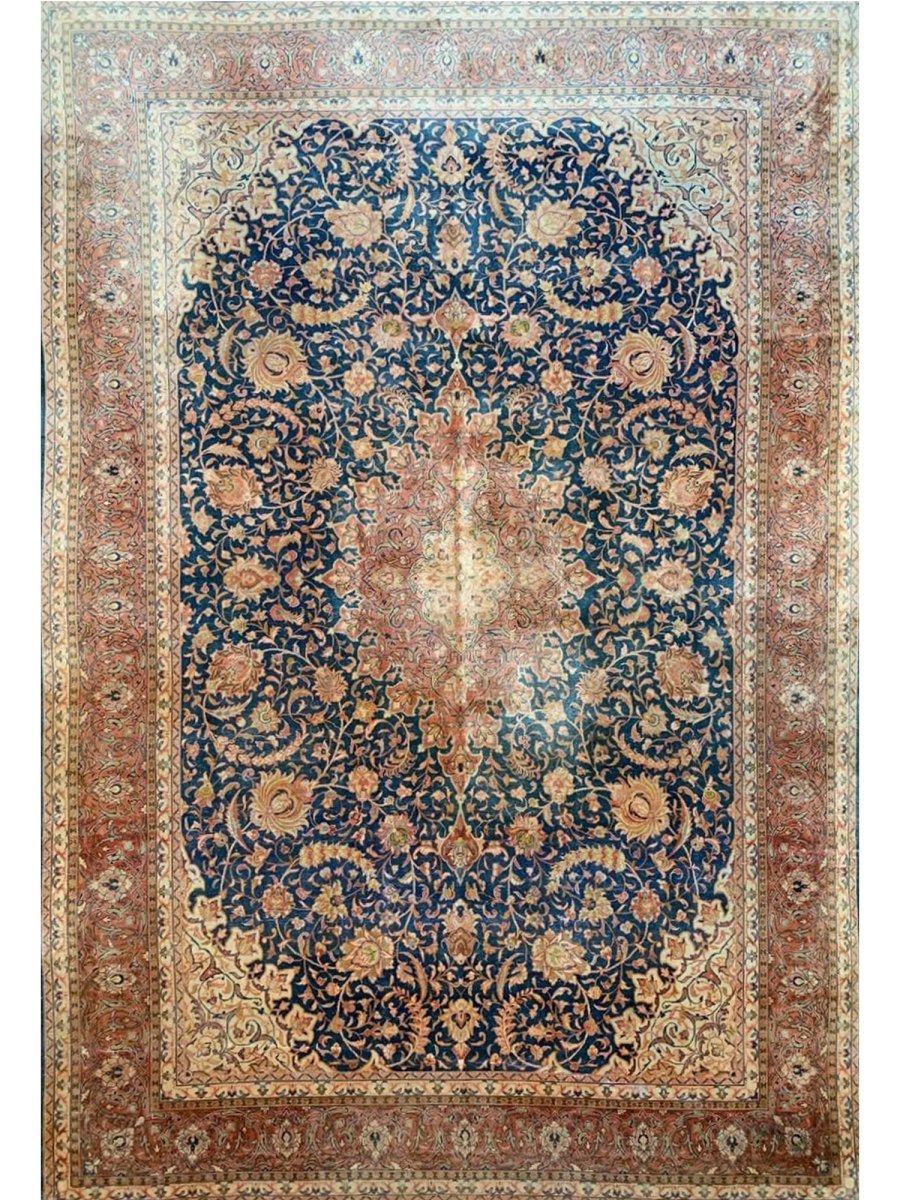 This beautiful Antique Persian Tabriz rug showcases a graceful interplay of deep blue, deep red, light beige, and gold accents. The intricate central medallion is surrounded by dense floral motifs and vine patterns, creating an enchanting visual harmony. Hand-knotted with care using premium wool, it offers durability and a comfortable underfoot experience, ideal for formal and casual living spaces. Its gently faded nature adds authenticity and charm, gracefully reflecting its rich Persian heritage. With sophisticated artistry and meticulous detailing, this rug is perfect for enhancing the elegance of a spacious living room, dining area, or large bedroom, effortlessly complementing classical and traditional decor styles. A timeless addition to your home, this rug embodies beauty, culture, and warmth. Shop and get free shipping in the United States.