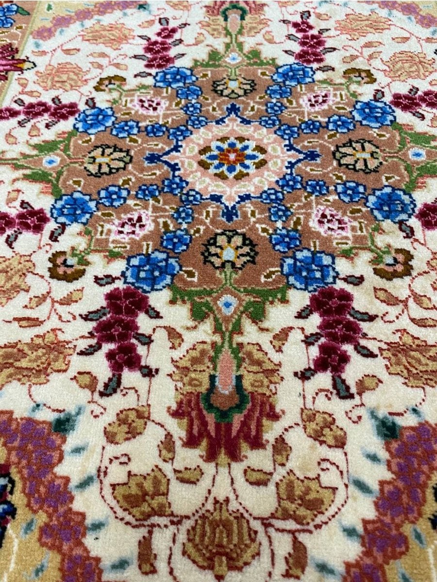 Experience the epitome of Persian rug craftsmanship with this exquisite 2x2 old Persian Tabriz area rug. Originating from Persia, this rug is a true work of art, featuring a beautiful hand-knotted construction that showcases the skill and expertise of the artisan. The combination of wool and natural silk gives this rug a luxurious feel, while the beige, brown, blue, and red colors add a touch of vibrancy and energy to any room. As an antique piece, this rug has a unique medallion design that's been developed over time, making it a truly special addition to your home decor. Whether you're looking to add a touch of elegance to your entryways, kitchen, or create a cozy and inviting atmosphere in your bedroom, this rug is sure to impress. The intricate details and beautiful colors of this rug make it a great choice for rooms that need a pop of color and energy.