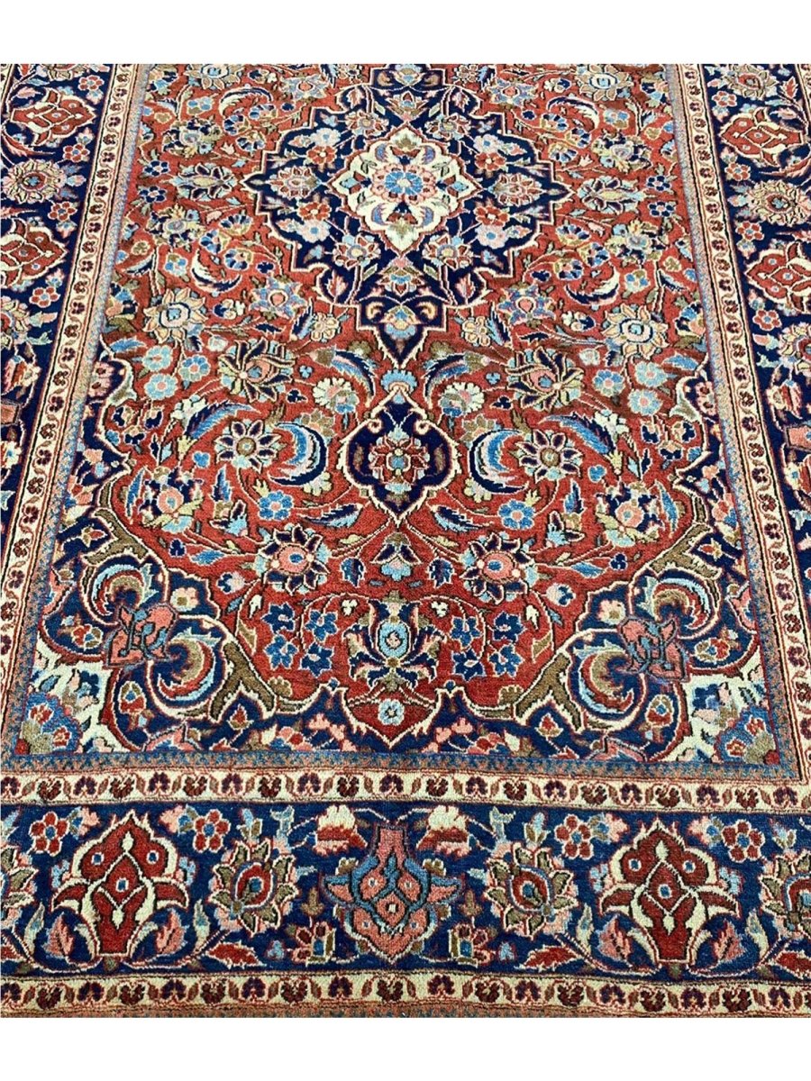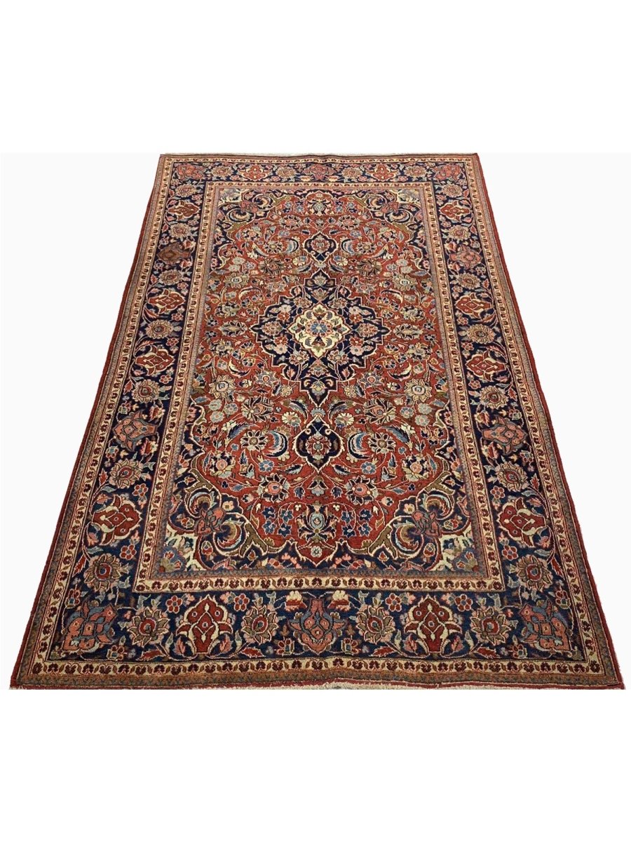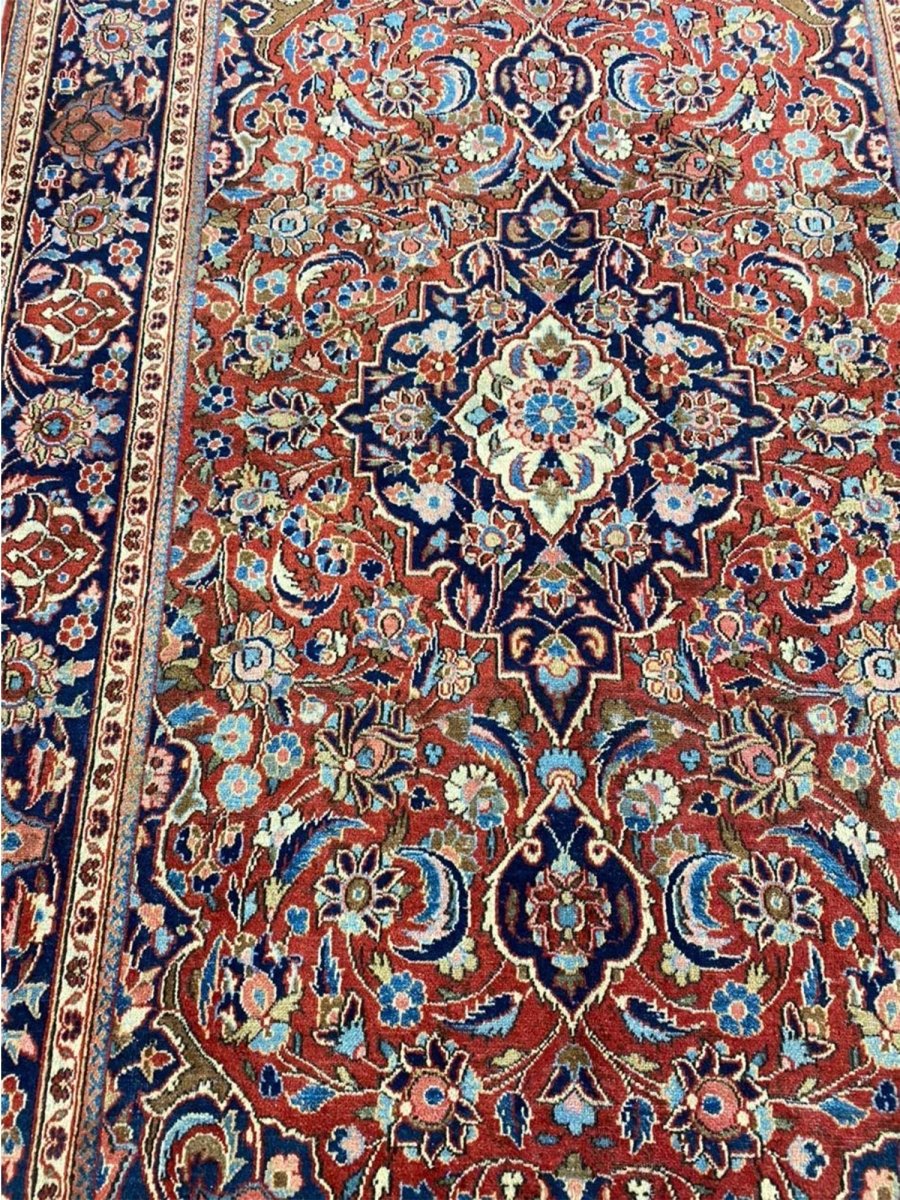 Hand-knotted in Persia, this 4x7 Old Persian Kashan rug offers a captivating blend of tradition and artistry. The intricate floral pattern radiates from a distinguished central medallion, showcasing a rich color palette of deep red, navy blue, and earthy tones. Crafted from fine wool, this rug offers both durability and a plush texture underfoot. The floral motifs and symmetrical medallion create a sense of balance and elegance, making it a timeless piece for small living rooms, offices, or formal dining areas. Its compact size allows it to bring warmth and character to more intimate spaces. Every detail reflects generations of skilled craftsmanship. Free shipping is available across the US.