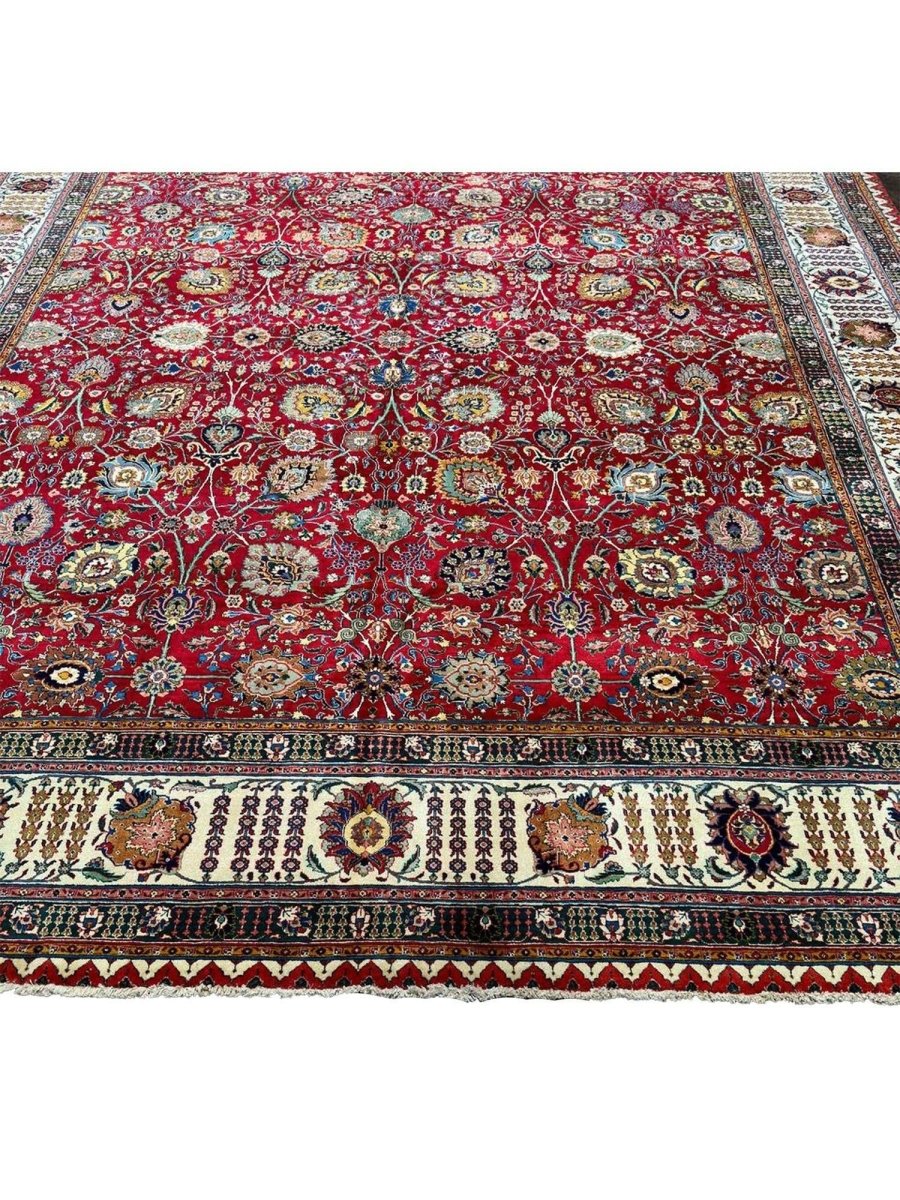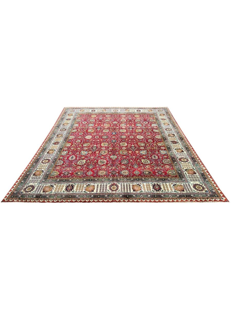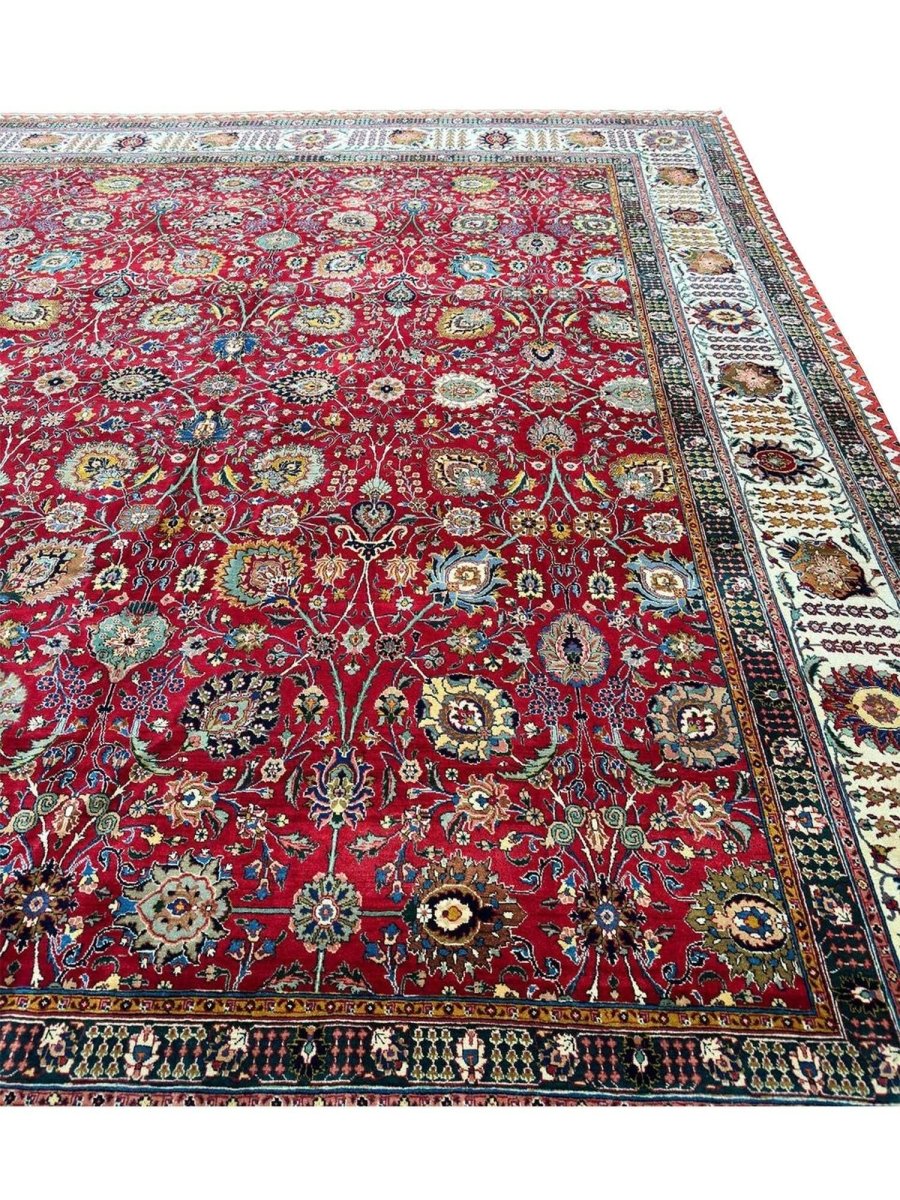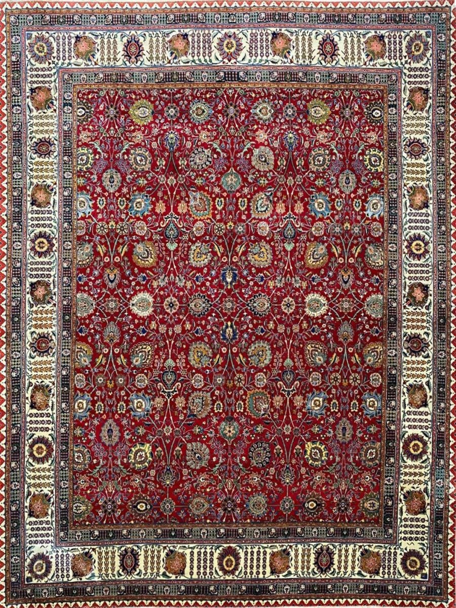Decorate your space with the stunning beauty of this 11x13 Old Persian Tabriz area rug. Handmade in Persia from wool, this magnificent rug features a captivating all-over pattern throughout its surface. Intricate floral motifs fill the field, creating a rich visual landscape. The background presents a beautiful, deep red tone, providing the classic backdrop for design. The rich, elaborate design features a color palette of blue, light blue, warm beige, gold, and brown. This generously sized piece is perfect for anchoring spacious bedrooms, living rooms, or dining areas. Crafted with traditional hand-making techniques, this wool rug offers enduring durability and a soft touch underfoot. Enjoy the convenience of free and fast delivery within the United States.