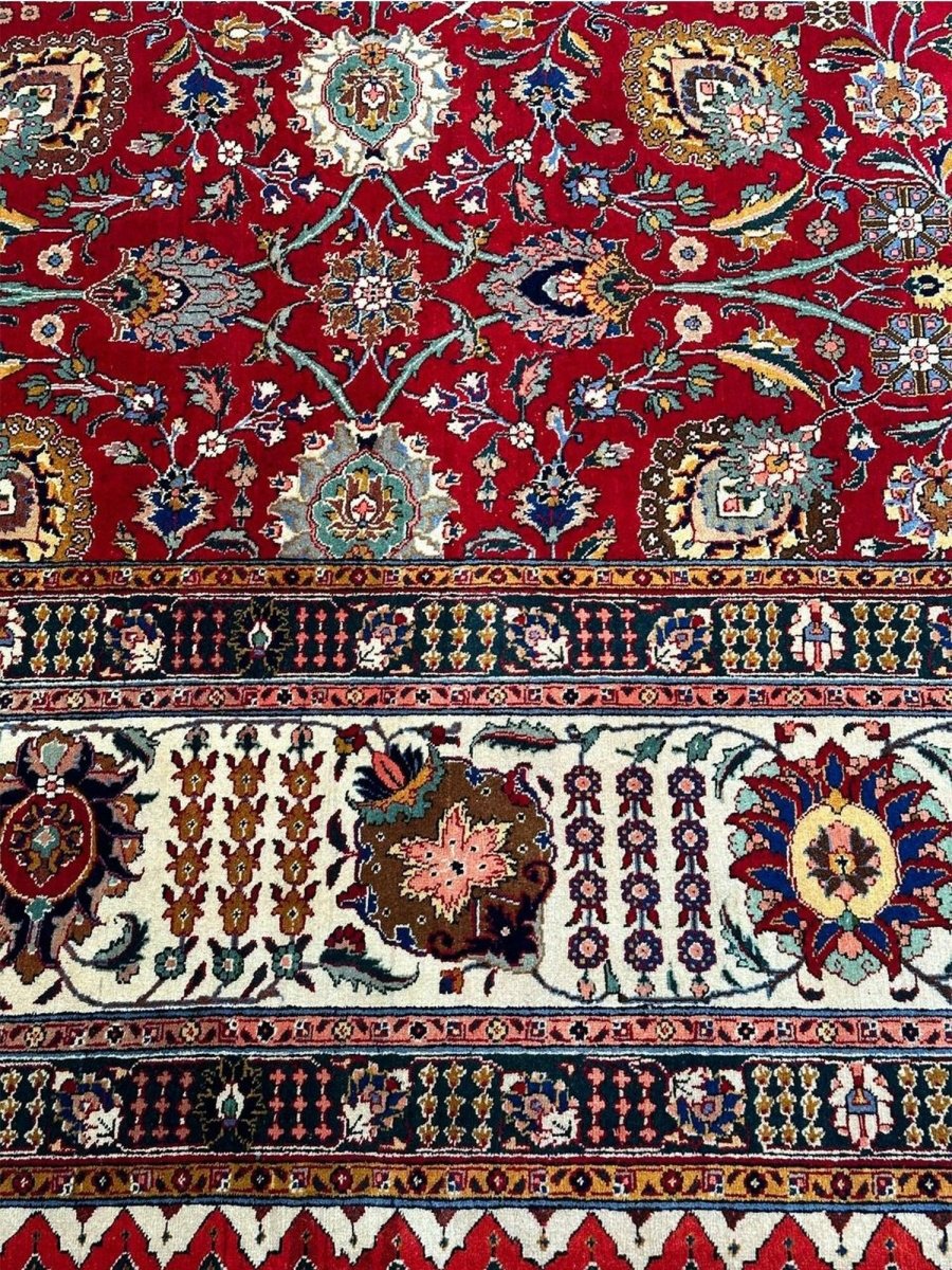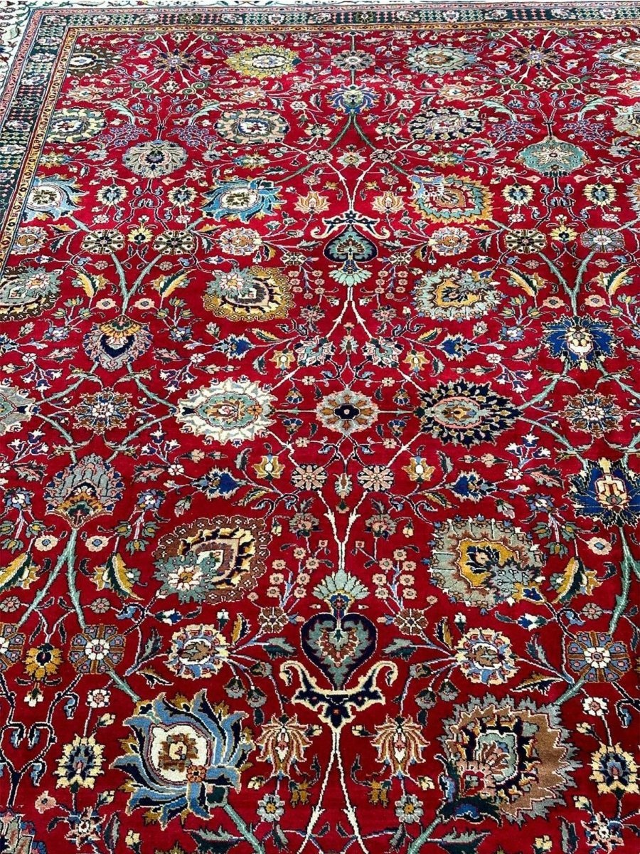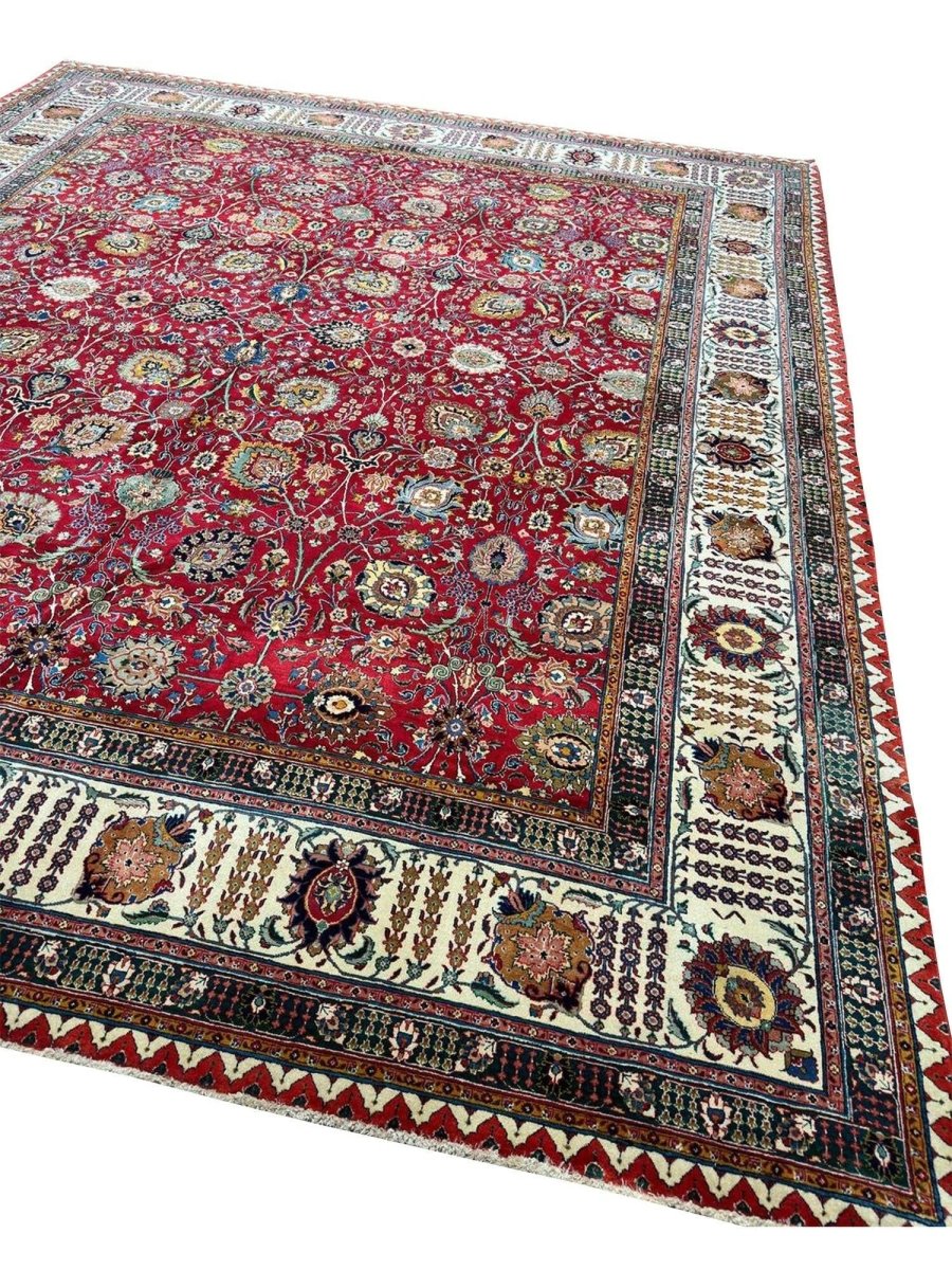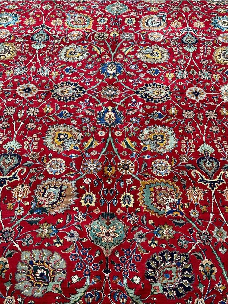 Decorate your space with the stunning beauty of this 11x13 Old Persian Tabriz area rug. Handmade in Persia from wool, this magnificent rug features a captivating all-over pattern throughout its surface. Intricate floral motifs fill the field, creating a rich visual landscape. The background presents a beautiful, deep red tone, providing the classic backdrop for design. The rich, elaborate design features a color palette of blue, light blue, warm beige, gold, and brown. This generously sized piece is perfect for anchoring spacious bedrooms, living rooms, or dining areas. Crafted with traditional hand-making techniques, this wool rug offers enduring durability and a soft touch underfoot. Enjoy the convenience of free and fast delivery within the United States.