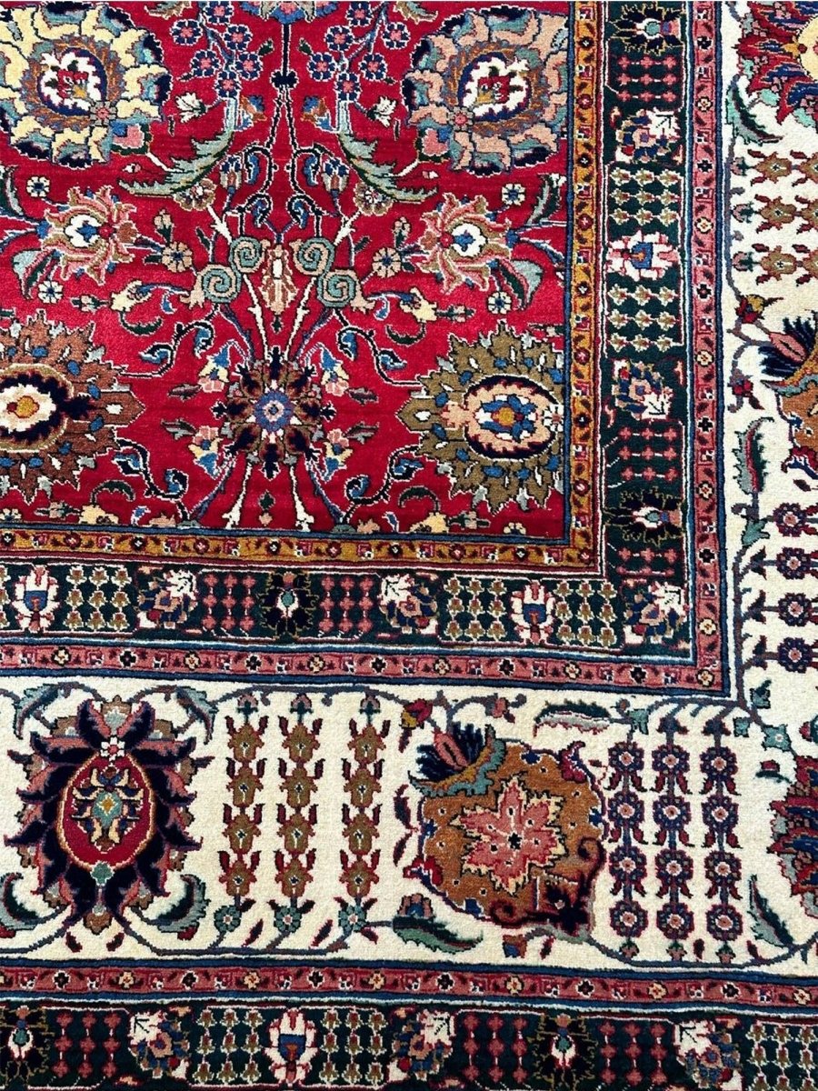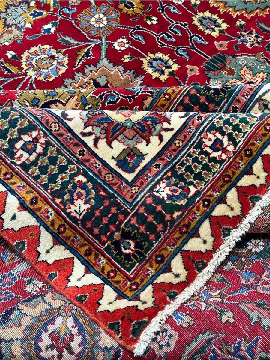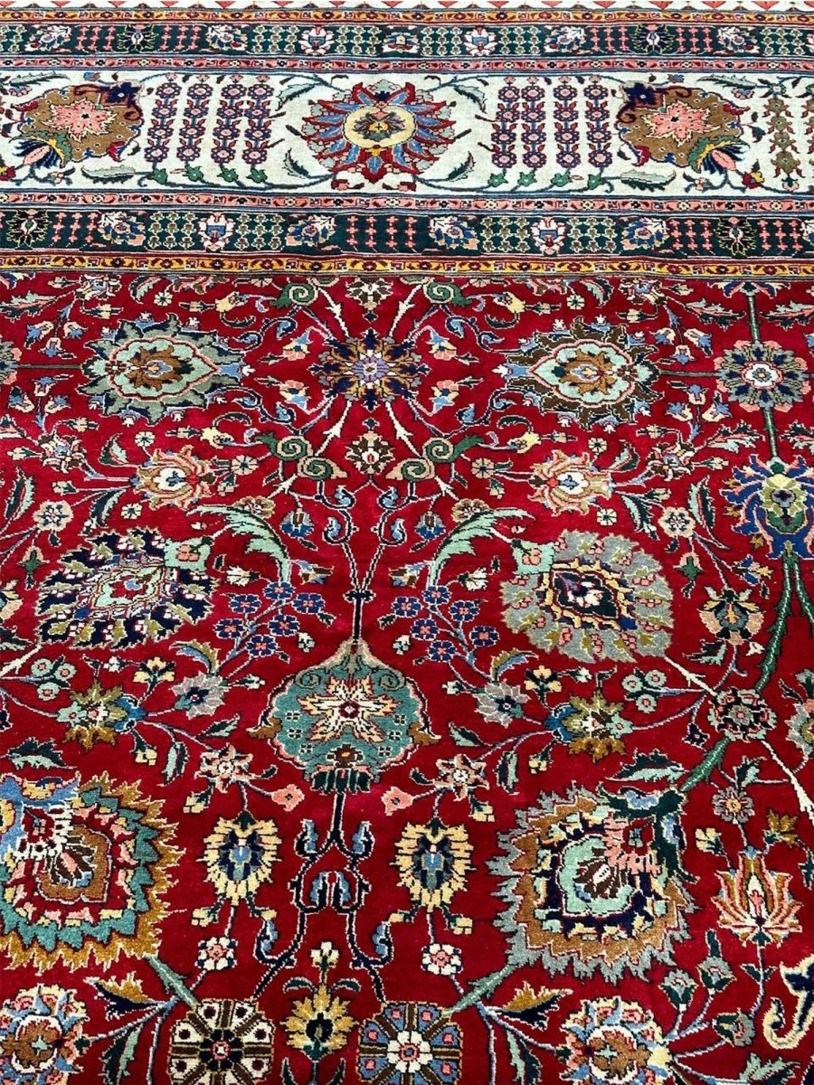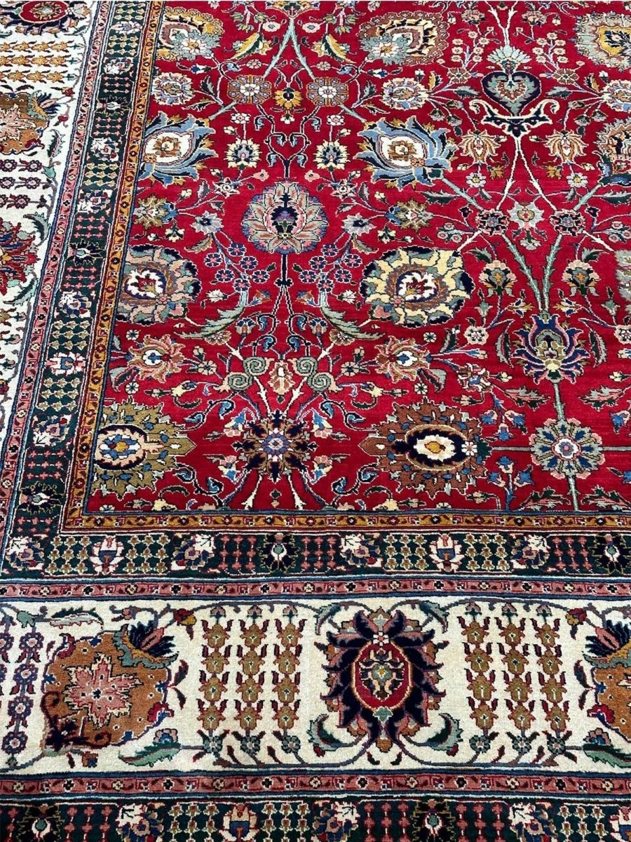 Decorate your space with the stunning beauty of this 11x13 Old Persian Tabriz area rug. Handmade in Persia from wool, this magnificent rug features a captivating all-over pattern throughout its surface. Intricate floral motifs fill the field, creating a rich visual landscape. The background presents a beautiful, deep red tone, providing the classic backdrop for design. The rich, elaborate design features a color palette of blue, light blue, warm beige, gold, and brown. This generously sized piece is perfect for anchoring spacious bedrooms, living rooms, or dining areas. Crafted with traditional hand-making techniques, this wool rug offers enduring durability and a soft touch underfoot. Enjoy the convenience of free and fast delivery within the United States.