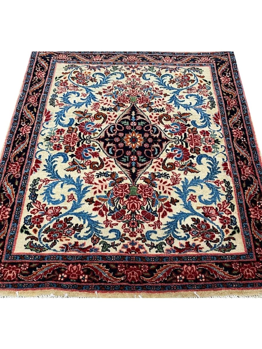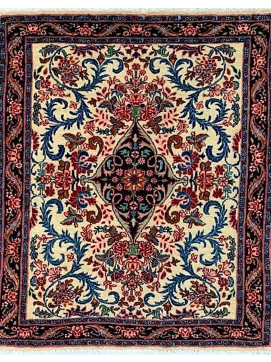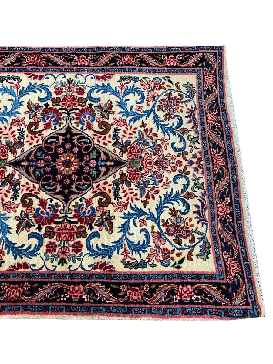 Hand-knotted in Persia with a sturdy weave, this beautiful 2x3 Old Persian Bijar rug offers lasting beauty and artistry. The bold medallion pattern is detailed, showcasing its primary colors. Crafted from durable wool, this rug features an ivory field with patterns primarily in red and blue. The floral motifs give it an elegant touch. Its small size and classic design make it a perfect accent piece for entryways, beside a chair, or layered in a room. This antique rug brings traditional charm and resilience to any small space. Enjoy the convenience of free US shipping.
