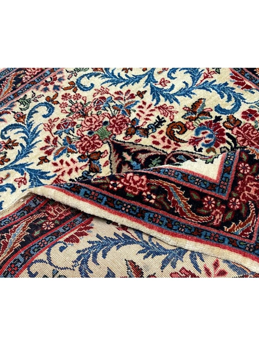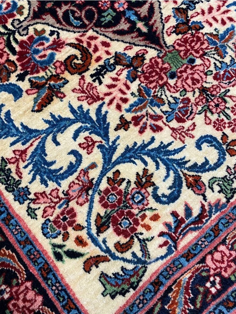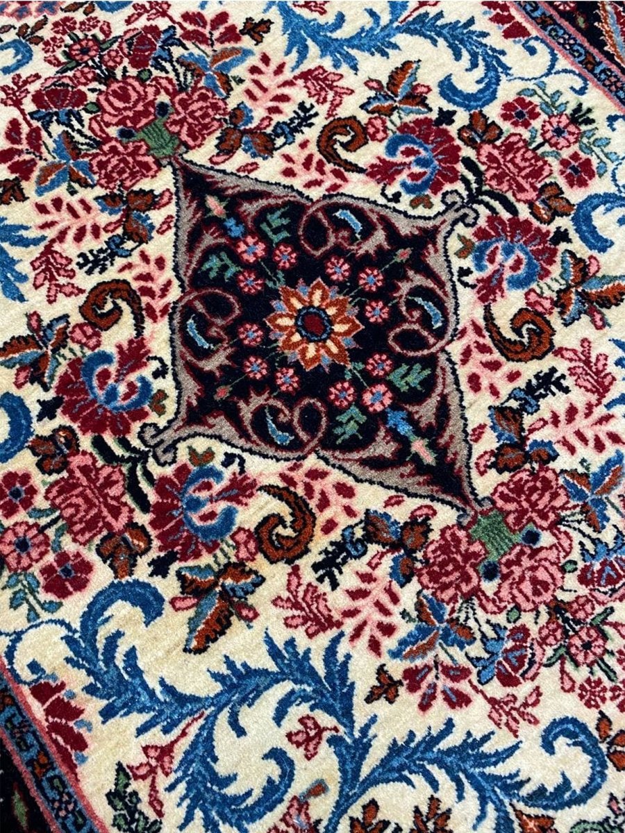 Hand-knotted in Persia with a sturdy weave, this beautiful 2x3 Old Persian Bijar rug offers lasting beauty and artistry. The bold medallion pattern is detailed, showcasing its primary colors. Crafted from durable wool, this rug features an ivory field with patterns primarily in red and blue. The floral motifs give it an elegant touch. Its small size and classic design make it a perfect accent piece for entryways, beside a chair, or layered in a room. This antique rug brings traditional charm and resilience to any small space. Enjoy the convenience of free US shipping.