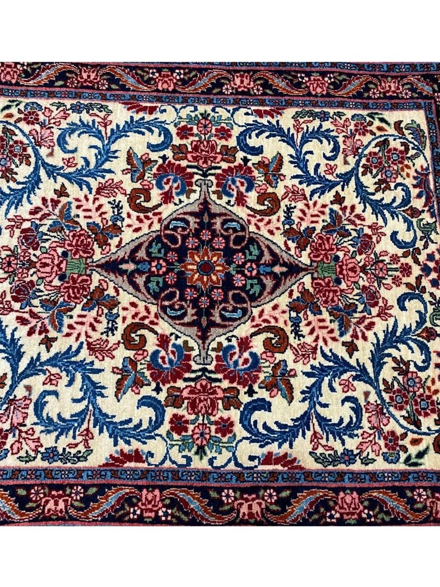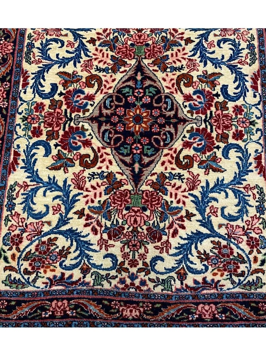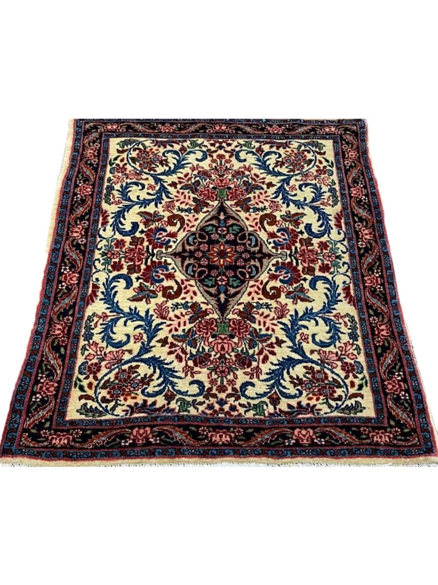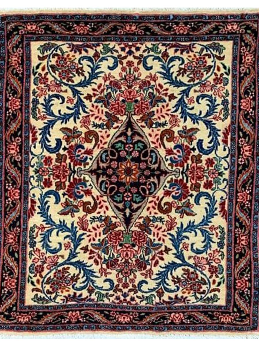 Hand-knotted in Persia with a sturdy weave, this beautiful 2x3 Old Persian Bijar rug offers lasting beauty and artistry. The bold medallion floral pattern is detailed, showcasing its main colors. Crafted from durable wool, this rug features an ivory field with patterns primarily in red and blue. Its small size and classic design make it a perfect accent piece for entryways, beside a chair, or layered in a room. This antique rug brings traditional charm and resilience to any small space. Enjoy the convenience of free US shipping.
